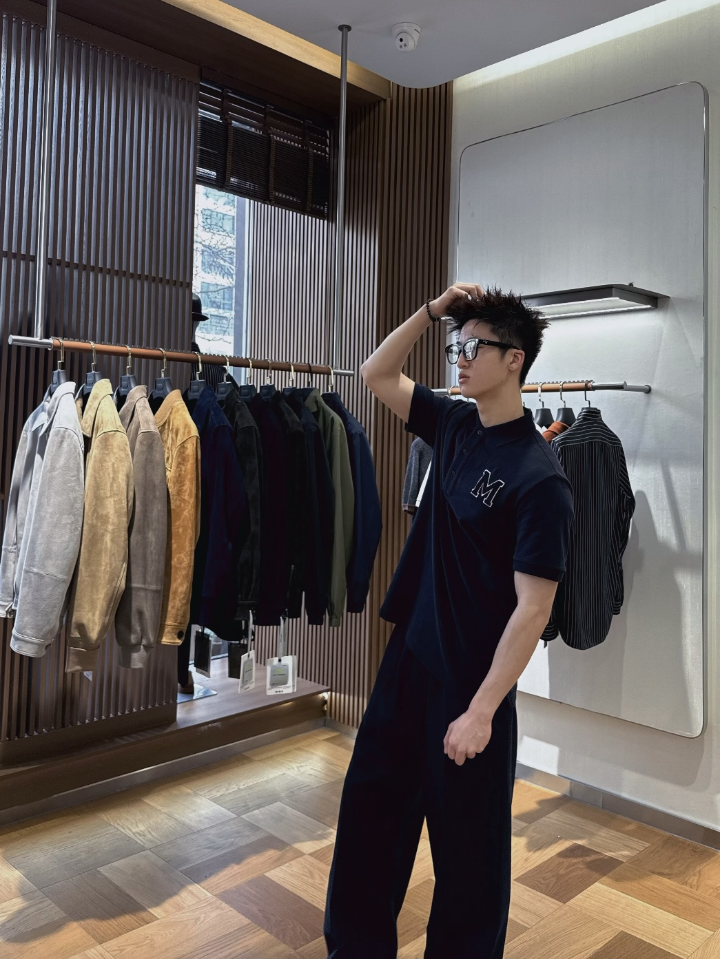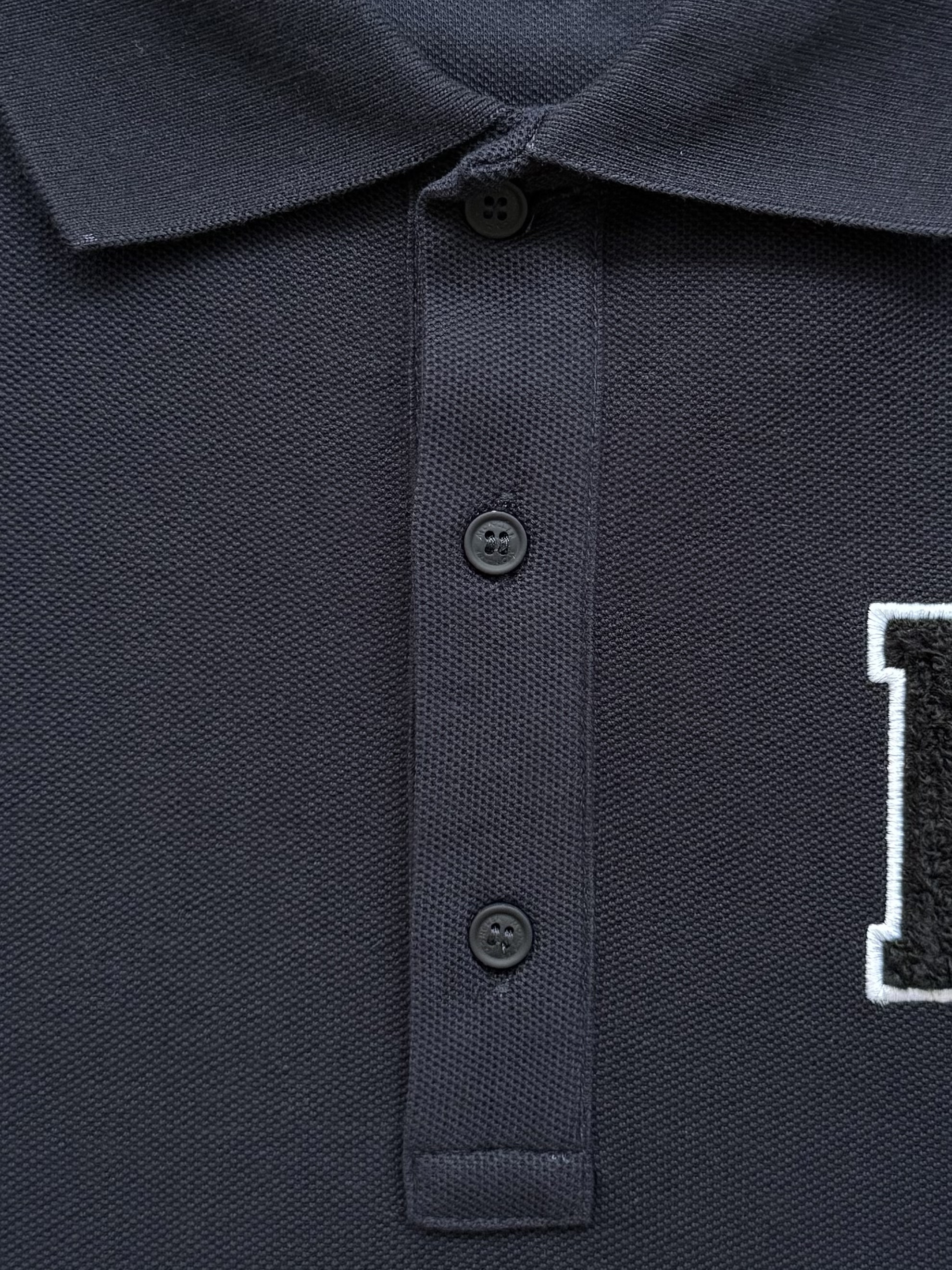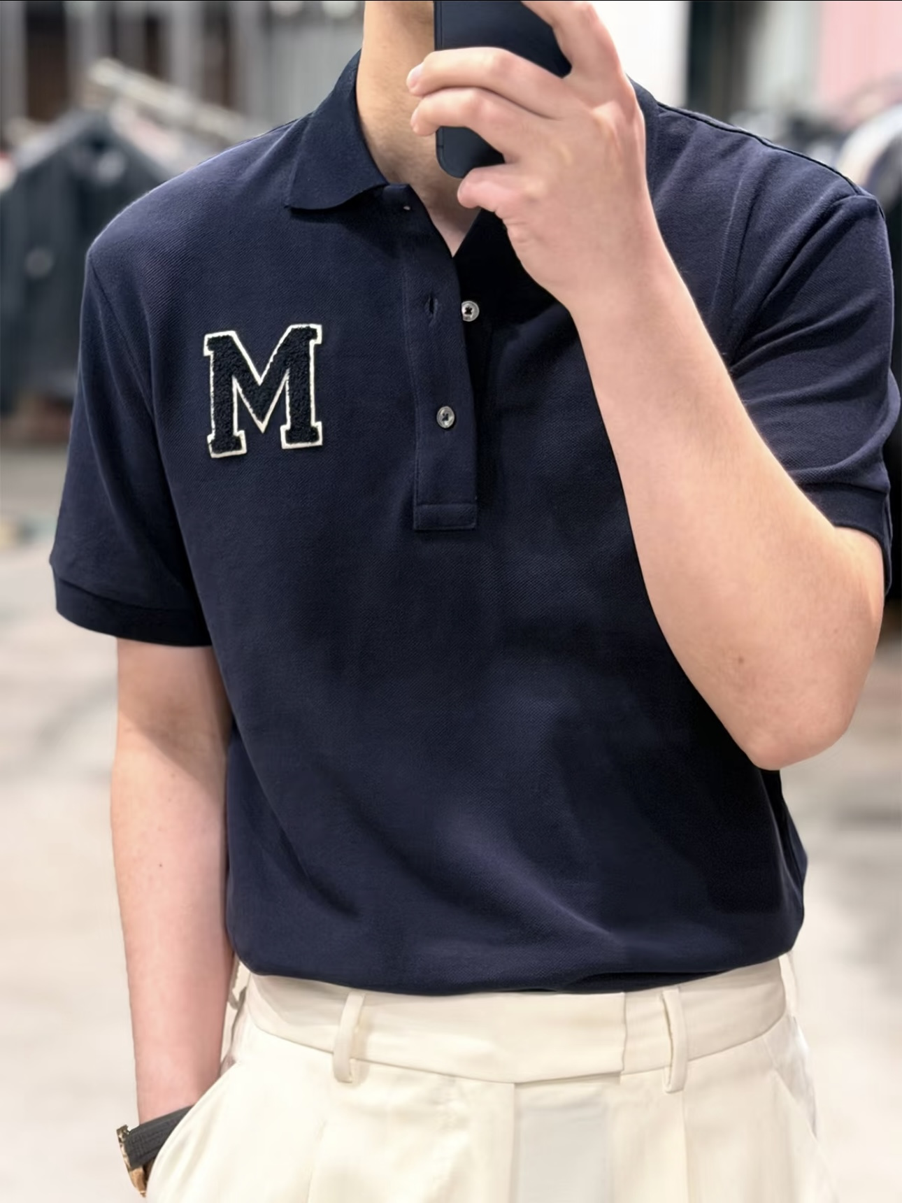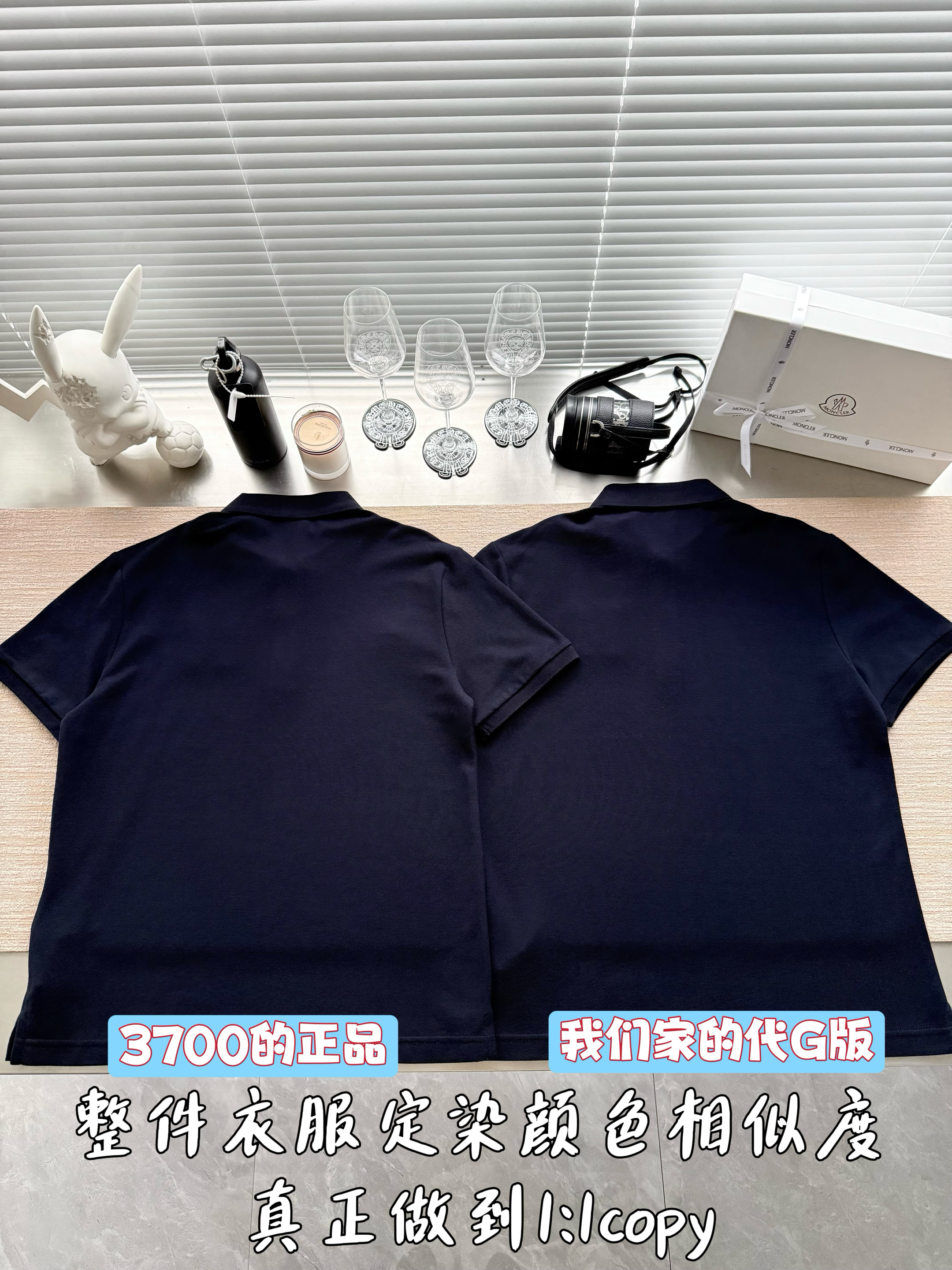 整件衣服3700购买ZP拆解打造,定制藏蓝色珠地棉面料,做到100%全棉进口纱线,定制标志性罗纹polo领,袖口,门襟开模定制字母标识纽扣,胸前饰以M字母毛巾绣贴饰,袖口饰以字母标识logo毛毡刺绣贴饰,真正做到1:1copy 闭眼入