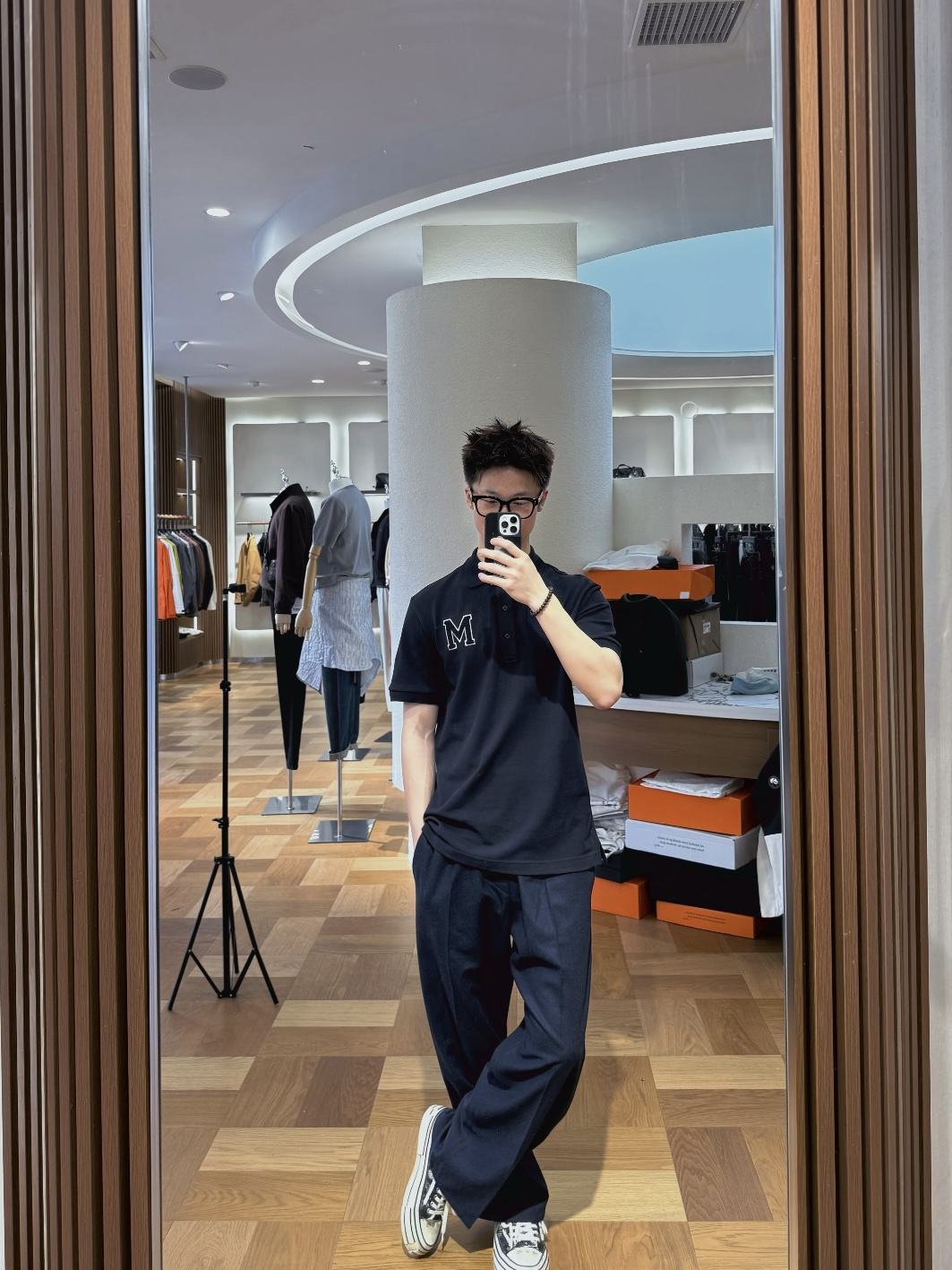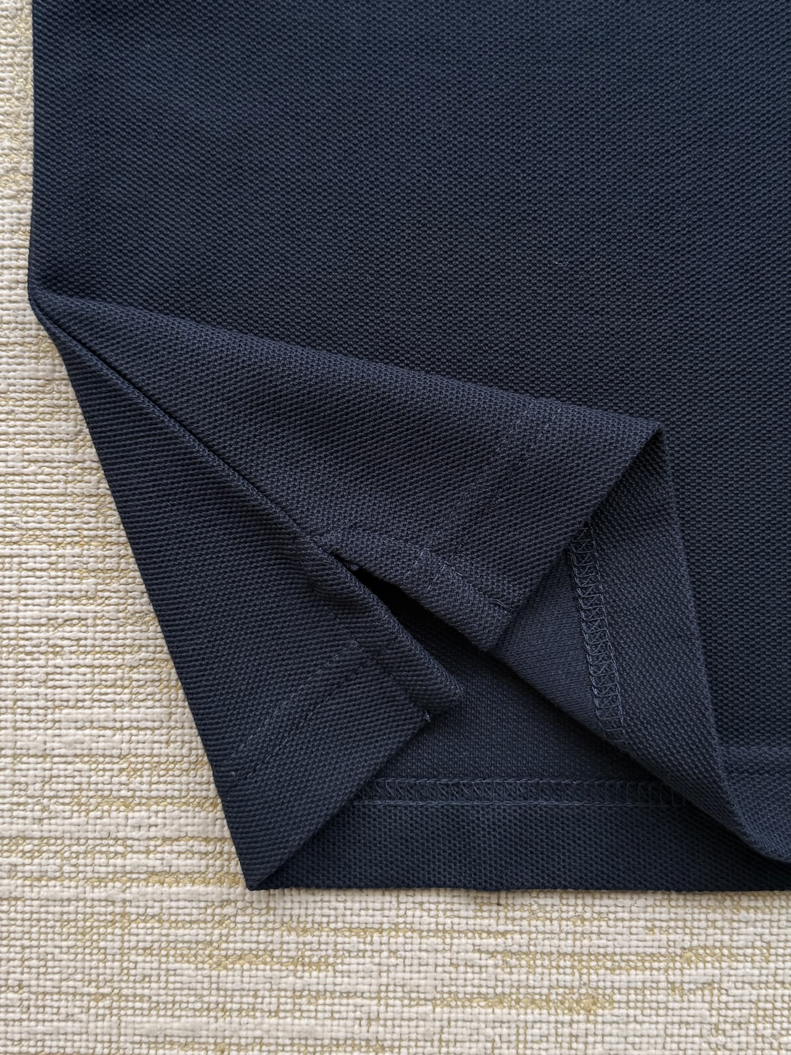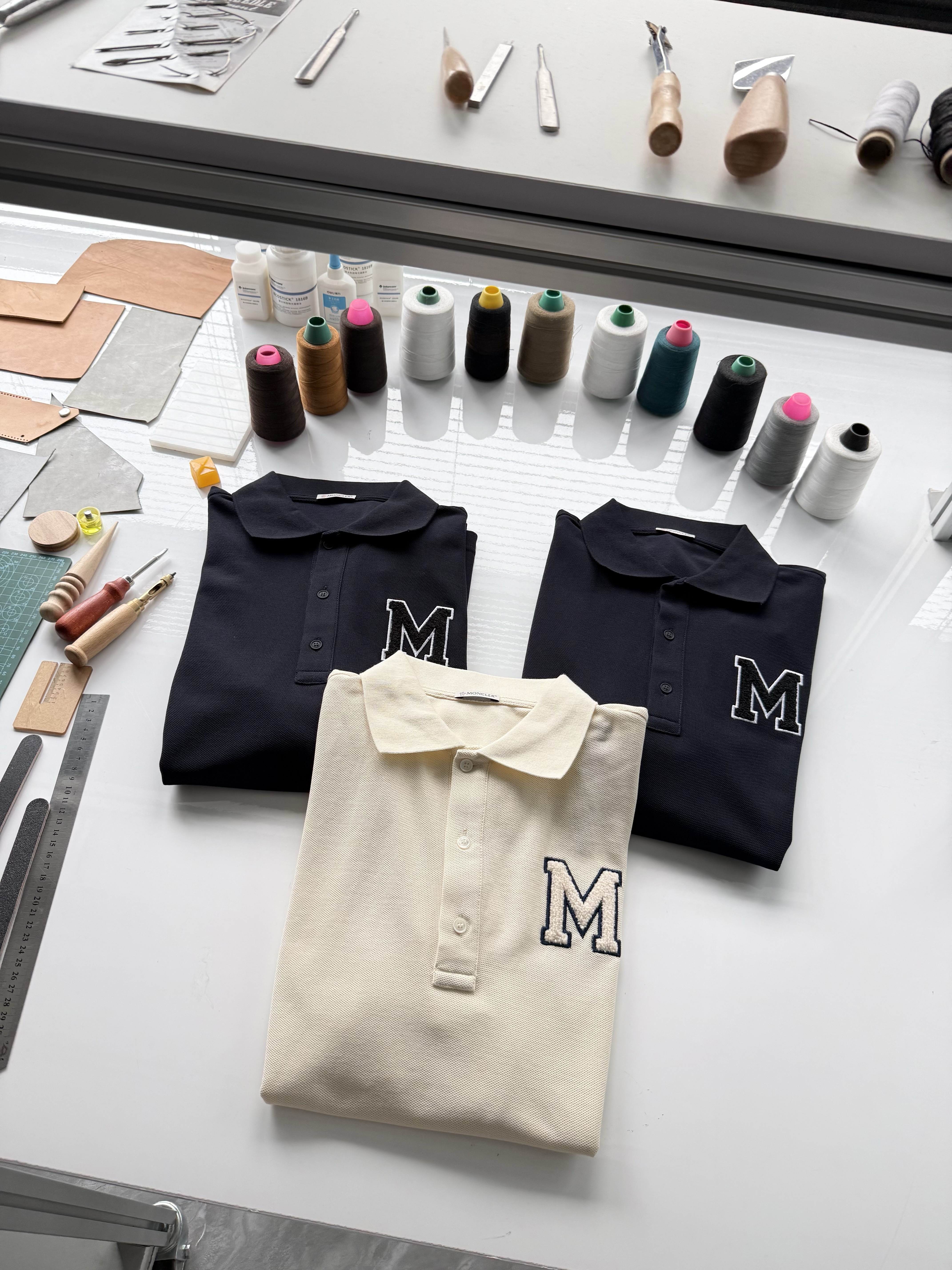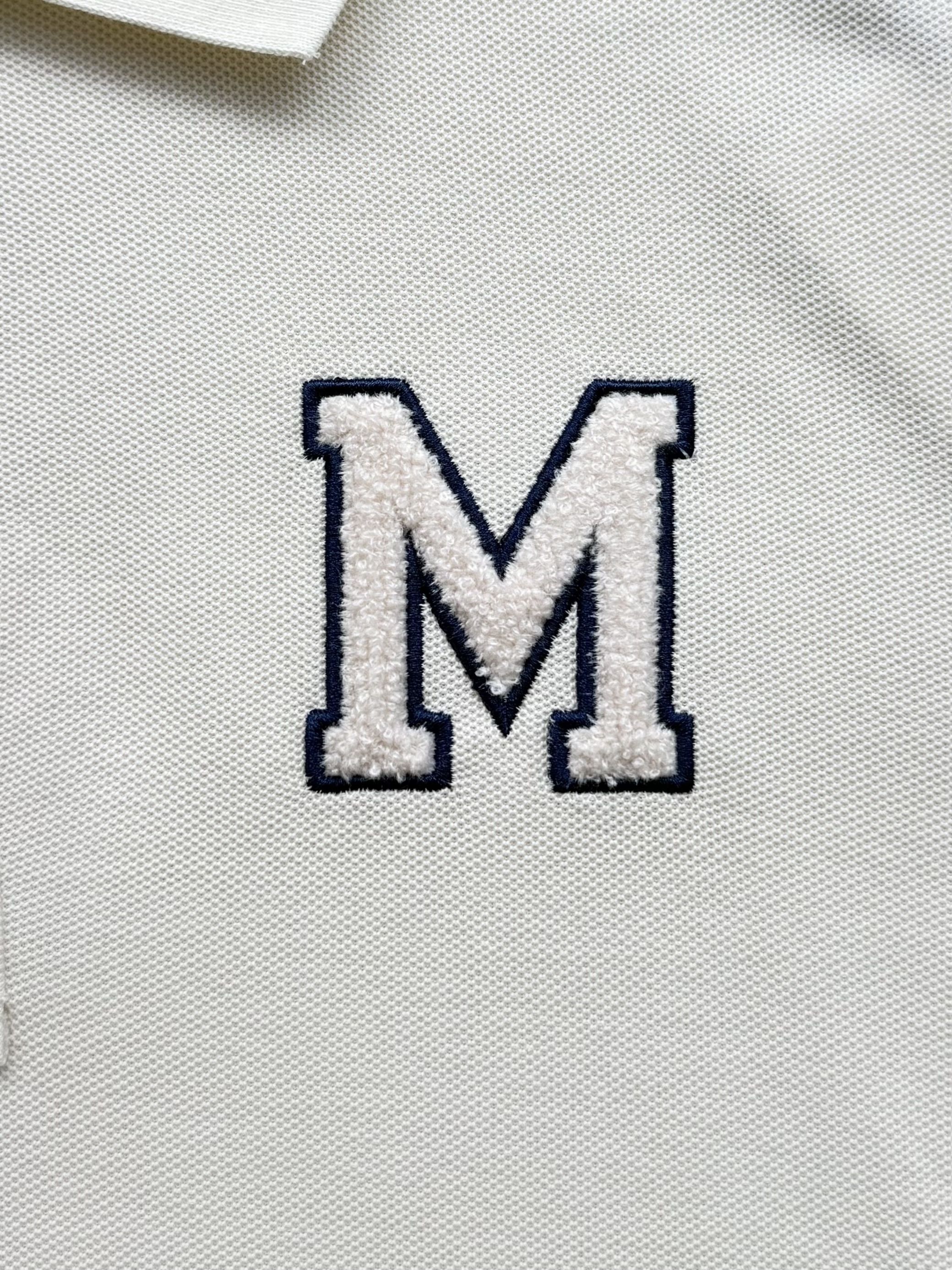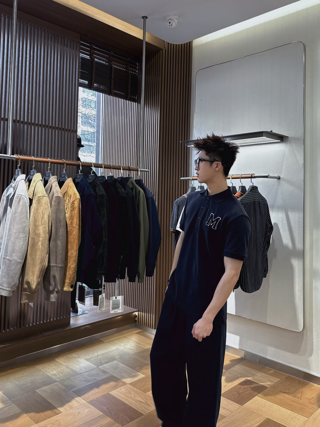 整件衣服3700购买ZP拆解打造,定制藏蓝色珠地棉面料,做到100%全棉进口纱线,定制标志性罗纹polo领,袖口,门襟开模定制字母标识纽扣,胸前饰以M字母毛巾绣贴饰,袖口饰以字母标识logo毛毡刺绣贴饰,真正做到1:1copy 闭眼入