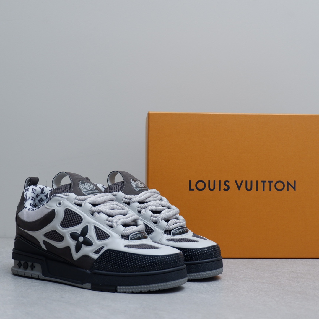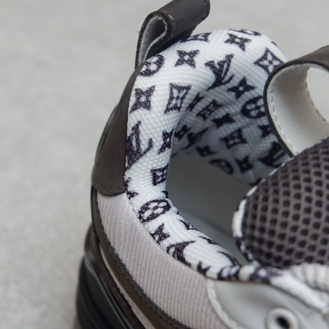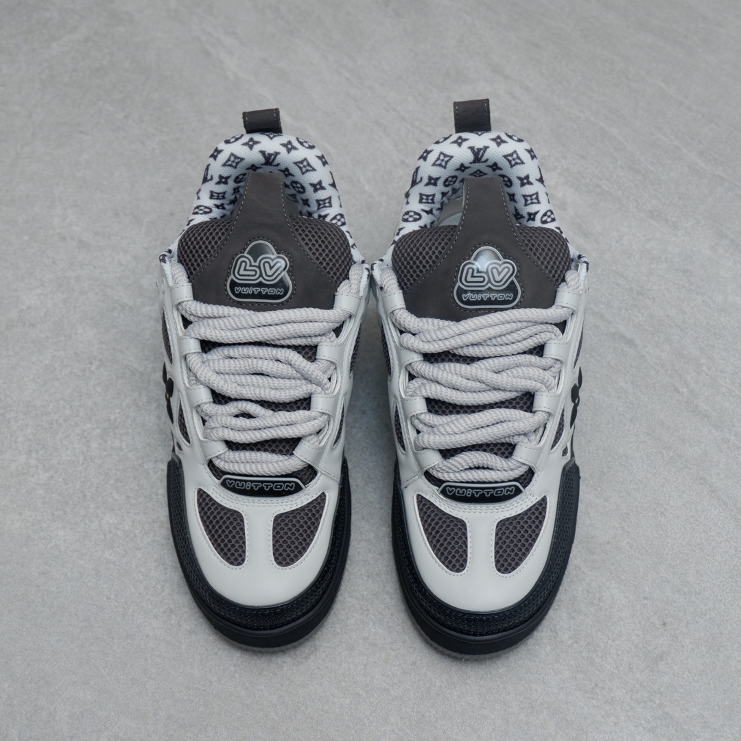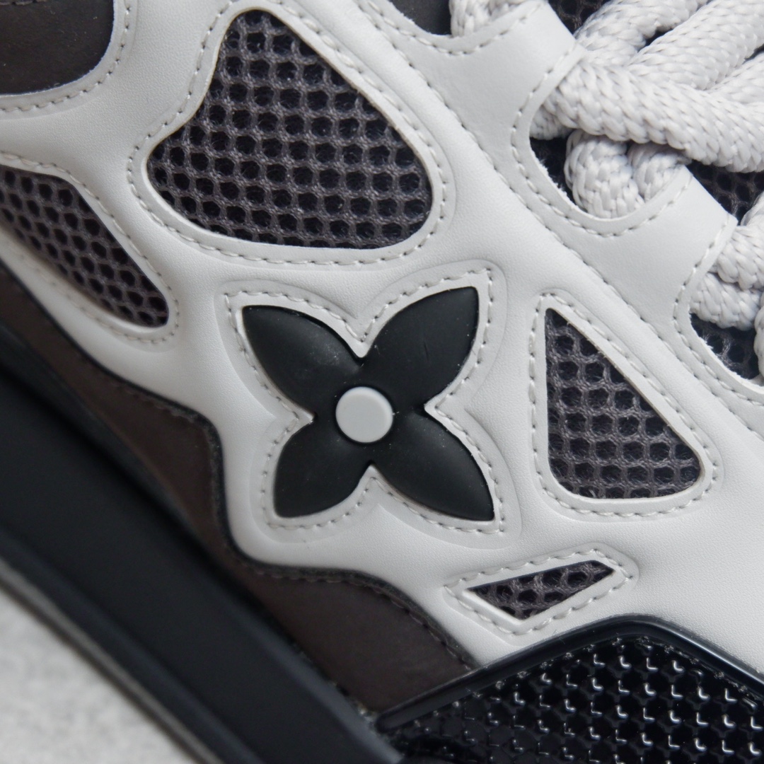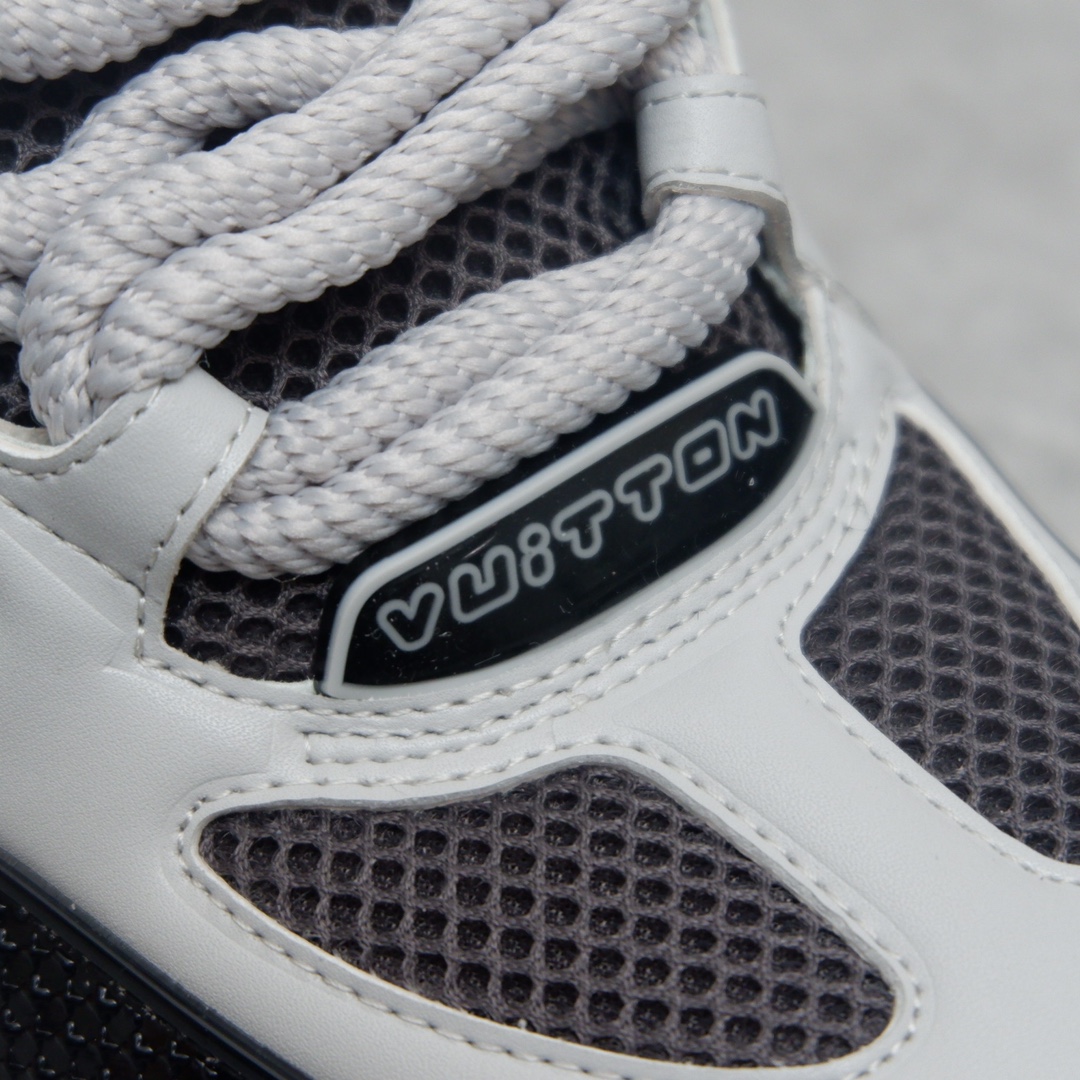 融合粒面牛皮革和科技网格面料,一侧交织的 LV字母源自路易威登2023秋冬秀场客座设计师:KidSuper品牌创始人Colm Dillane。加衬鞋领和鞋舌、双鞋带及外底援引滑板鞋设计。