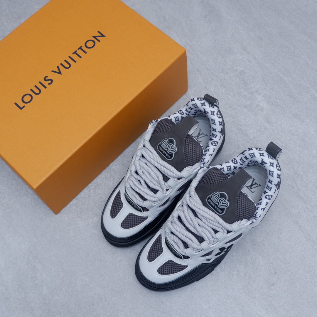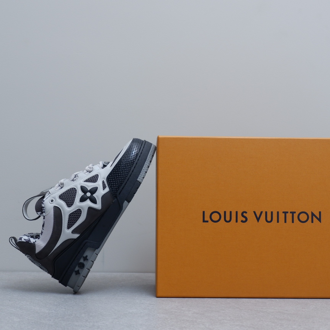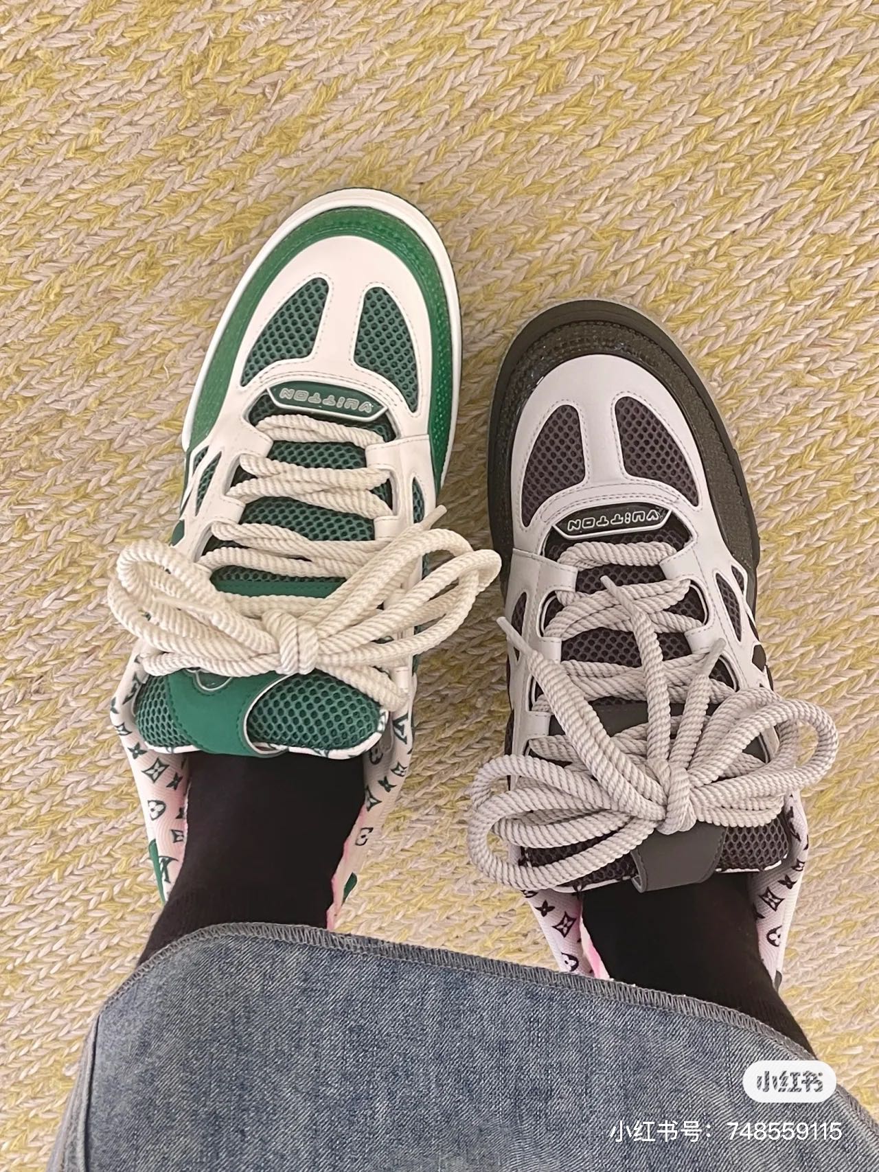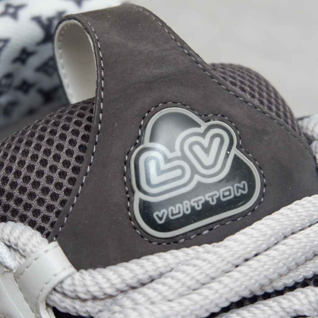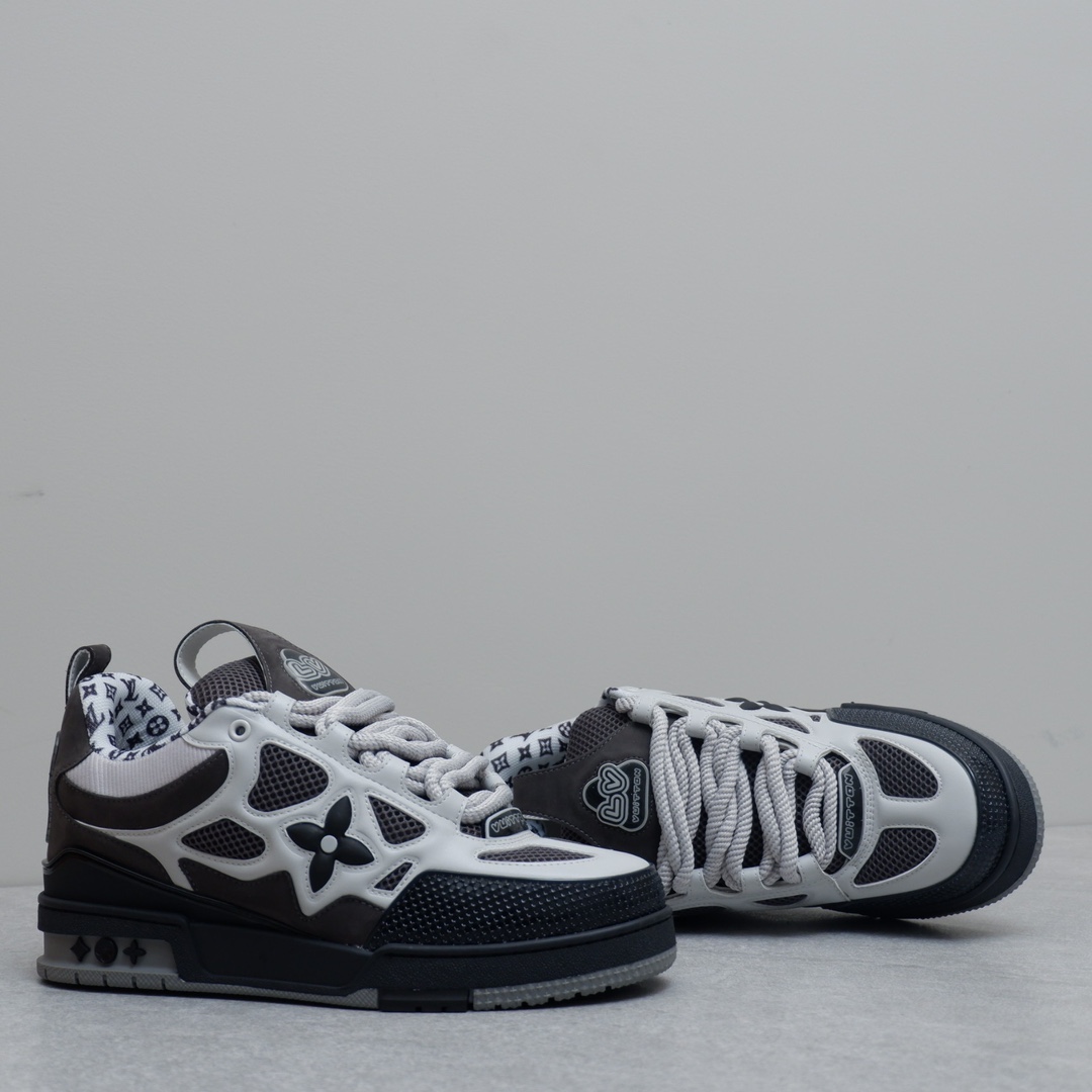 融合粒面牛皮革和科技网格面料,一侧交织的 LV字母源自路易威登2023秋冬秀场客座设计师:KidSuper品牌创始人Colm Dillane。加衬鞋领和鞋舌、双鞋带及外底援引滑板鞋设计。