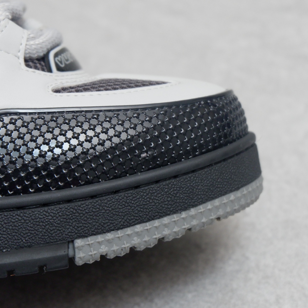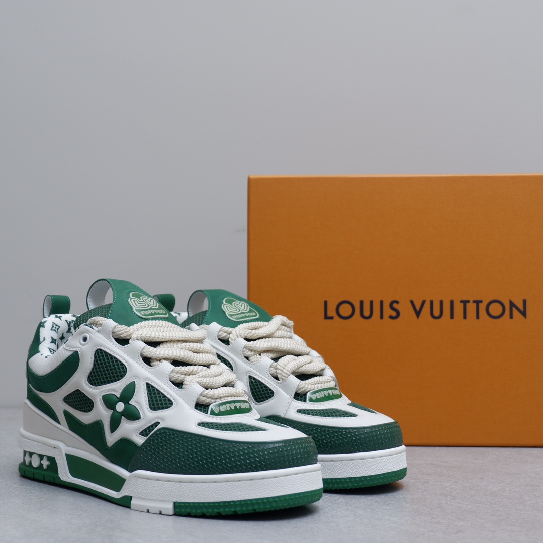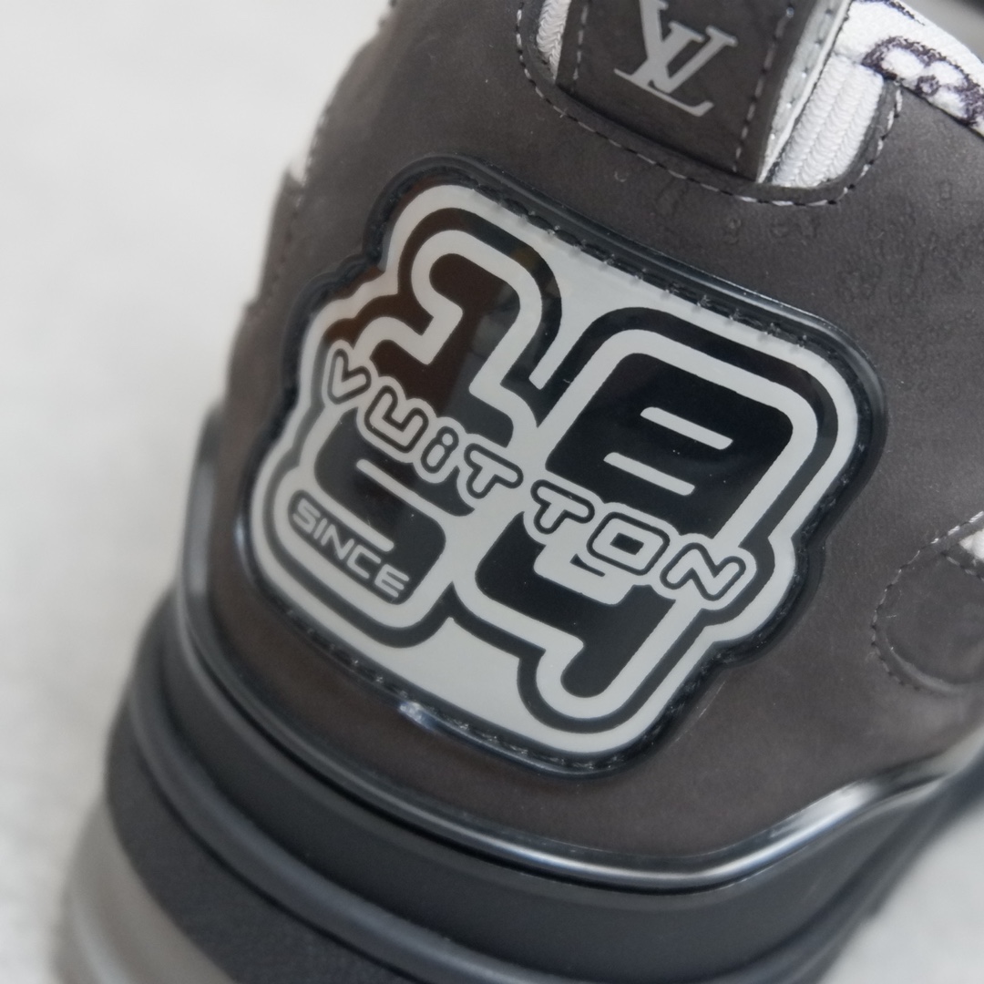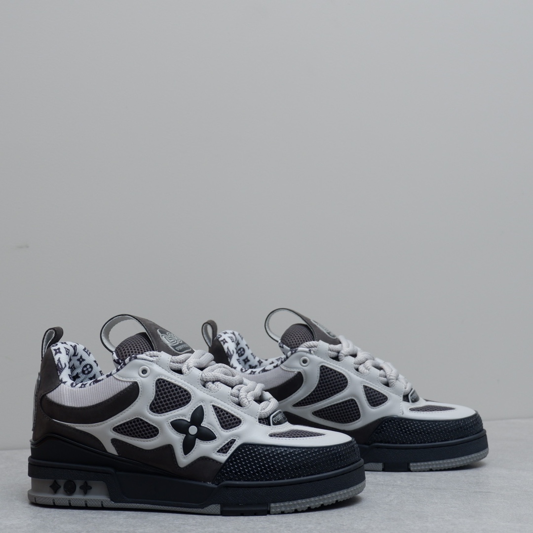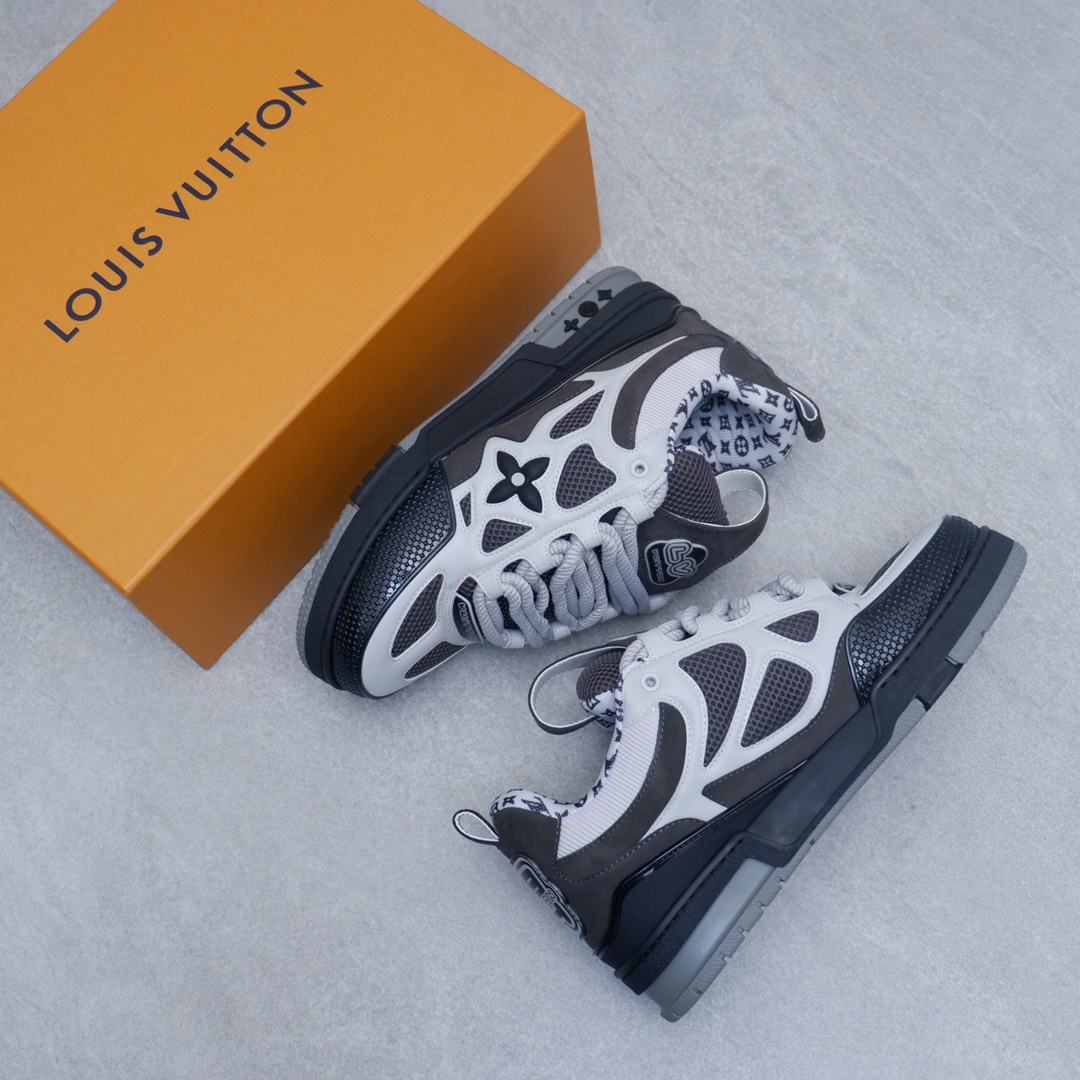 融合粒面牛皮革和科技网格面料,一侧交织的 LV字母源自路易威登2023秋冬秀场客座设计师:KidSuper品牌创始人Colm Dillane。加衬鞋领和鞋舌、双鞋带及外底援引滑板鞋设计。