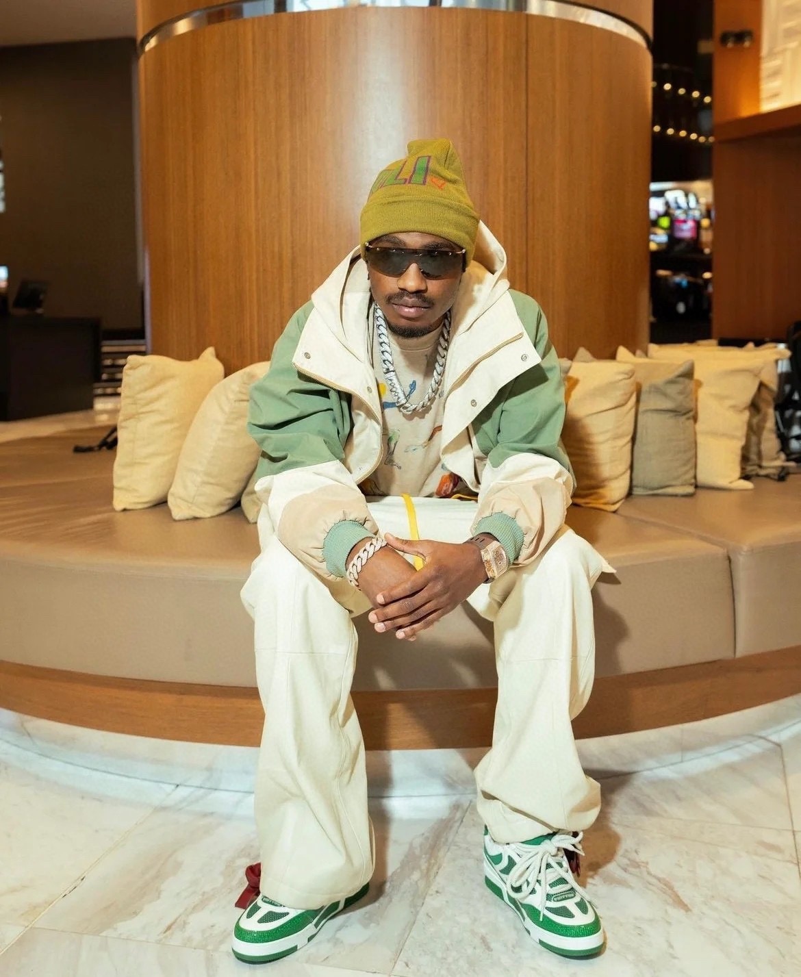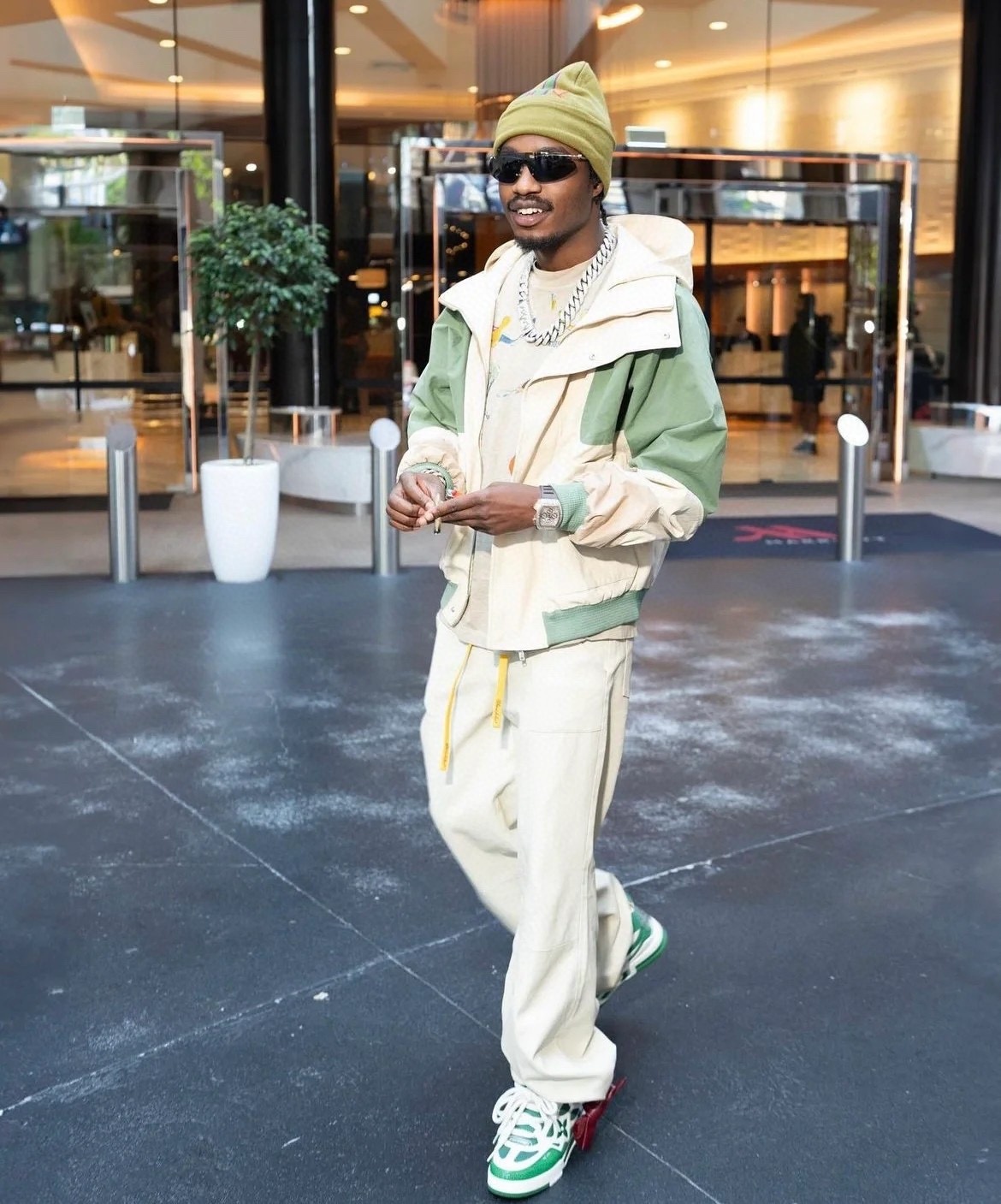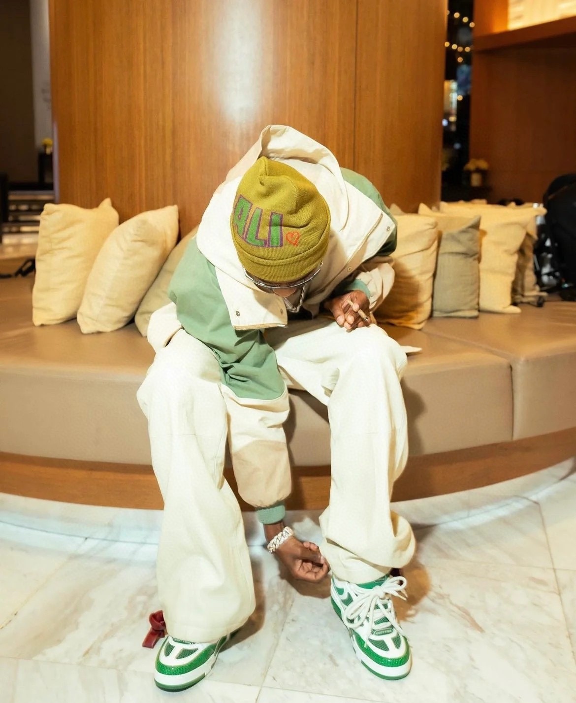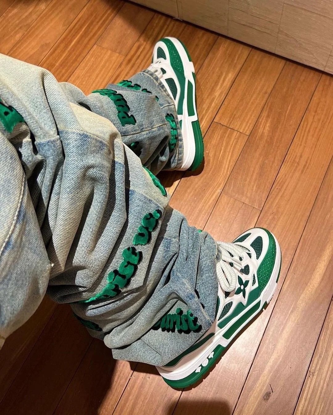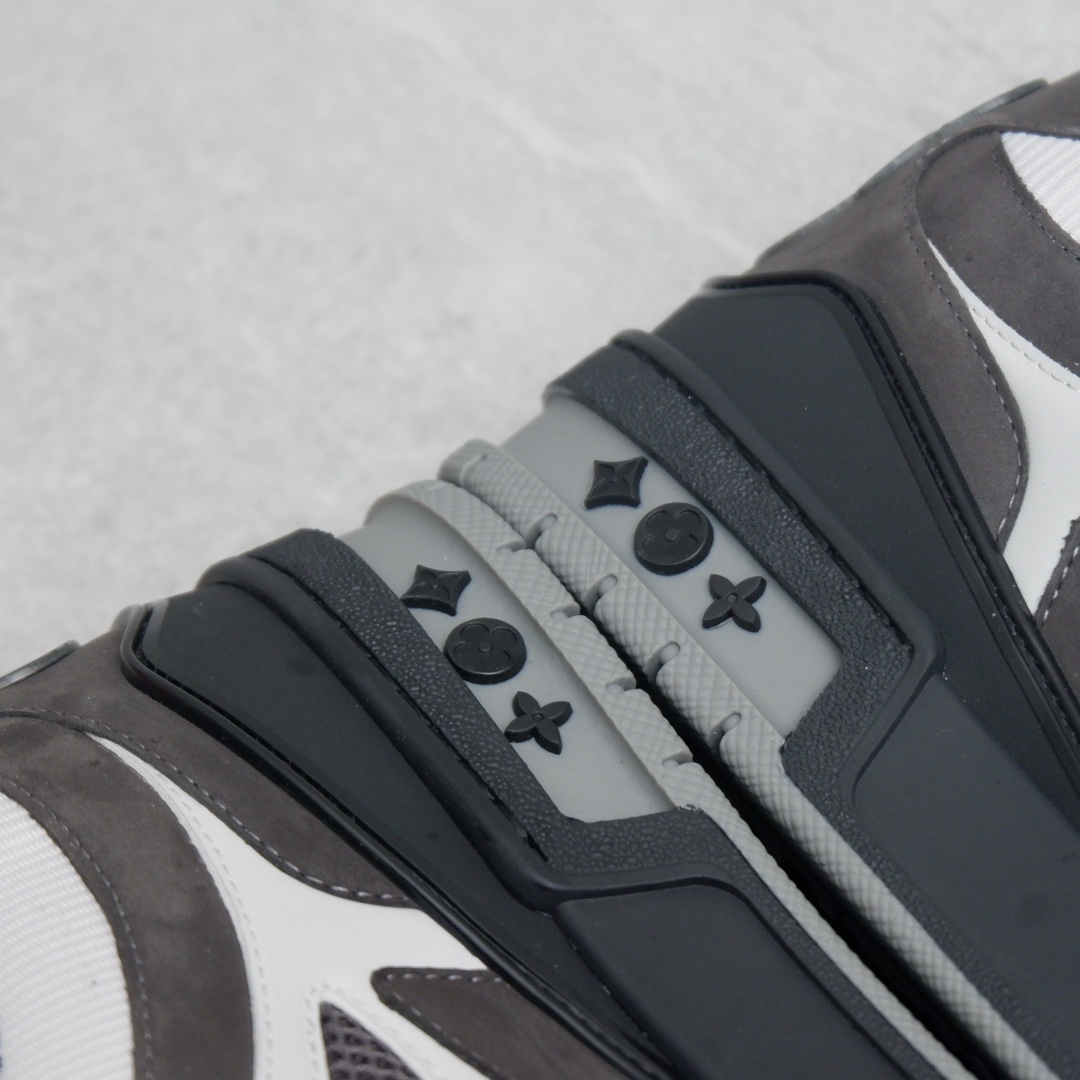 融合粒面牛皮革和科技网格面料,一侧交织的 LV字母源自路易威登2023秋冬秀场客座设计师:KidSuper品牌创始人Colm Dillane。加衬鞋领和鞋舌、双鞋带及外底援引滑板鞋设计。