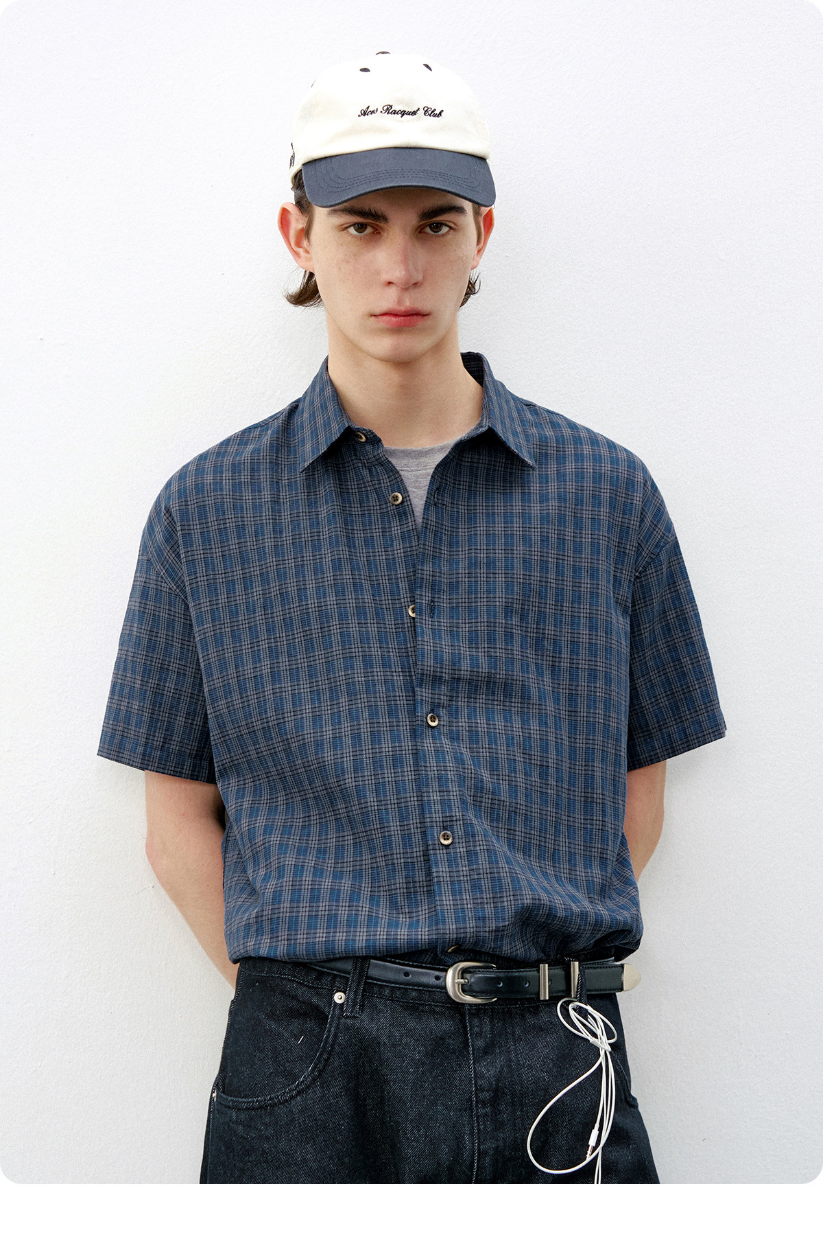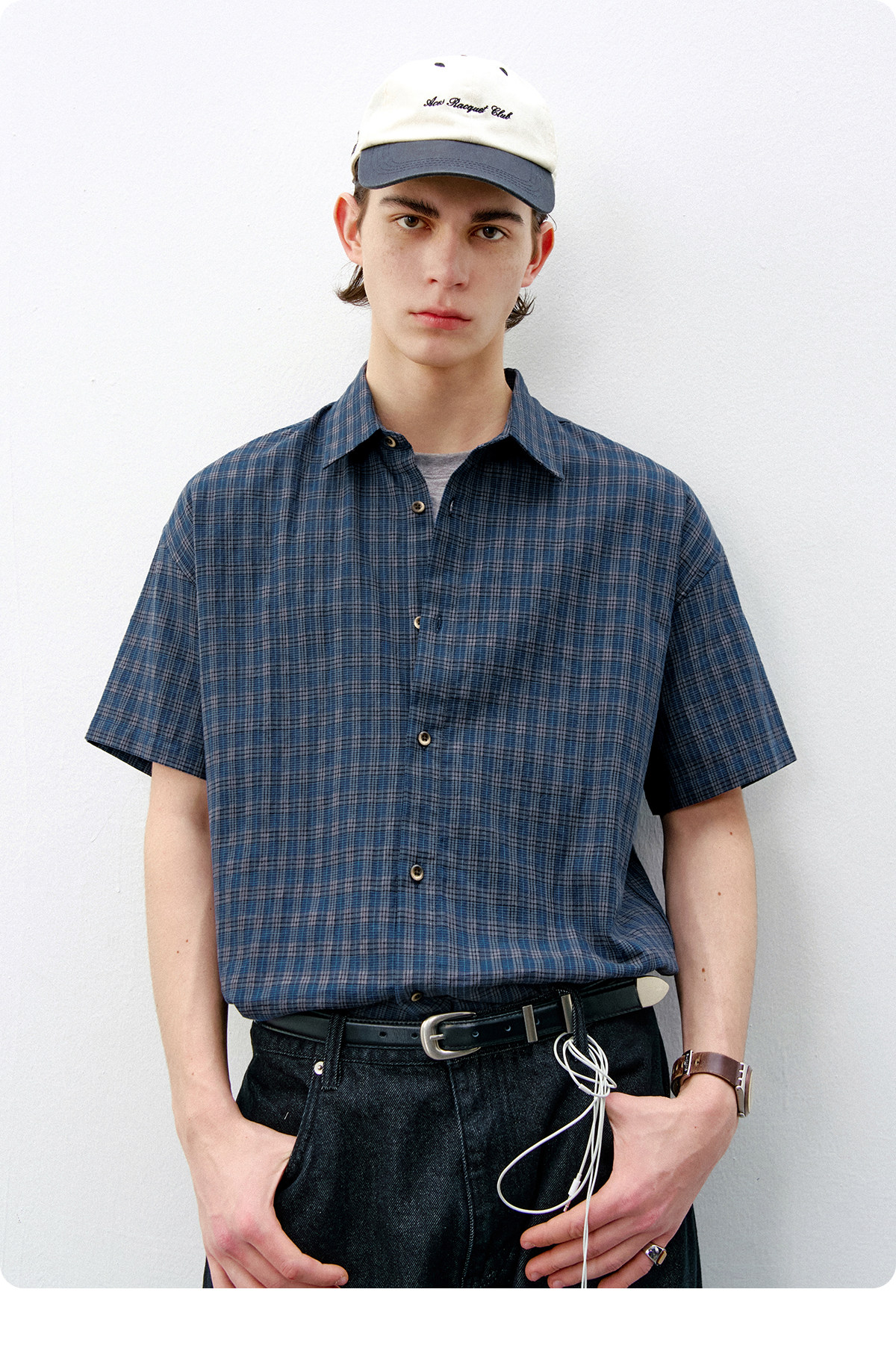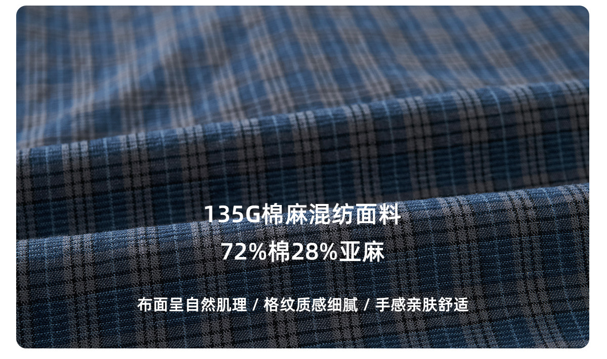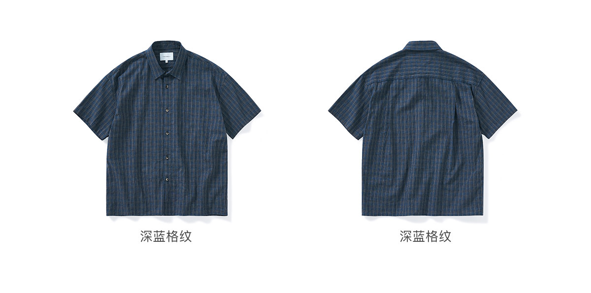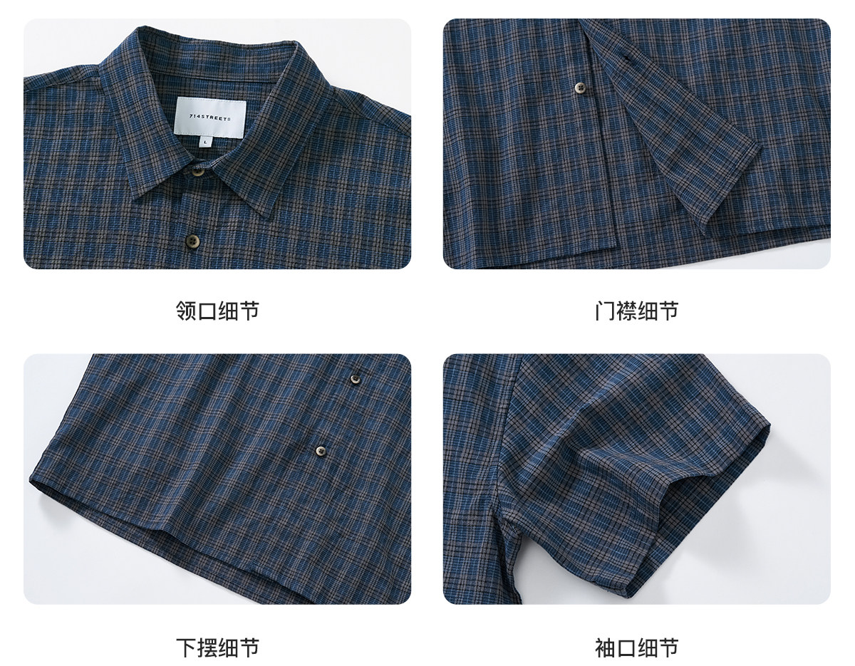 714street复古棉麻蓝色格子短袖衬衫男2026夏季宽松落肩美式衬衣