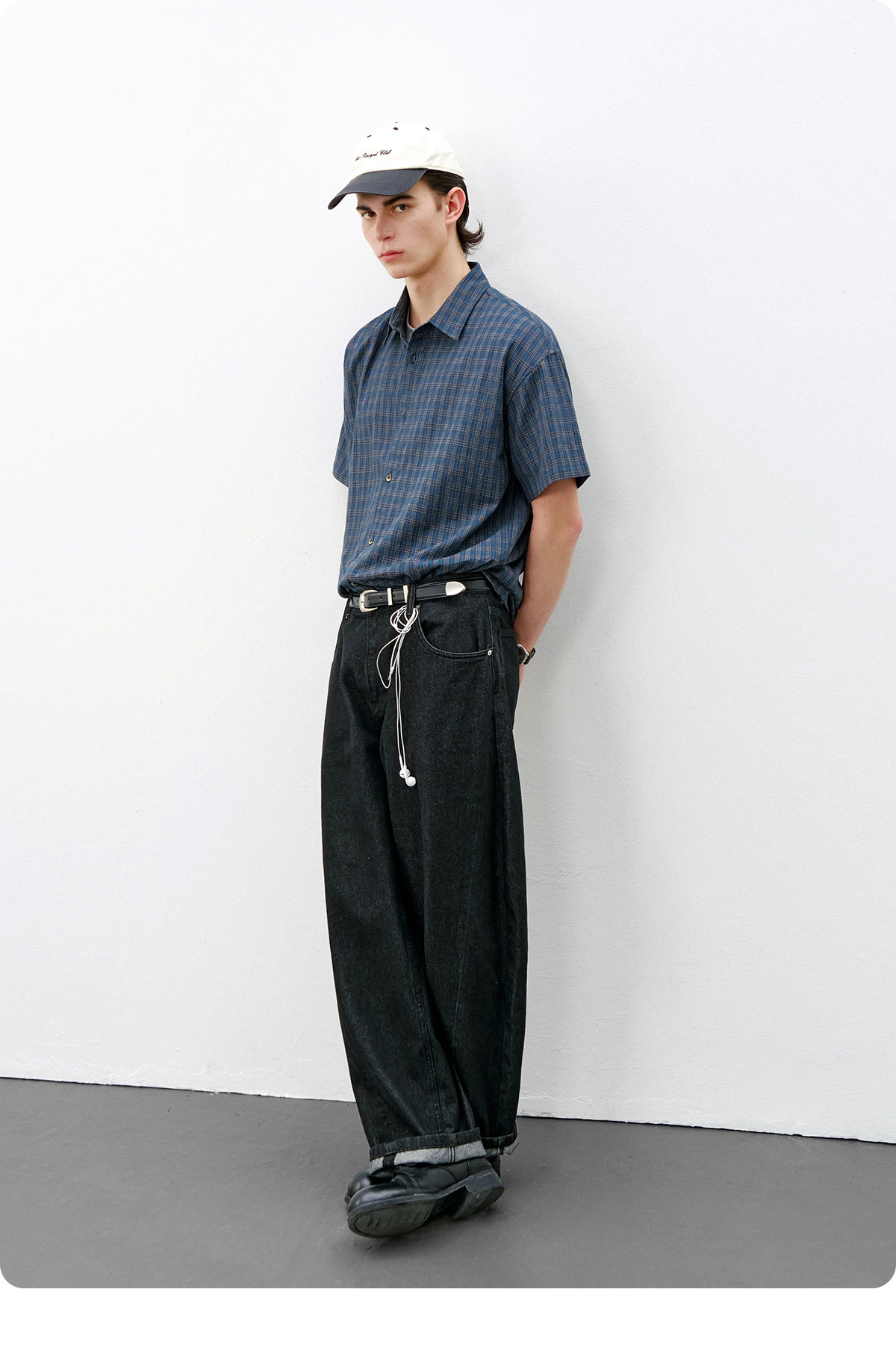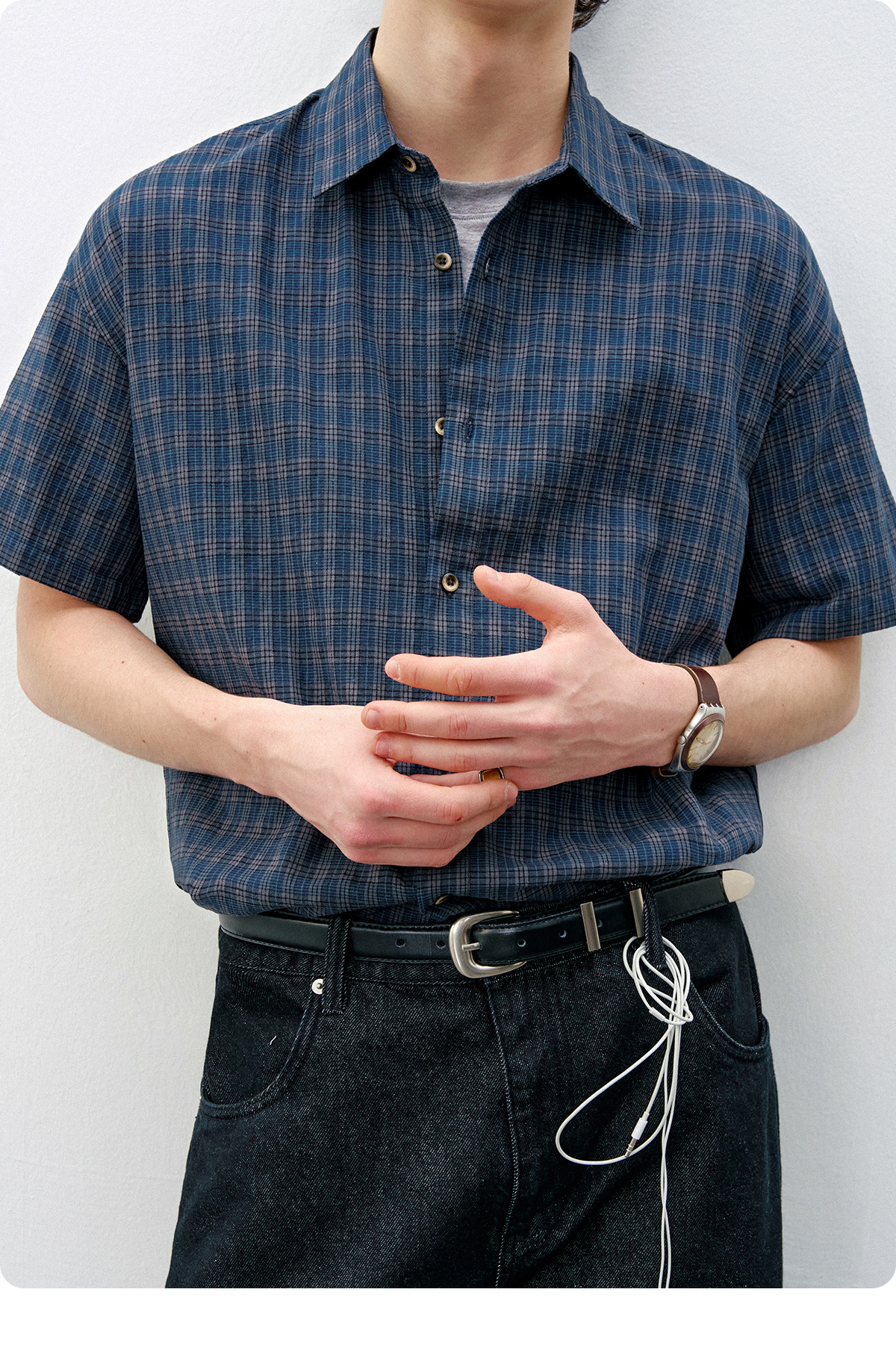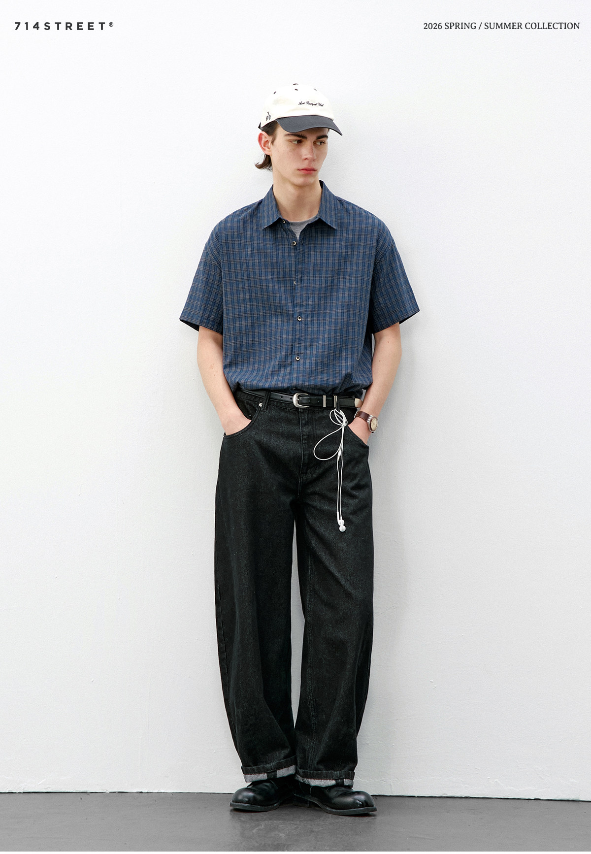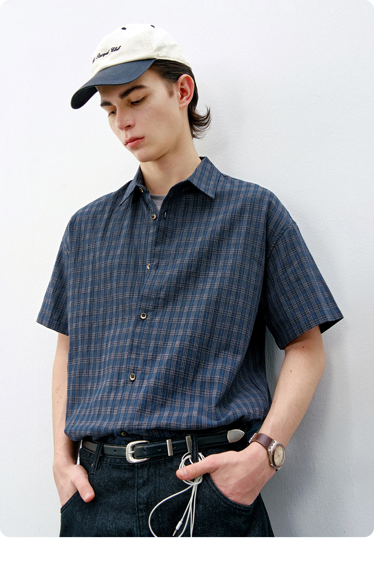 714street复古棉麻蓝色格子短袖衬衫男2026夏季宽松落肩美式衬衣