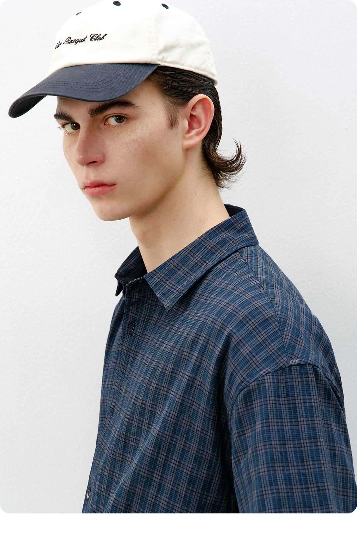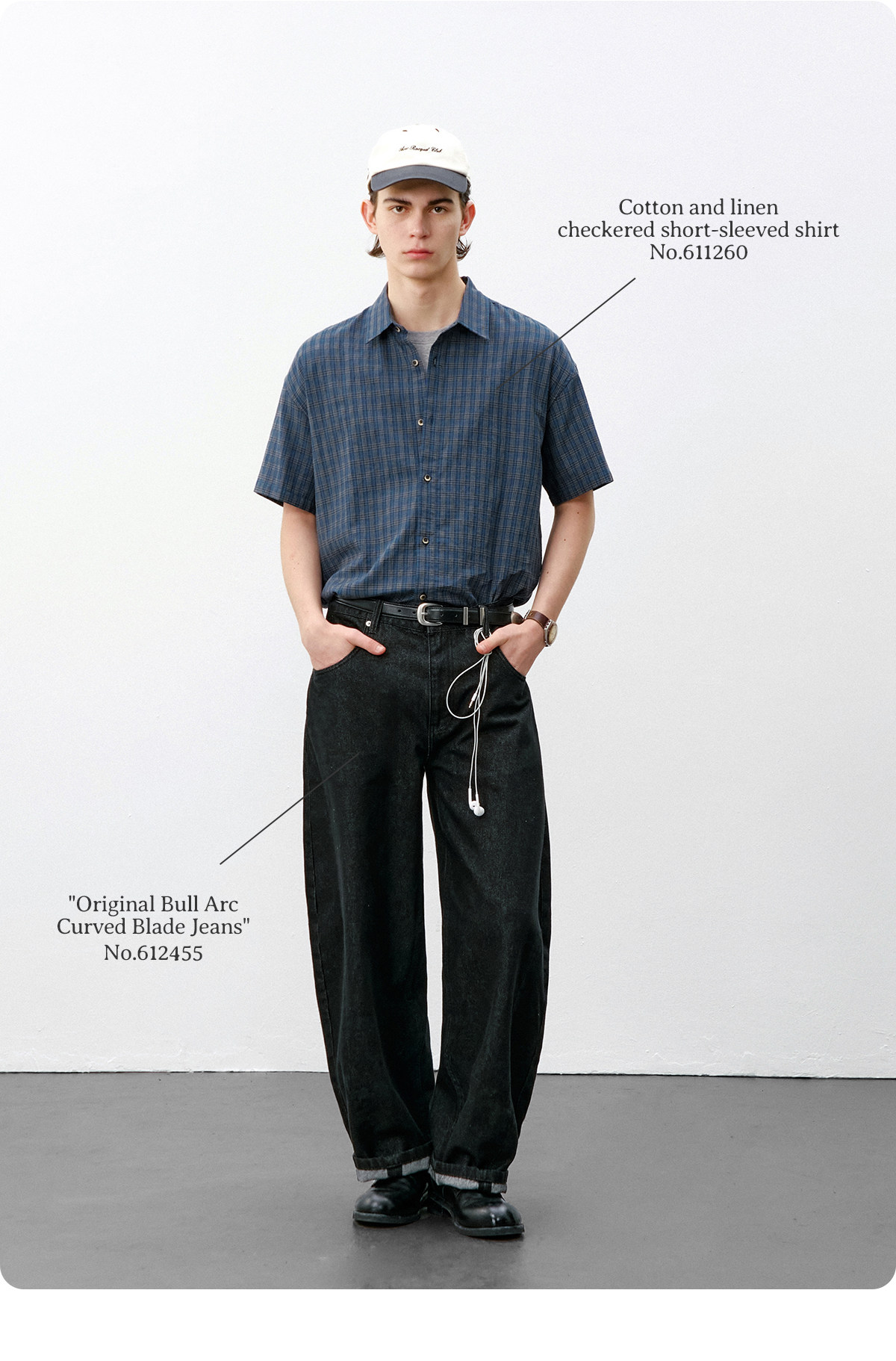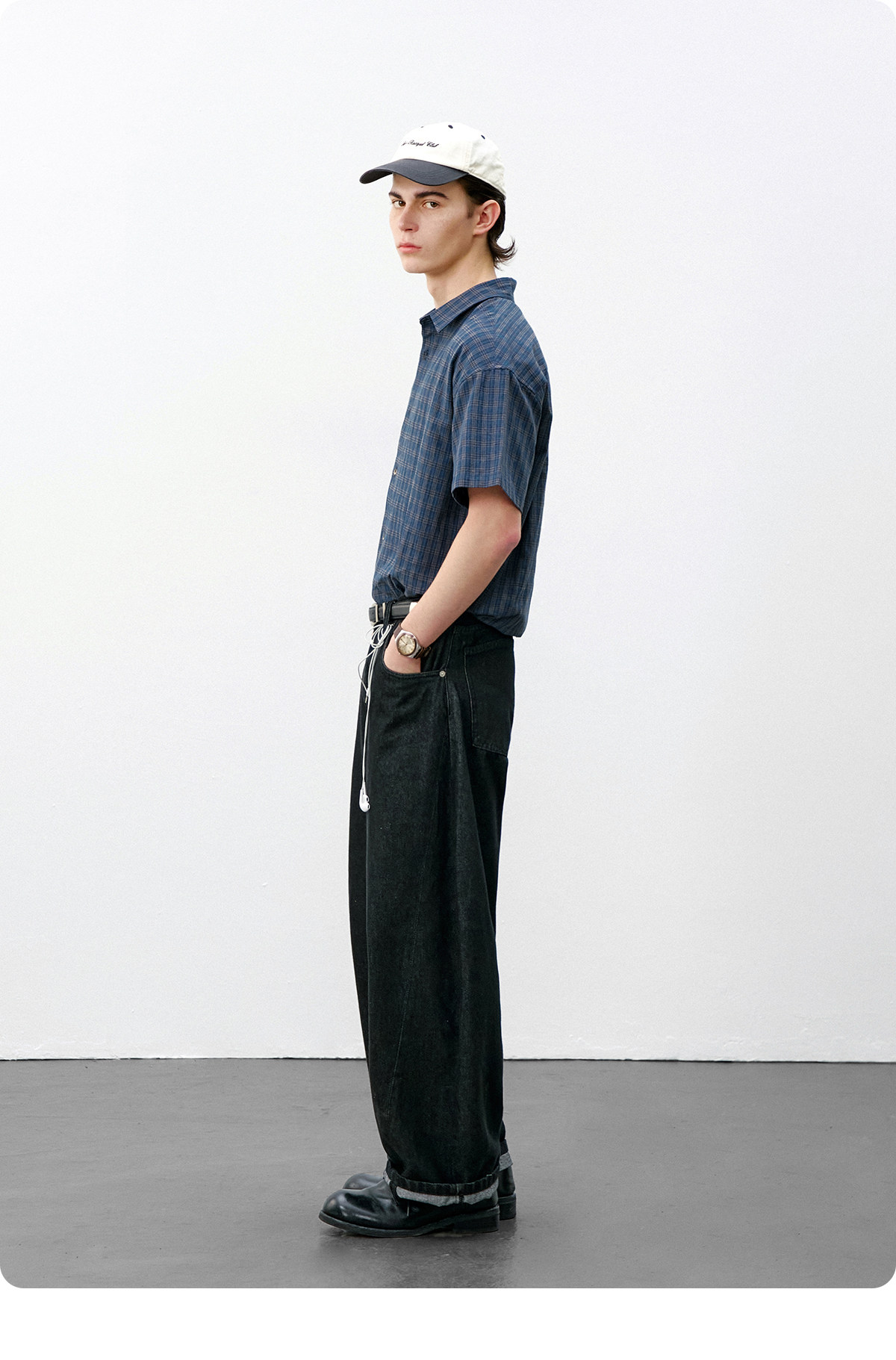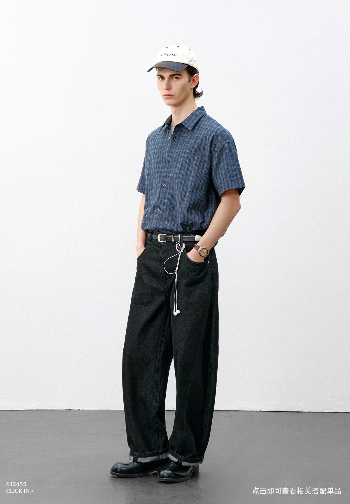 714street复古棉麻蓝色格子短袖衬衫男2026夏季宽松落肩美式衬衣