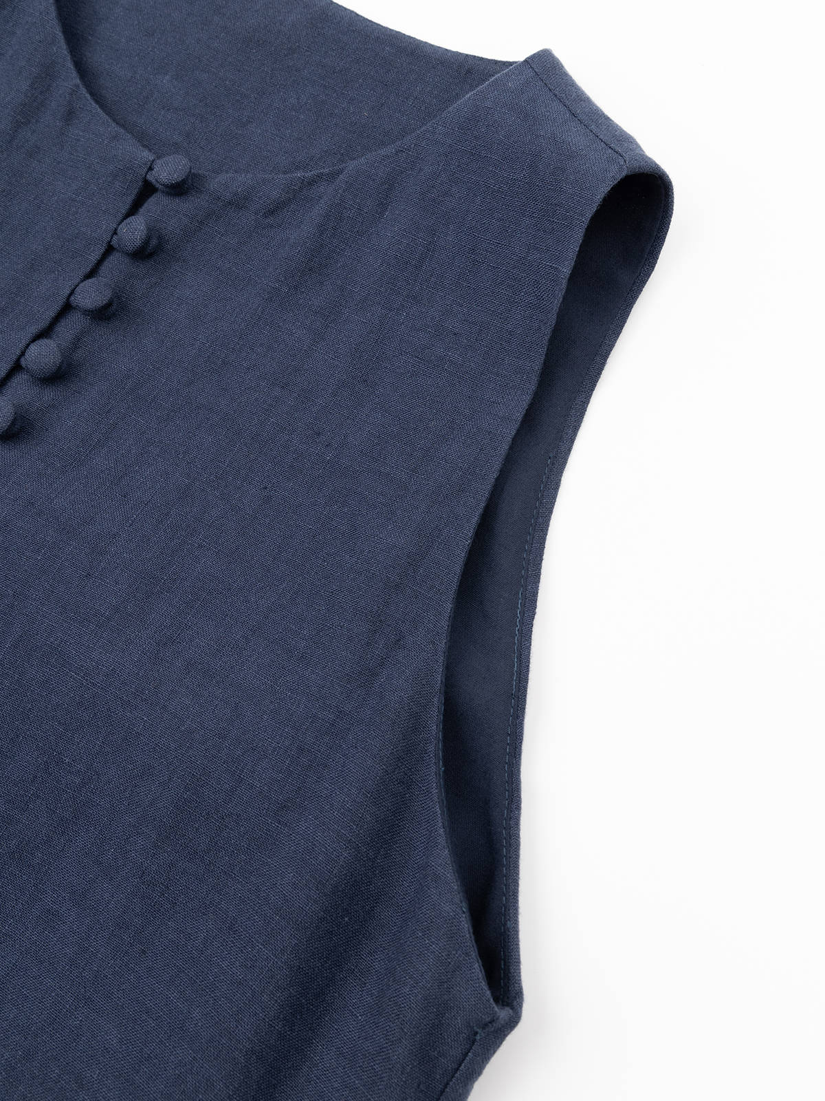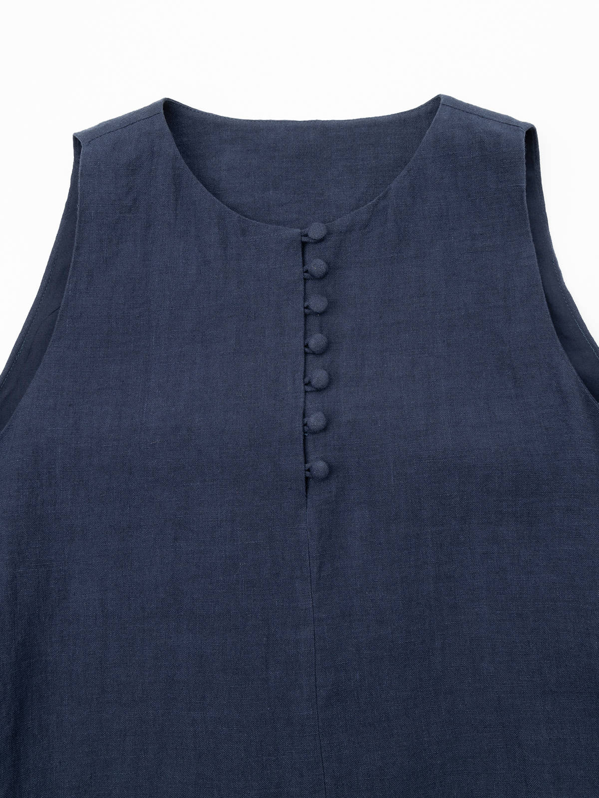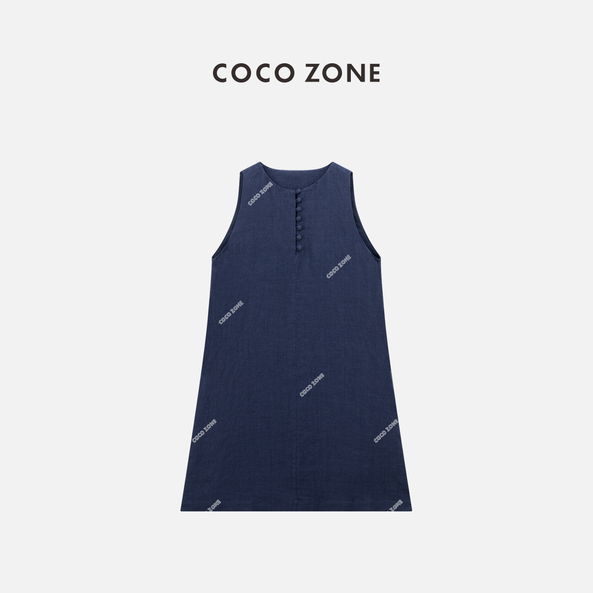 COCO ZONE"安东尼"夏季半开纽扣无袖连衣裙纯色圆领A字裙CC1B0877