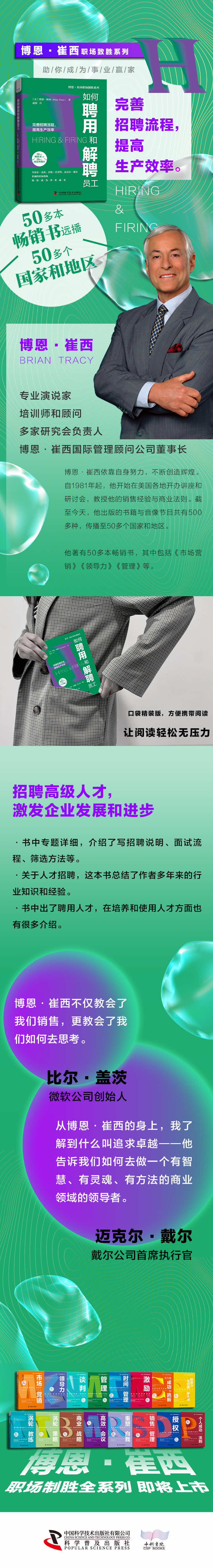 管理者的职责是通过他人来创造成果,因此员工的招聘与解聘是管理者非常重要的两项任务。招聘复杂多变;解聘困难用重重,令人倍感压力。如果管理者想在组织中发挥自己的全部潜力,就必须通过学习和实践来掌握这两项技能。 招募一批高效且称职的员工,并将他们组建成一支团队,这是管理者一项重要的才能。在现代社会中,所有工作都需要团队协作——团队成员携手合作、高效互动,实现预定的目标。因此,挑选合 适的团队成员对管理者与企业的成功都至关重要。 本书基于博恩·崔西三十多年来对企业各级员工的招聘、培训、晋升、降职与解聘的经验,涵盖当今世界顶级管理专家与管理人员对如何聘用和解聘员工的深度思考。本书介绍的方法可以帮你完善招聘与解聘的流程,提高生产效率,增加业绩与盈利,实现更高水平的团队合作,使企业的工作氛围更加和谐。 人类是极其复杂又难以捉摸的生物,因此,即使是Z高明的招聘技巧,其成功率也只有 68%。权威统计数据显示,在管理者录用的人中,从长远来看,大约有三分之一的员工无法胜任其工作。但是, 采用本书提供的建议和方法,管理者可以大大提高招聘成功的概率。