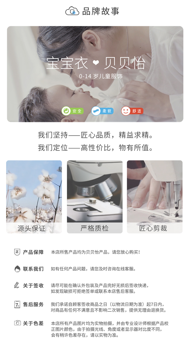 - 贝贝怡专注0-6岁婴幼儿服饰,坚持安全、柔软、舒适的产品理念,为千万中国家庭提供超高品质、安全可靠的婴幼儿服饰产品,妈妈放心,宝宝开心!