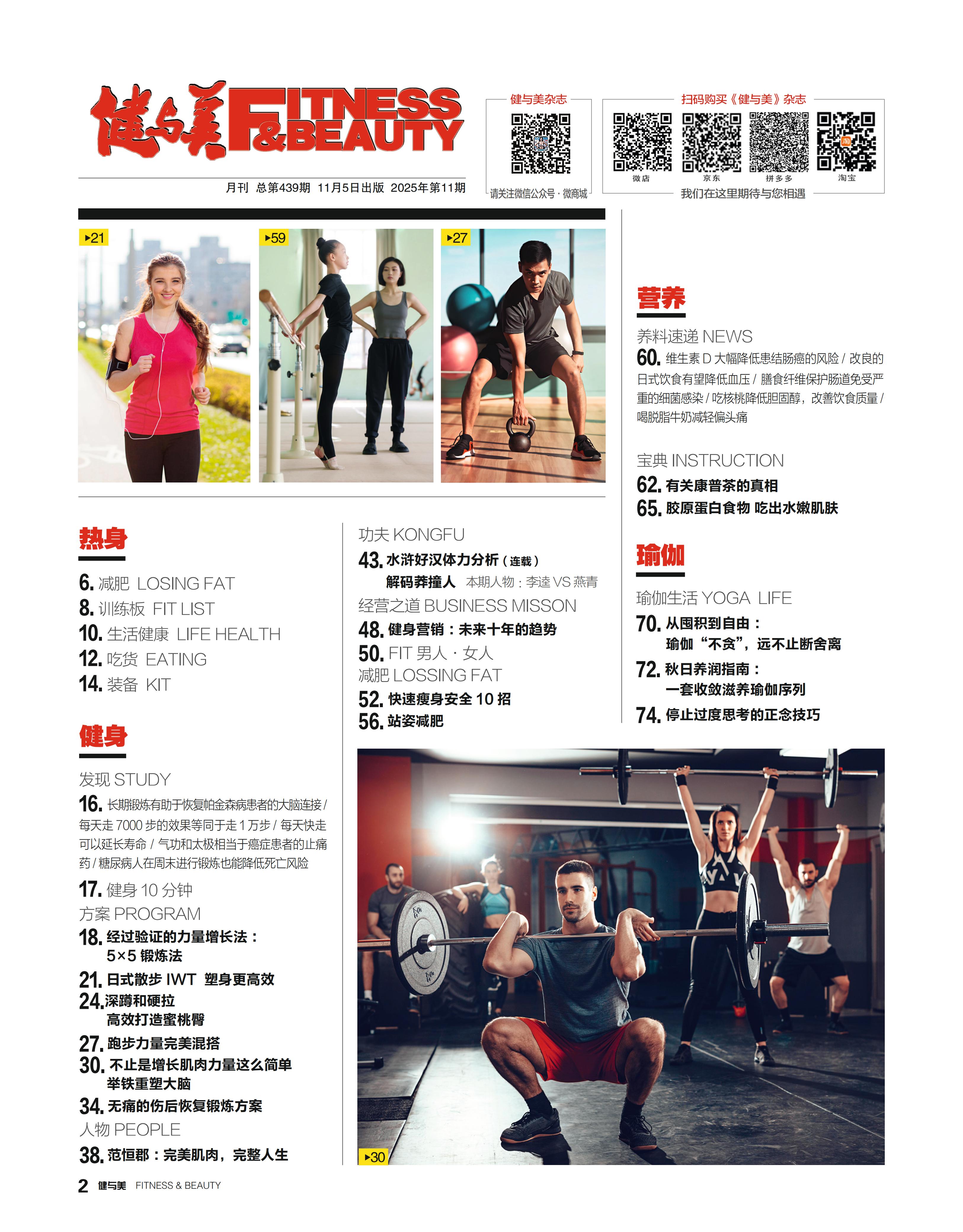 1.《健与美》月刊于每月底新刊上市,2025年单期杂志零售价格为30元,全国各大报刊亭有售。邮局可订阅。