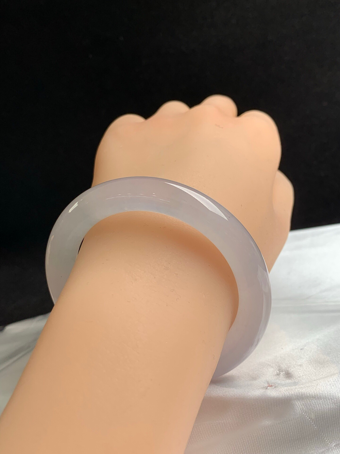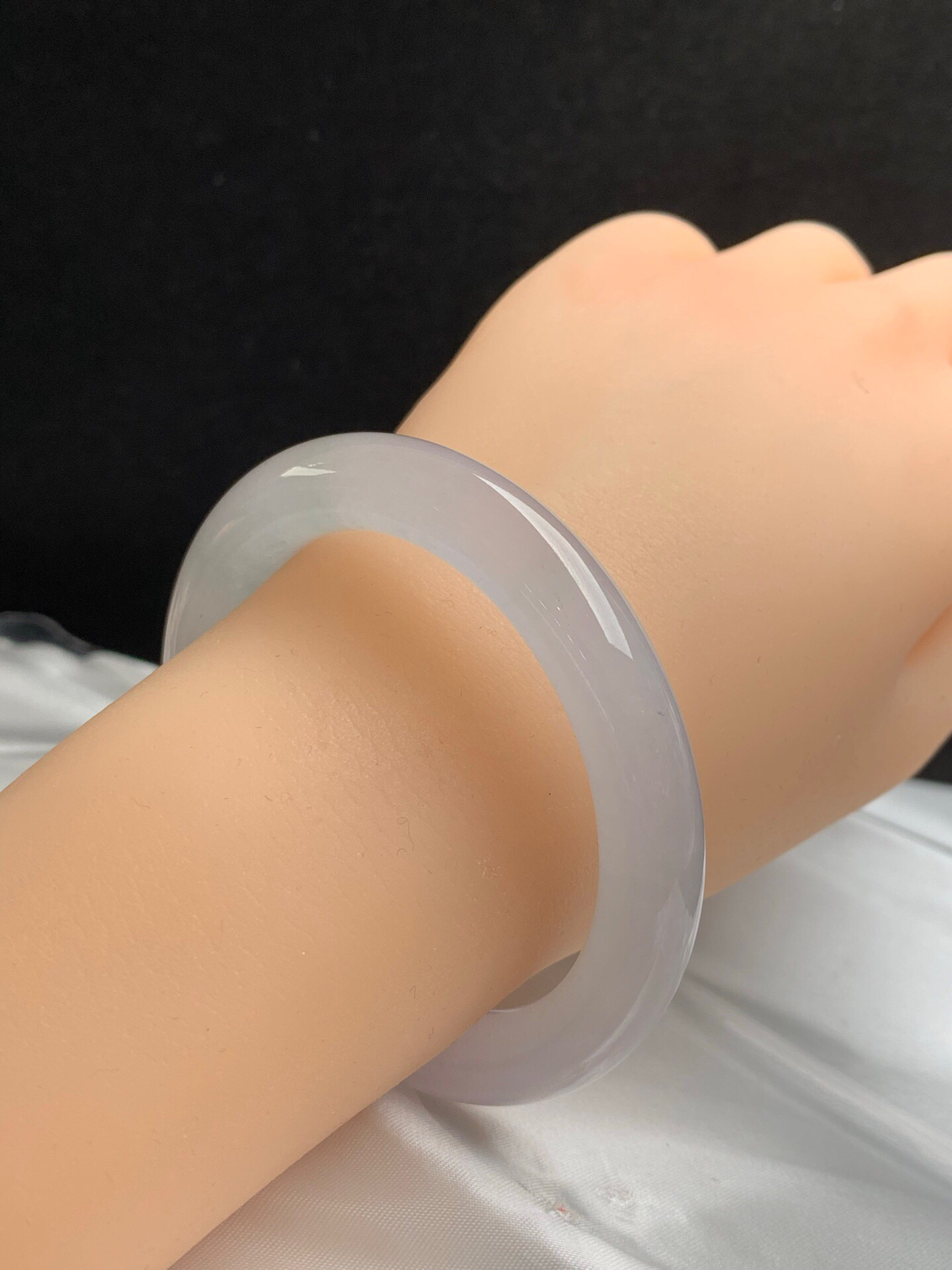 620266,53圈口,冰淡紫圆条美人条,很淡的粉紫色,种老水足,有荧光感,冰润透手