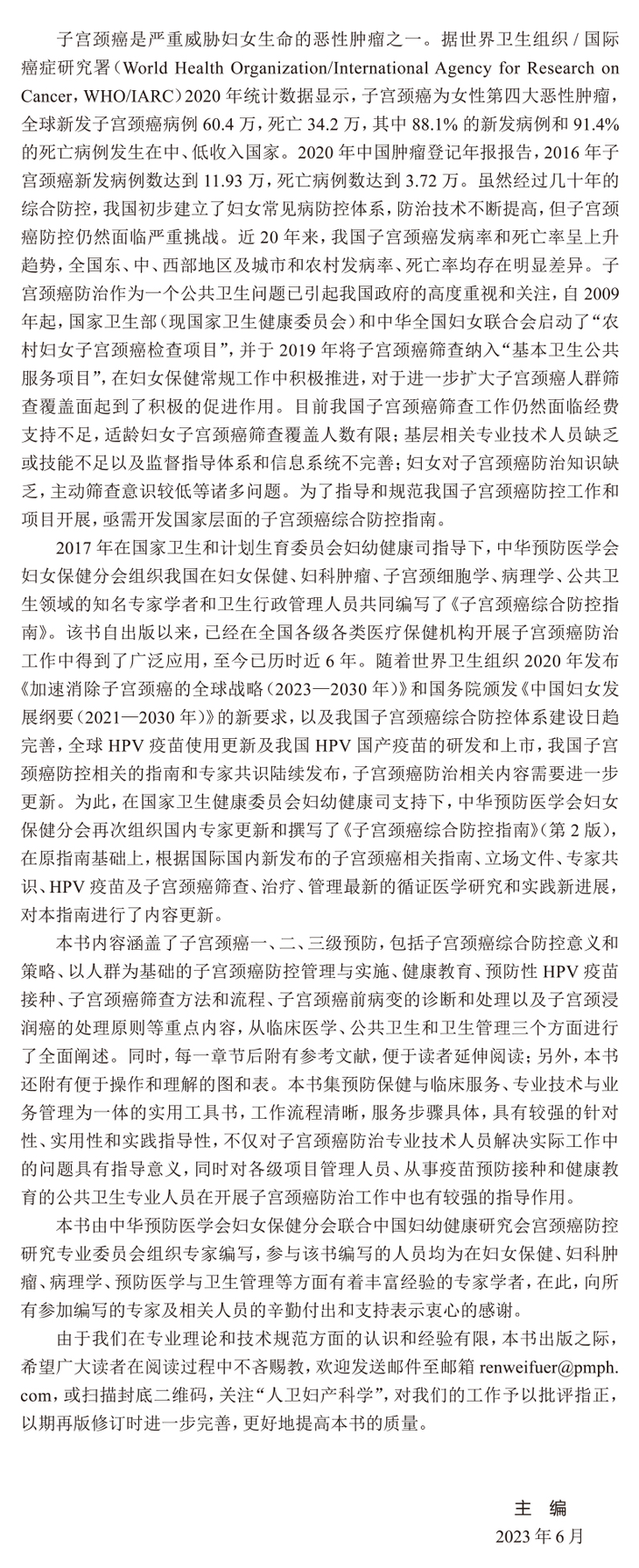 2.在国家卫生健康委员会妇幼健康司支持下,由中华预防医学会妇女保健分会联合妇幼健康研究会宫颈癌防控研究专业委员会为指导和规范我国子宫颈癌防控工作和项目而组织专家编写。