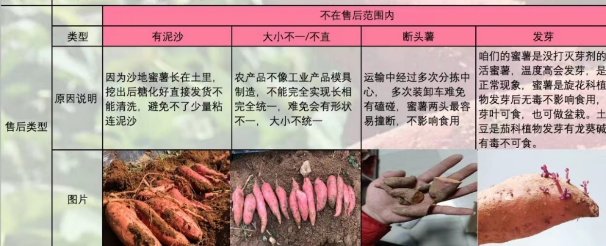 5、有泥沙、大小不一、不直、断头薯、发芽、不及时取货导致的售后,不作为售后理由。地瓜自然生长,没有打膨大剂,所以个头不会那么均匀,到货±2两水分流失属正常现象,不作为售后理由