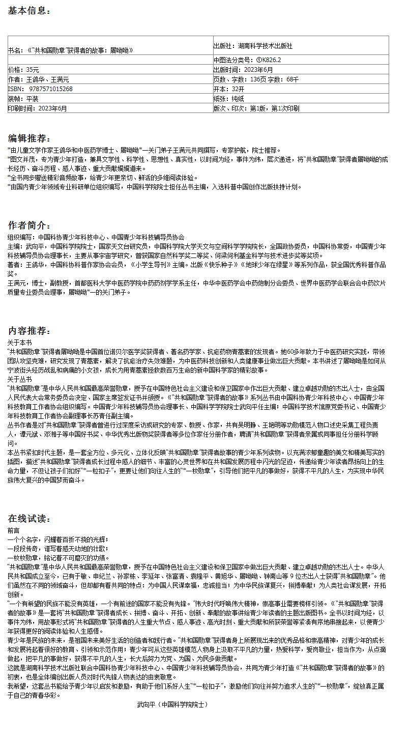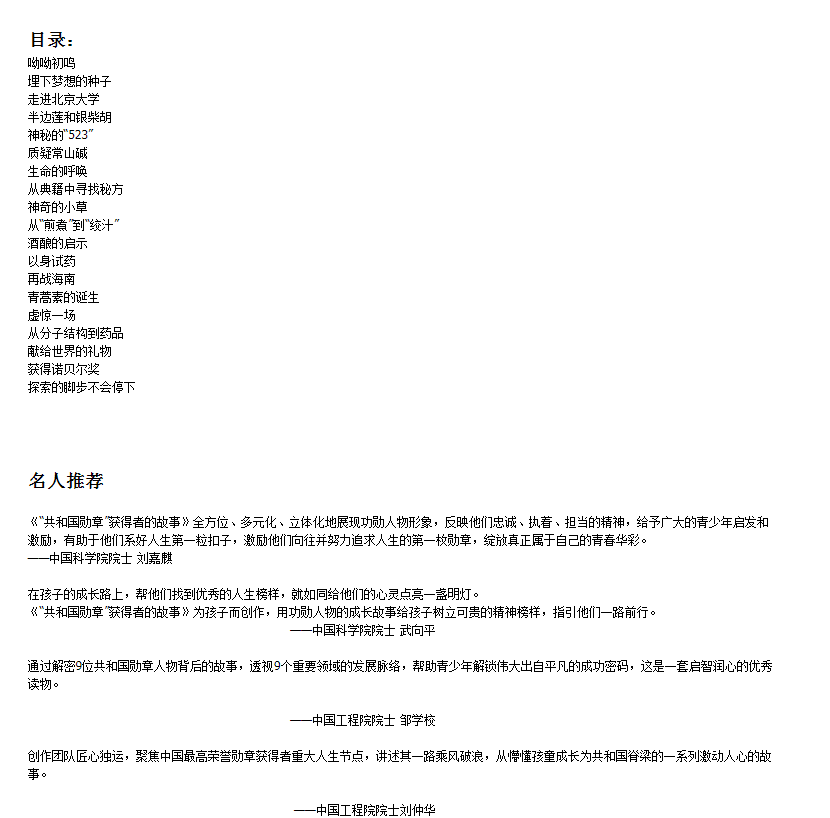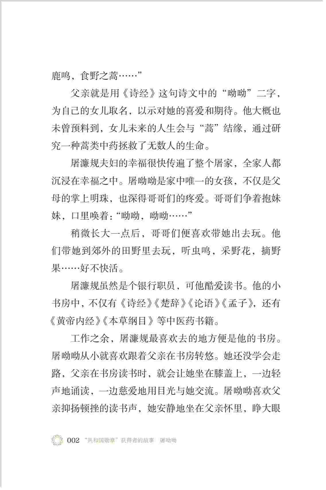 “共和国勋章”获得者的故事:屠呦呦 讲述中国*一位获得诺贝尔奖女科学家的故事。给孩子榜样的力量