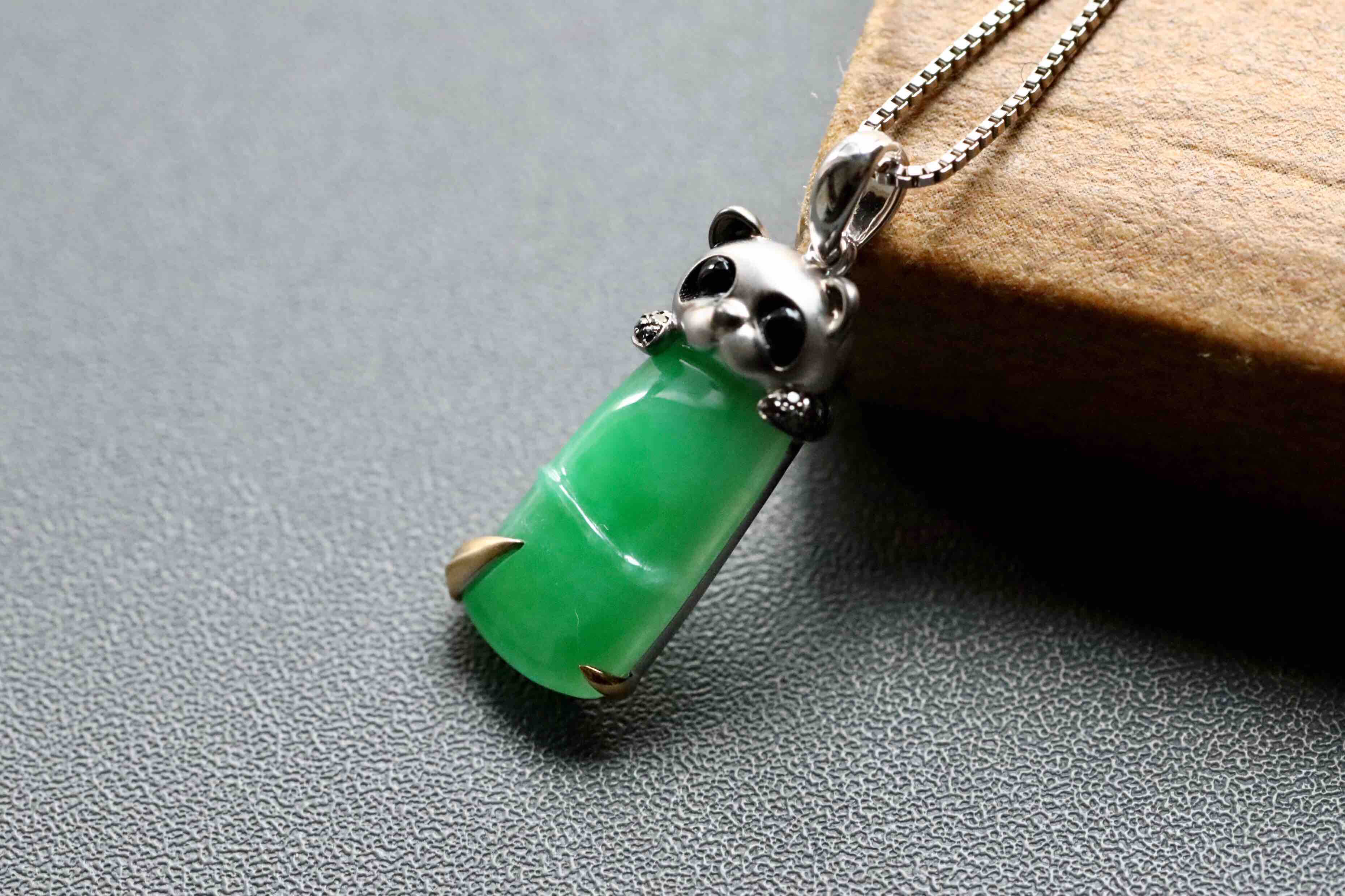 糯冰种阳绿竹报平安节节高升熊猫18k白金黑钻玛瑙镶嵌,有小伙伴问我禄来家原创设计系列的这件宝贝是什么工艺?我跟你讲讲,阳绿翡翠竹节不用介绍了,旁边是18k白金镶嵌,竹叶是18k黄金,熊猫眼睛是手工打磨的黑玛瑙嵌入,熊猫的两只手是黑钻镶嵌,这么小的的一件首饰这么多门道,你在市面上那些大路货里见到过没有?这么有料的宝贝,才四位数,高性价比
