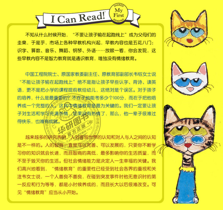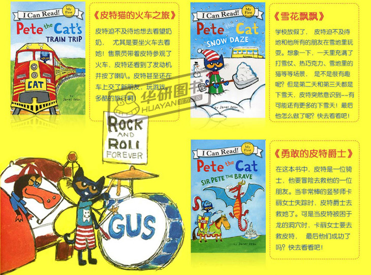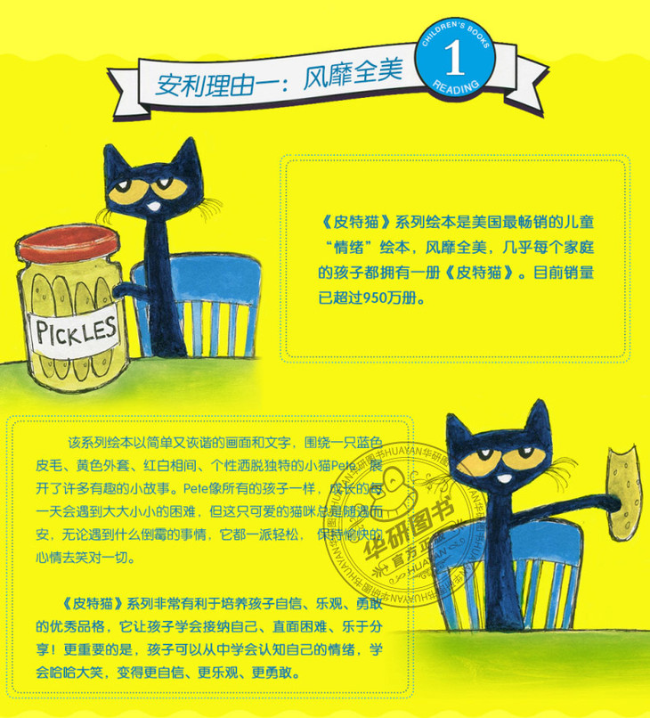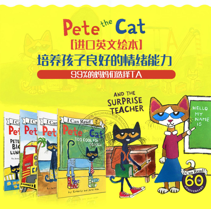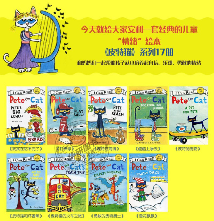 Pete the Cat系列是美国很受欢迎的儿童情绪绘本系列,销量已超过950万册,始终稳居美国亚马逊畅销榜。主人公是一只深蓝色皮毛、黄色外套、红白相间、个性洒脱独特的小猫Pete,通过有趣的故事和多彩的插图,展示了这只小猫变得自信、乐观、勇敢的各种生动故事,让孩子学会接纳自己、直面困难、乐于分享!