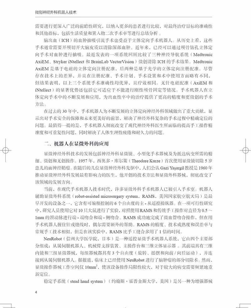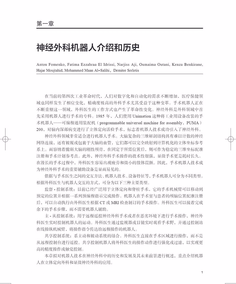 本书介绍了外科机械手(即“机器人”)的技术发展及其在血管内介入、立体定向外科、神经内镜、脊柱外科等手术中的应用,另外介绍了纳米机器人在神经外科中的应用,神经外科手术室中的人工智能和物联网,自动机械扶手和外骨骼,神经外科机械手模拟培训中的增强现实和虚拟现实等内容。