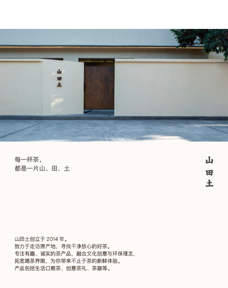 山田土是一个茶品牌。致力于走访茶区,寻找地方茶。亲眼看,亲口尝,将心比心挑选优质原料、把关工艺、审评质量,以有趣的方式呈现一杯干净好茶,让你饮用安心,感官愉悦。 产品包括:日常口粮茶,节庆茶礼,茶器