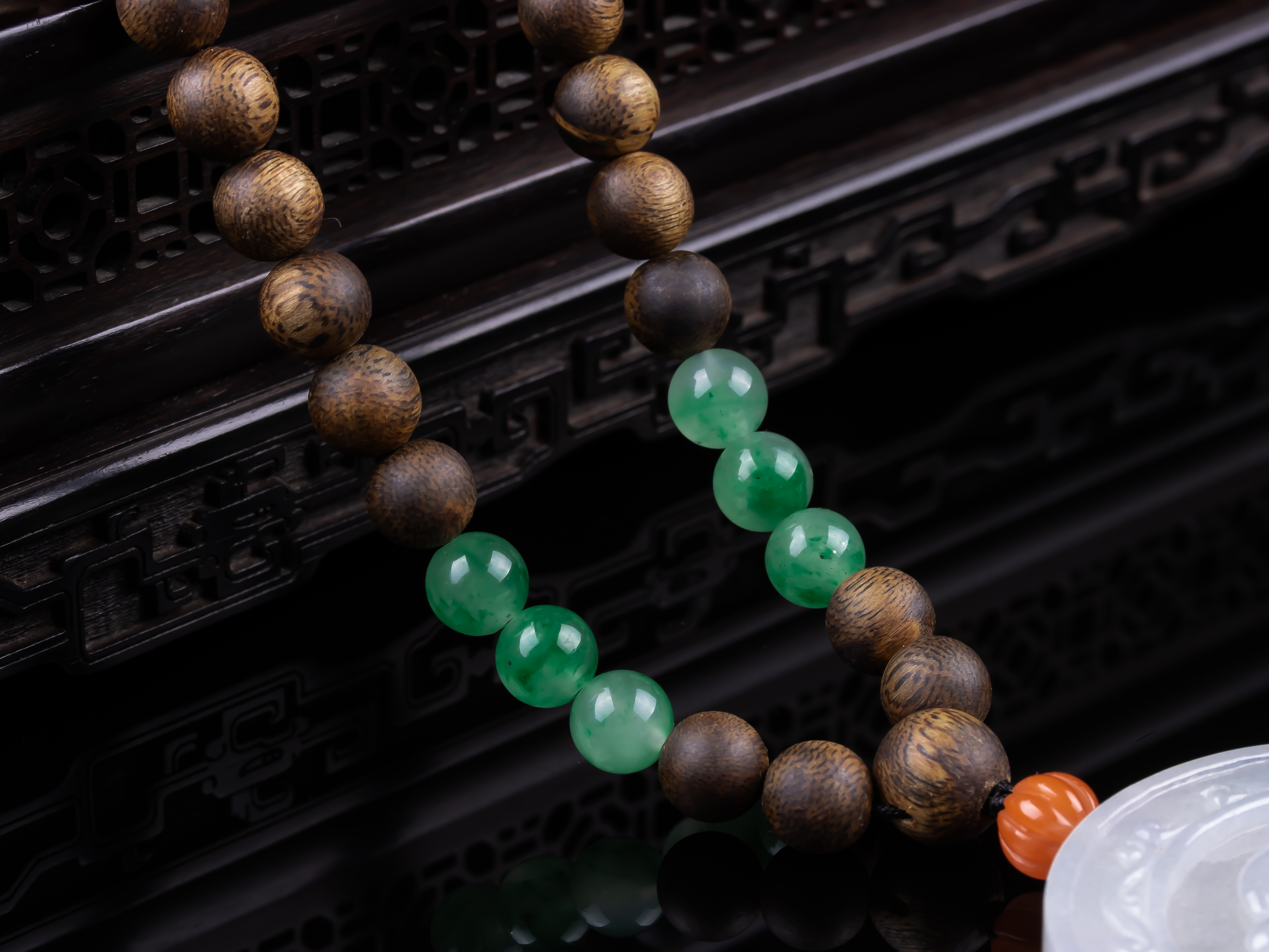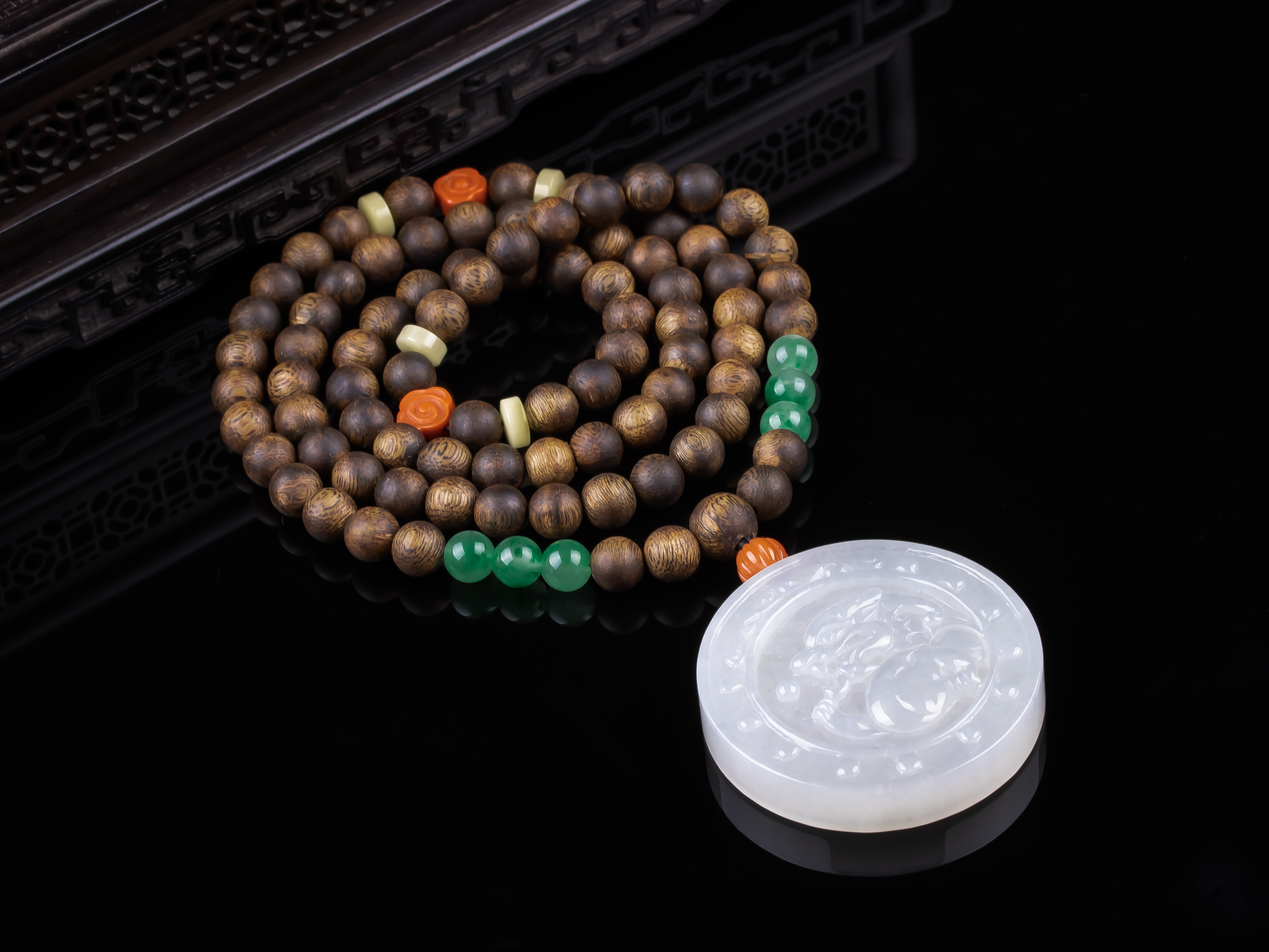 XY0249,沉香+复古龙圆牌挂件,天然沉香约8.4mm,原色原味,香味自然清甜,搭配非洲翠、南红瓜珠祥云、蜜蜡,一个冰糯底的翡翠大圆牌51*10.2mm,底子冰润细腻,上雕刻一条仿古神龙,非常厚庄大气,神龙护主,龙行天下,风生水起,是保吉祥、招财富的上古神兽。