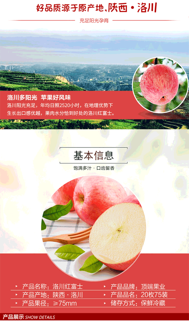 【正宗洛川苹果】顶端果业陕西洛川红富士苹果20枚75mm中果 脆甜多汁
