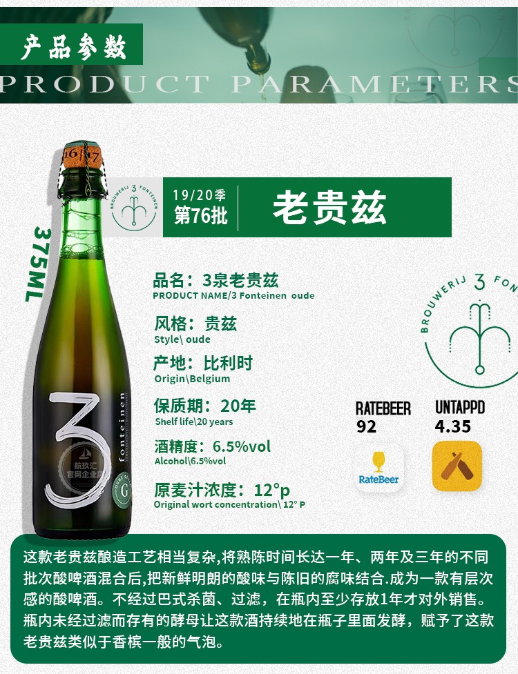 【冷库储存】比利时 3泉老贵兹水果兰比克啤酒 375ml 6.5%vol