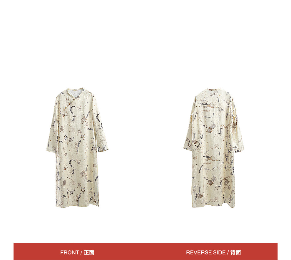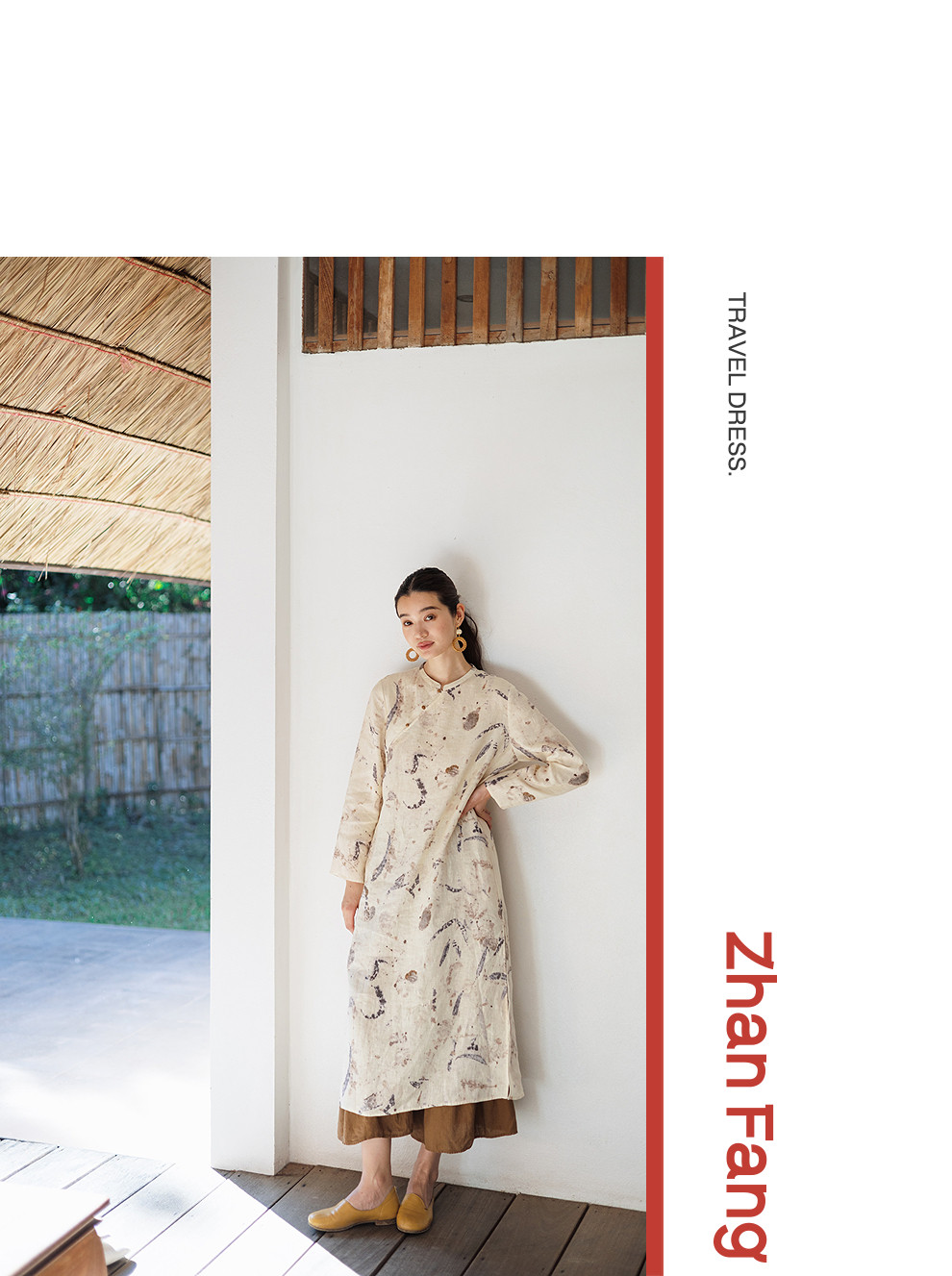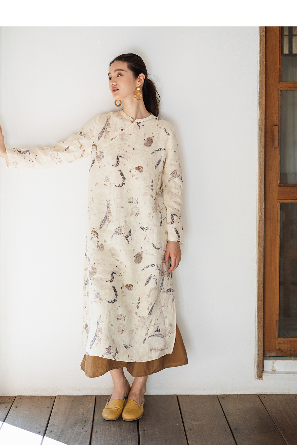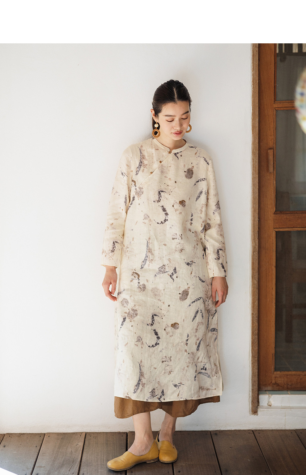 绽放155朵/亚麻数码印花新中式立领斜襟长袖连衣裙女阔感文艺长裙