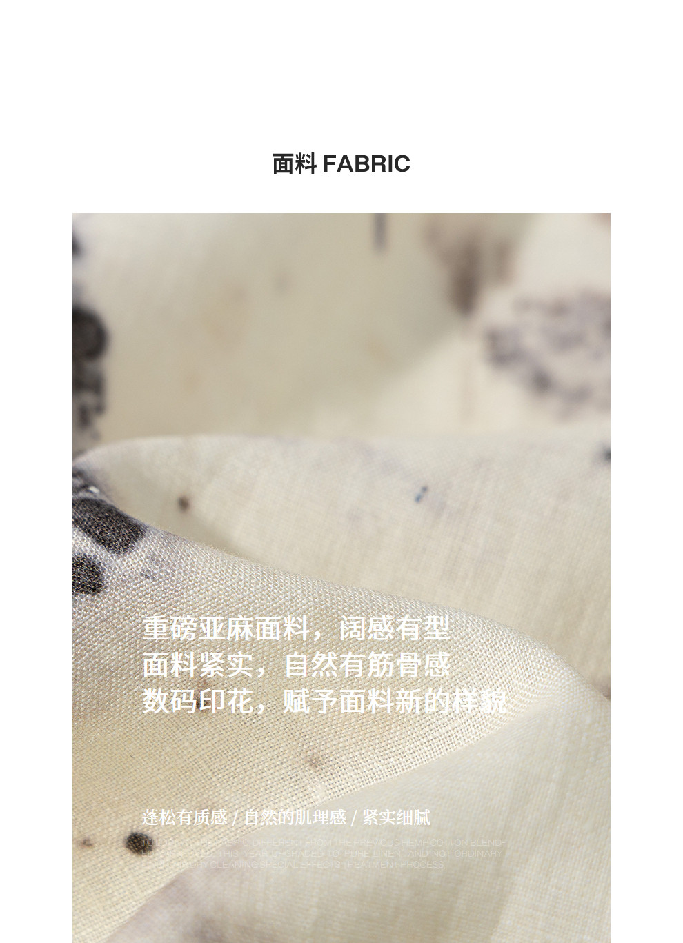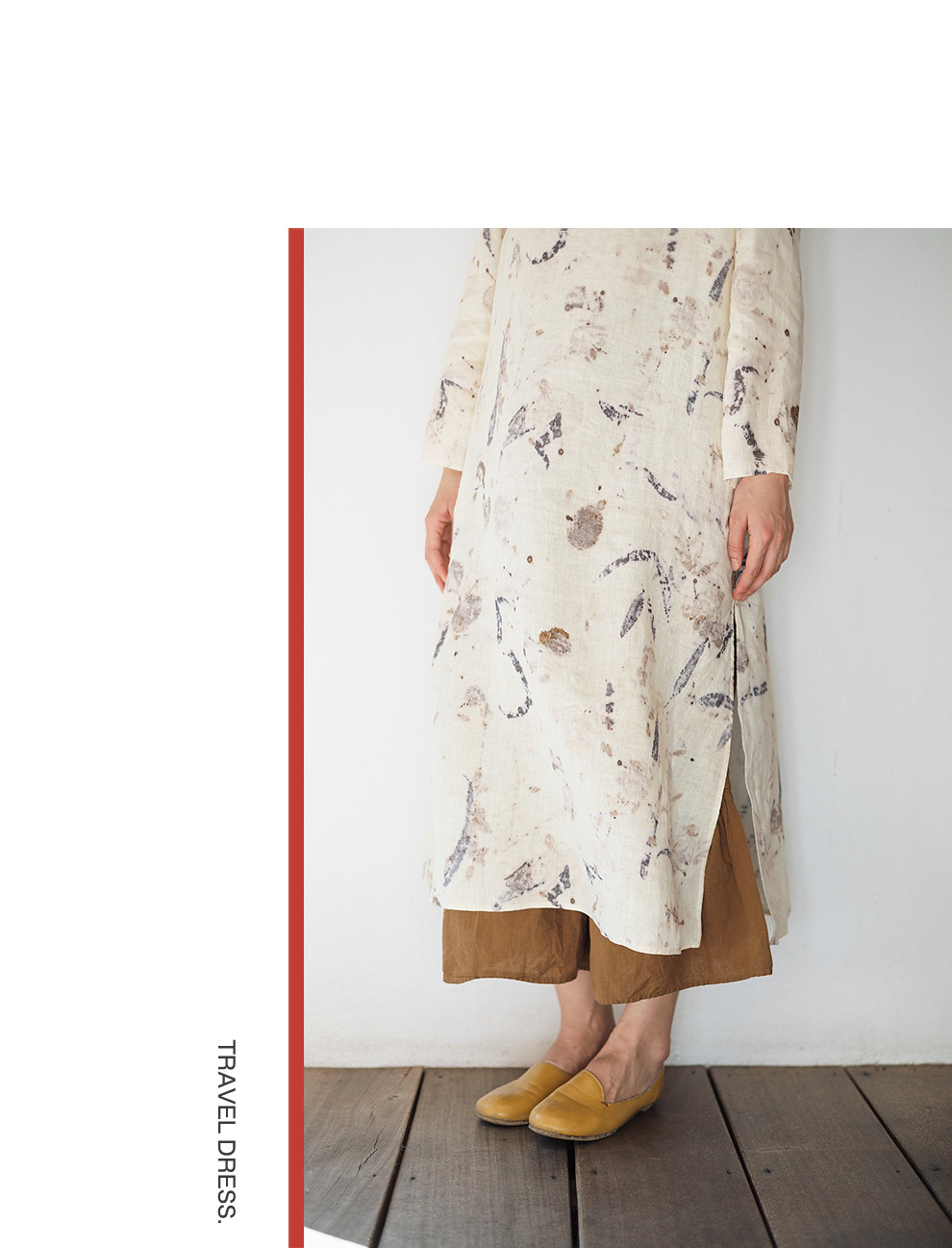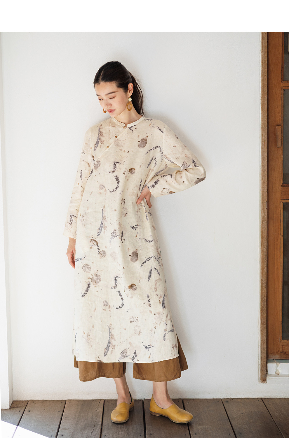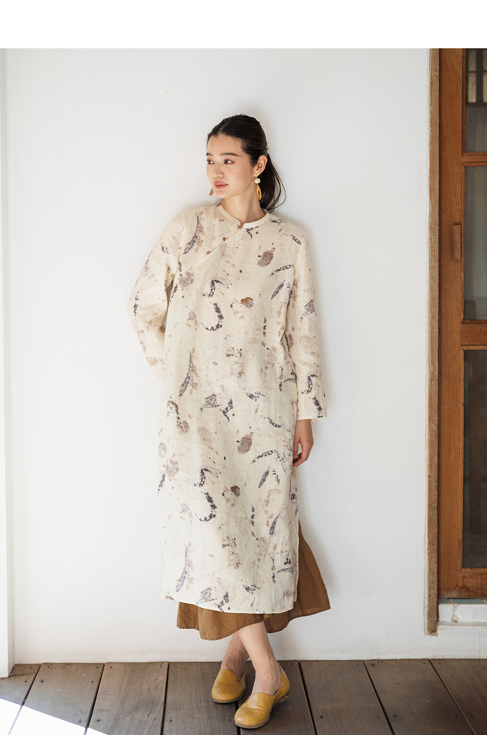 绽放155朵/亚麻数码印花新中式立领斜襟长袖连衣裙女阔感文艺长裙