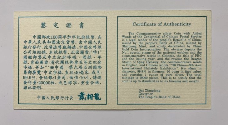 邮电部于1996年5月18日发行《1996年中国-第九届亚洲国际集邮展览》纪念邮票小型张一枚,中国人民银行发行加字币一枚。为此中国集邮总公司和中国金币总公司联合发行银币封一套。