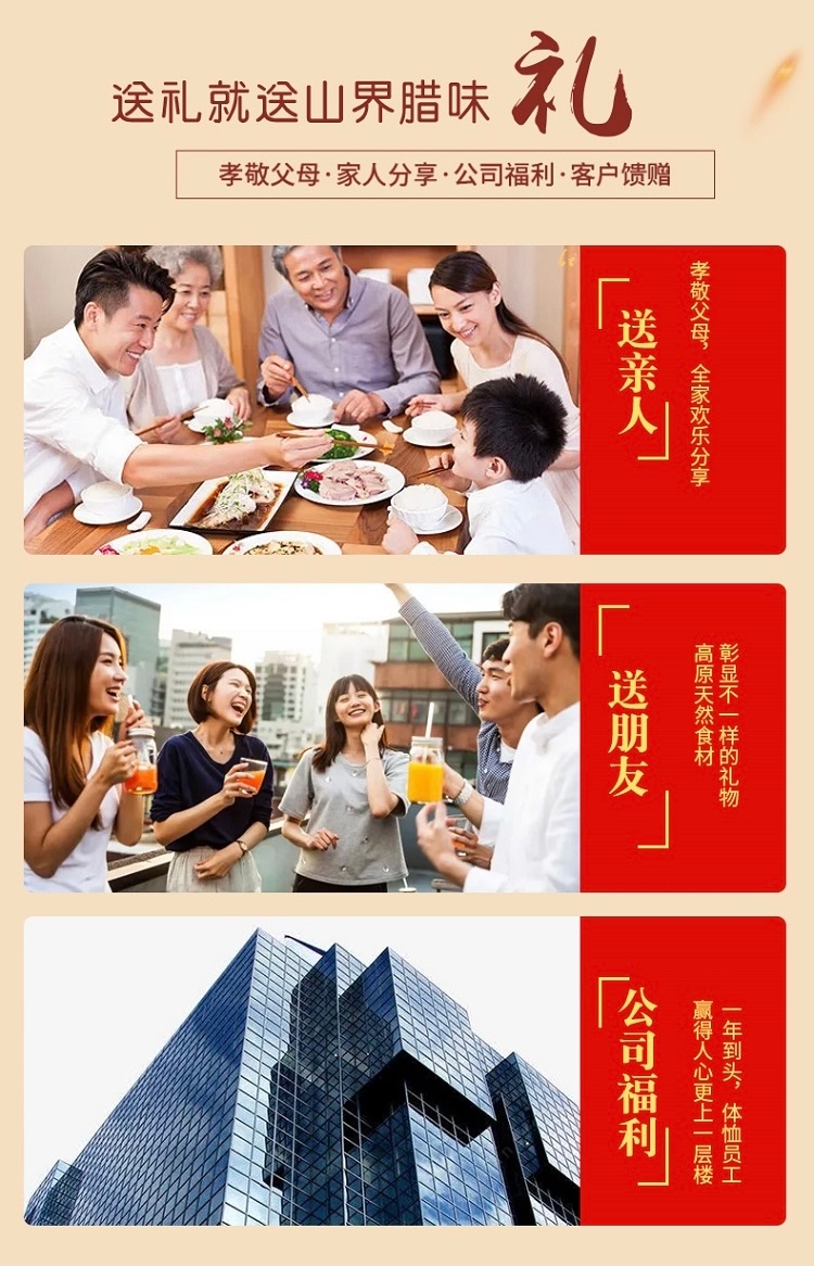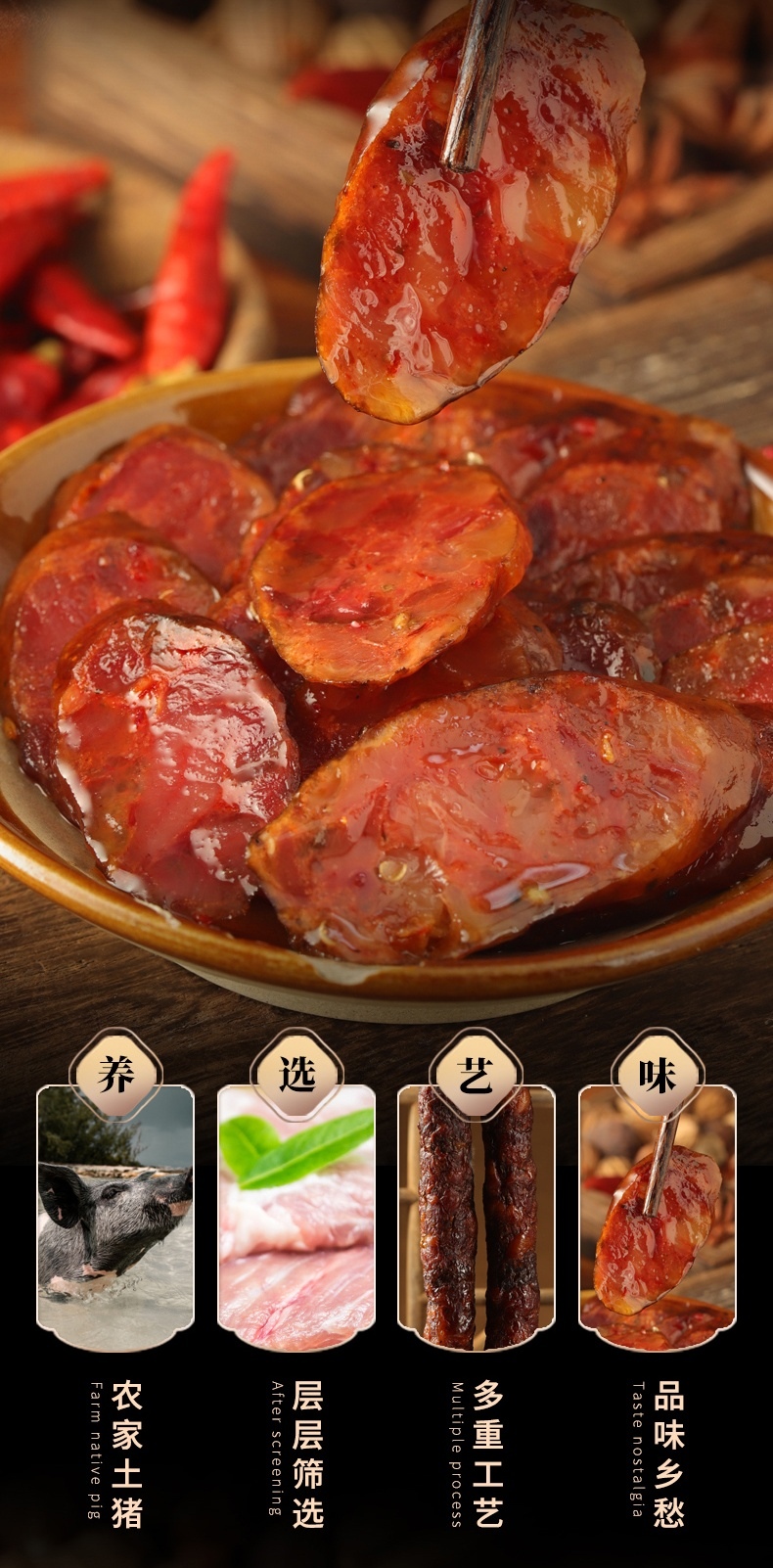 套餐八:十全十美腊味组合装,包含:川味香肠500g+广味香肠500g+酱腊肉500g+烟熏腊肉500g+腊猪耳2只装(300-350g)+腊猪蹄1只装(300-350g)+腊牦牛舌1条装(500g-550g)+腊猪拱嘴1只装(350g-400g)+腊猪尾2条装(200g-250g)+腊排骨500g