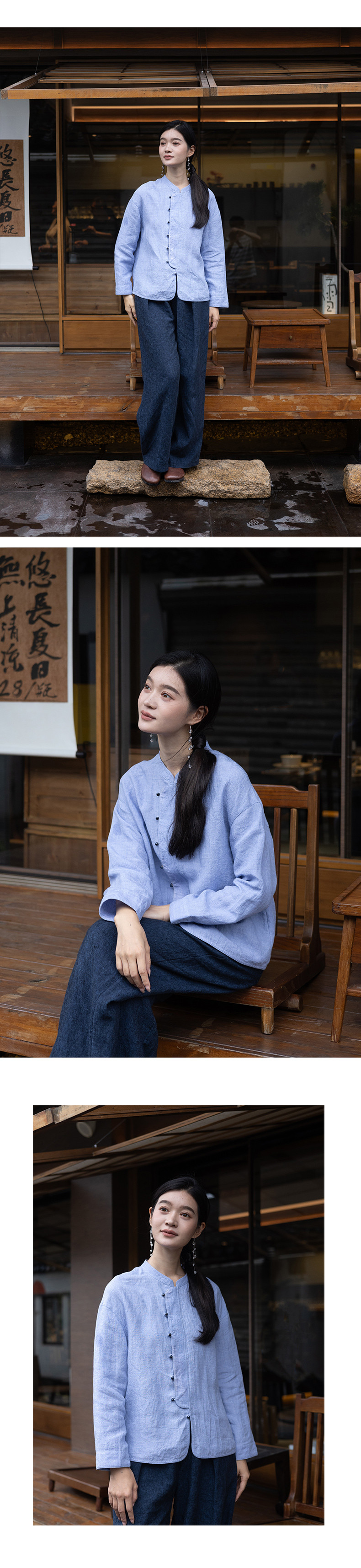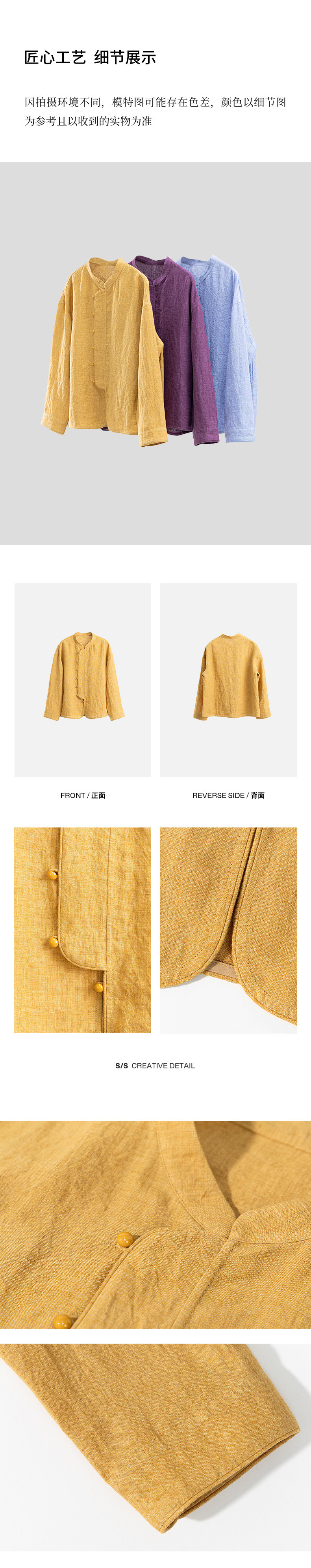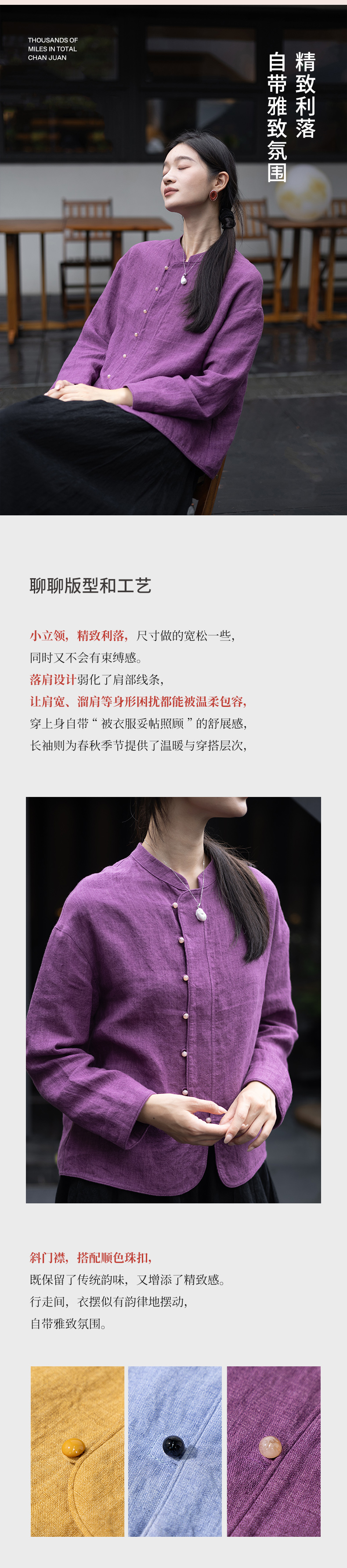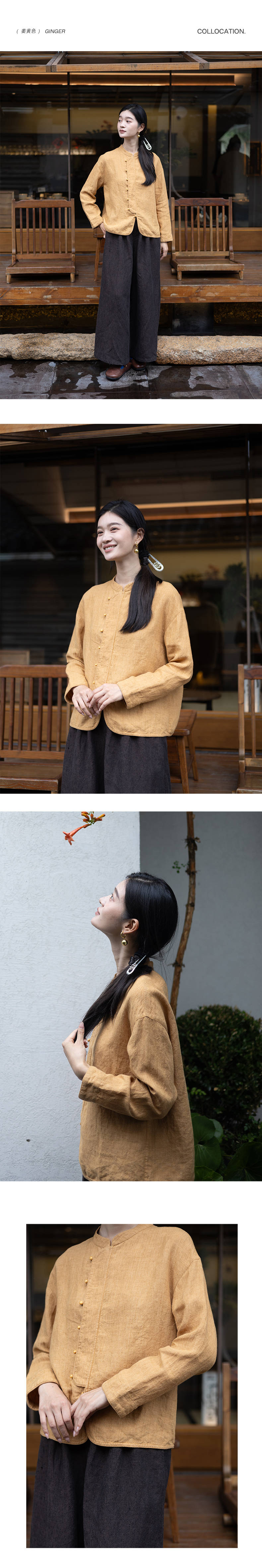 特绽放619朵/色织亚麻立领斜襟系扣落肩文艺长袖新中式衬衫女衬衣