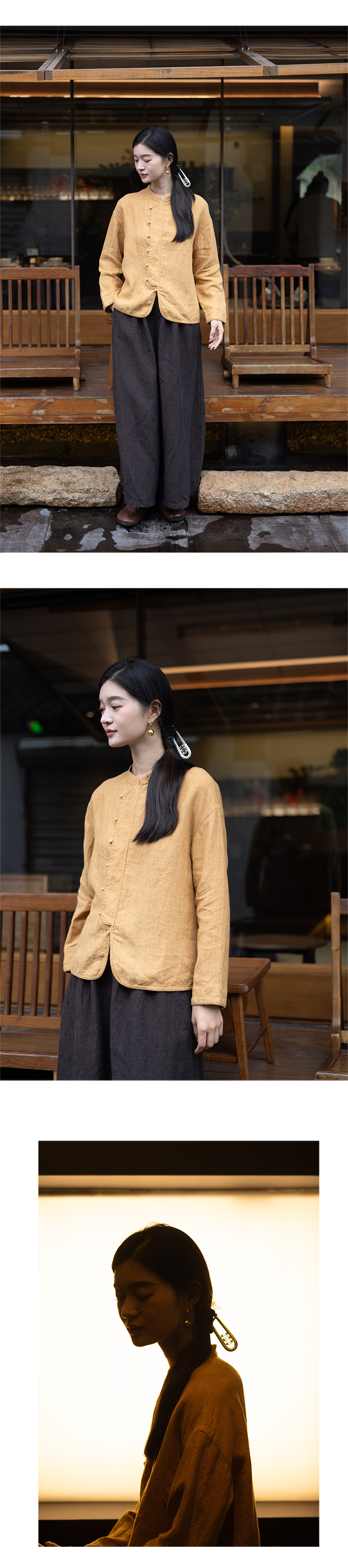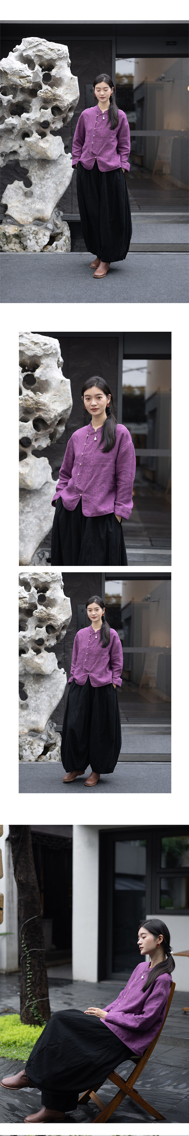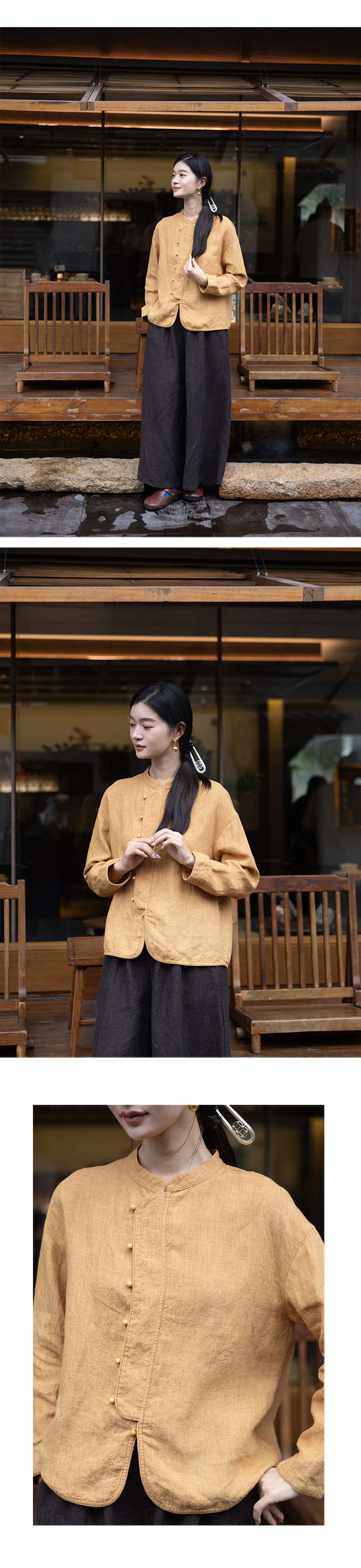 特绽放619朵/色织亚麻立领斜襟系扣落肩文艺长袖新中式衬衫女衬衣