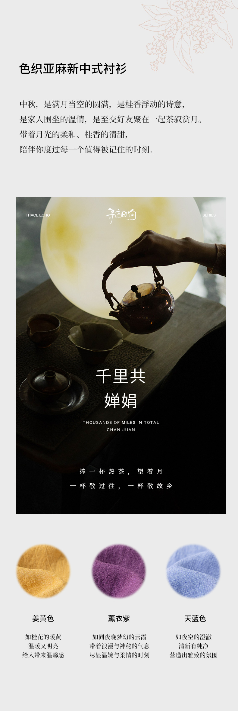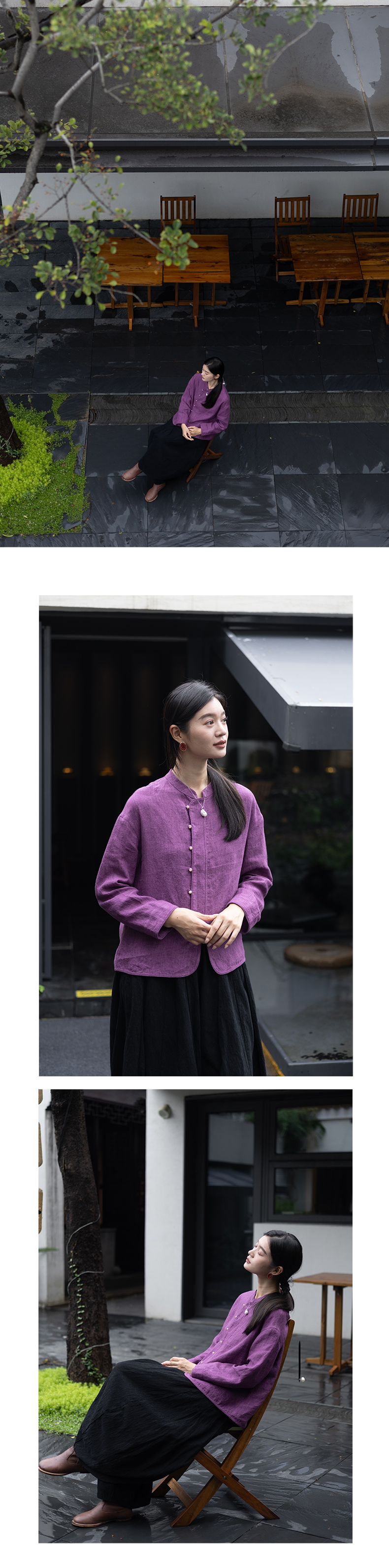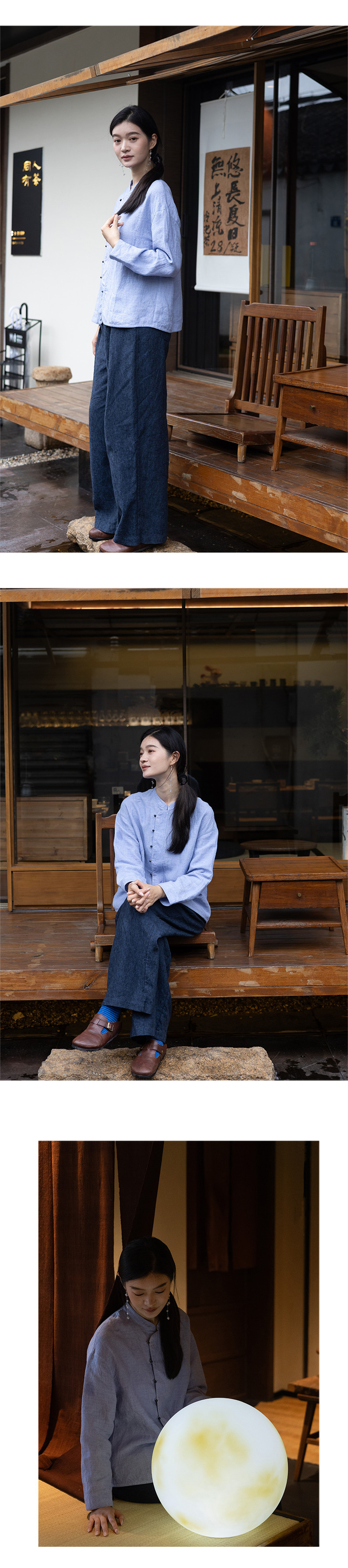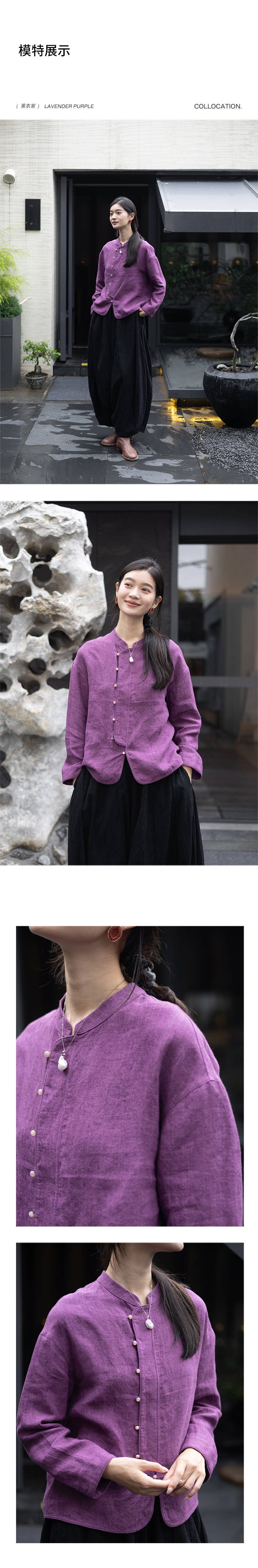 特绽放619朵/色织亚麻立领斜襟系扣落肩文艺长袖新中式衬衫女衬衣