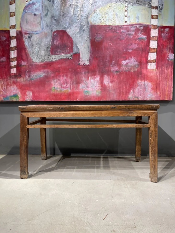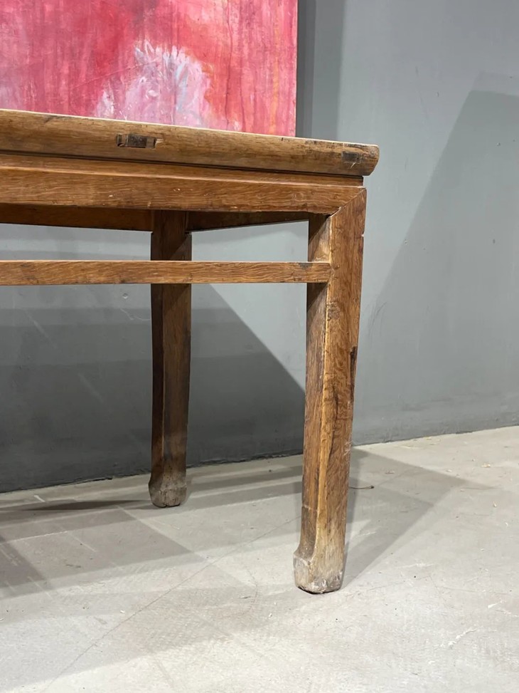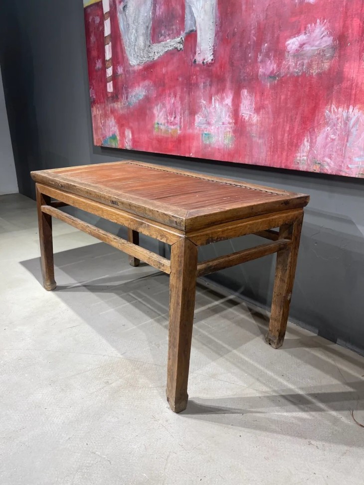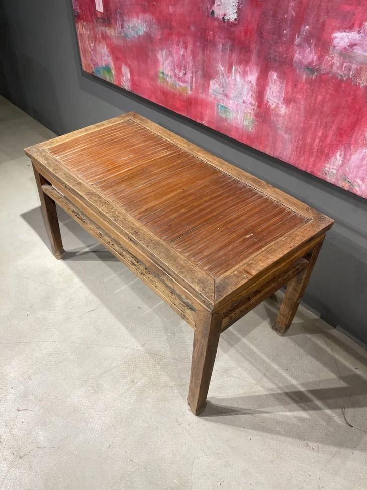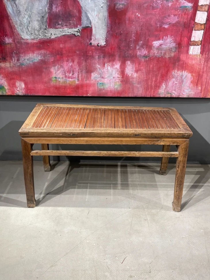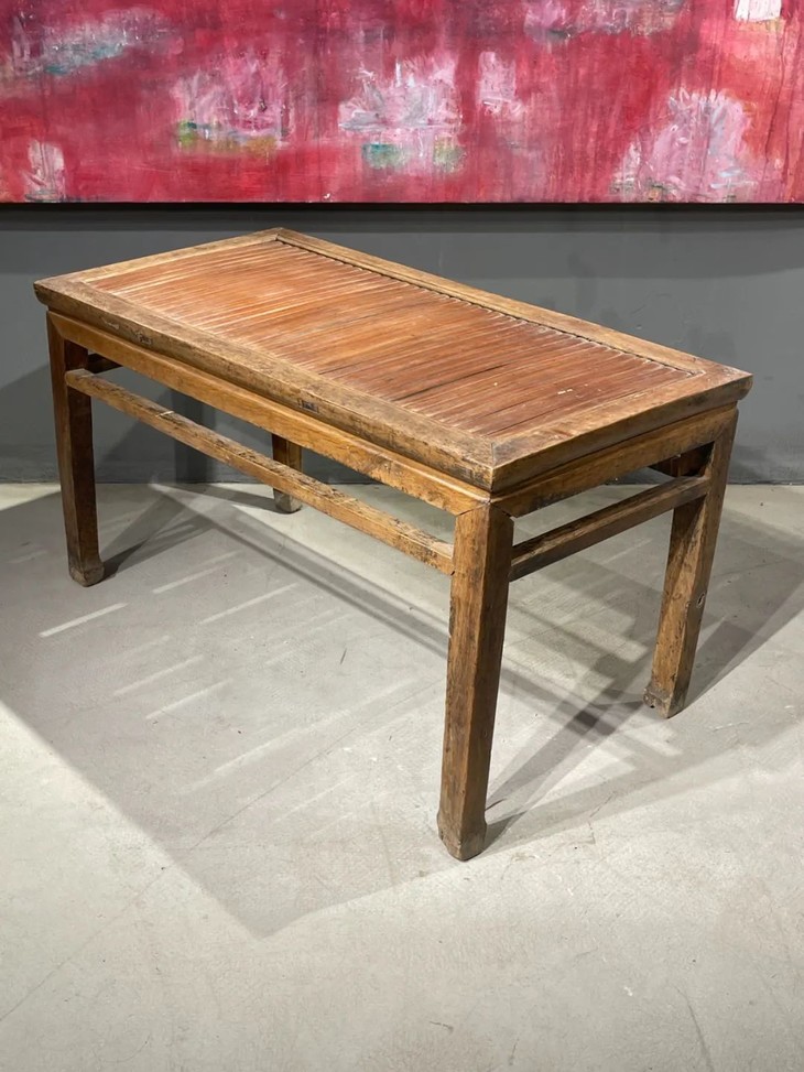 这是一件传统榆木搭配竹片制作而成的高端家具长方型矮桌,明式家具榫卯结构榆木长方矮桌,上方桌面镶嵌竹片。延续数百年的明式家具传统造型,隼卯结构坚硬厚实榆木结构,桌面竹片逾百年温润油亮的包浆皮壳,型式典雅、比例合谐,用料考究,华丽贵气,整体为传统简约贵气的明式风格,榆木纹理清晰,是清代或是更早的高端明式家具,可融入当代空间增色添彩。此竹片桌面长方型榆木矮桌取材精良,传统技艺精湛,形式貴氣华丽,构造厚实坚固,历经百年的使用后,仍然稳当如新。此竹片桌面长方型榆木矮桌,如图所示,一条桌腿底部有虫蛀孔、表面有轻微磨损外,保存基本完好,是现代生活中可以摆设与充当收藏品展示架的老明式家具。尺寸:长:97.5厘米;宽度:49.0厘米;高度:53厘米;重量约13千克
