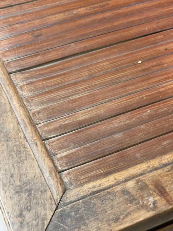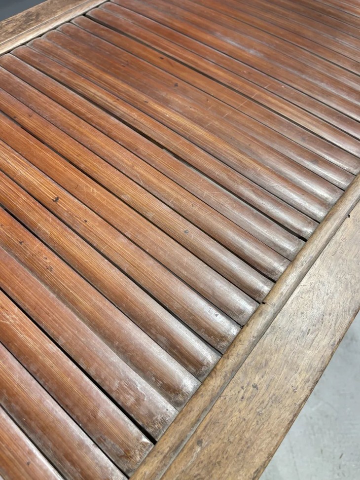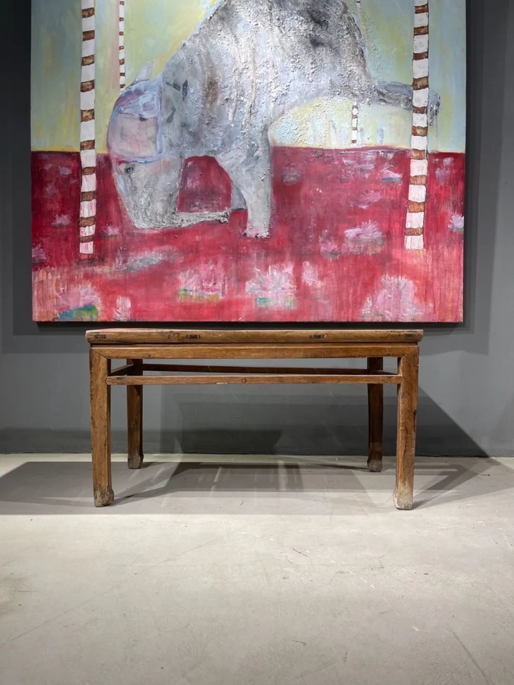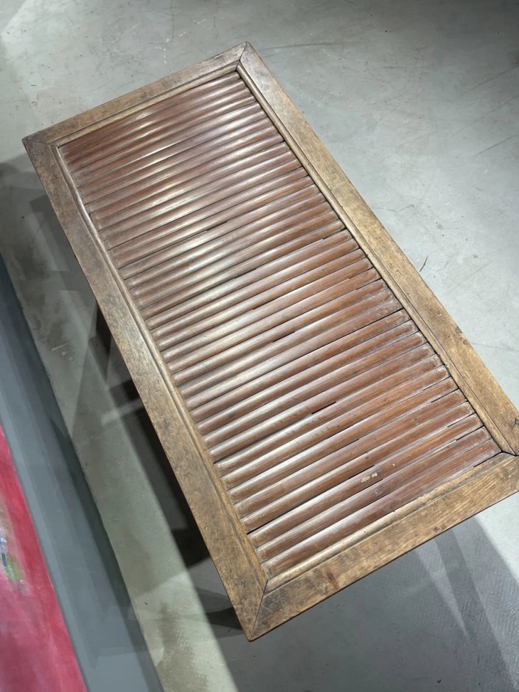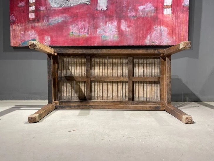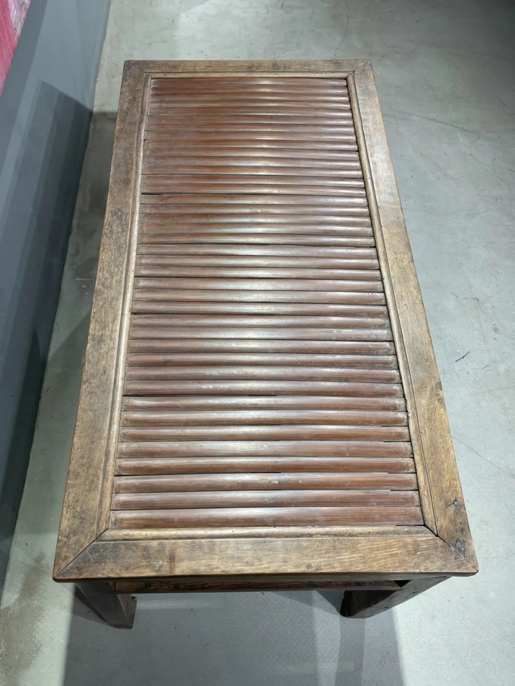 这是一件传统榆木搭配竹片制作而成的高端家具长方型矮桌,明式家具榫卯结构榆木长方矮桌,上方桌面镶嵌竹片。延续数百年的明式家具传统造型,隼卯结构坚硬厚实榆木结构,桌面竹片逾百年温润油亮的包浆皮壳,型式典雅、比例合谐,用料考究,华丽贵气,整体为传统简约贵气的明式风格,榆木纹理清晰,是清代或是更早的高端明式家具,可融入当代空间增色添彩。此竹片桌面长方型榆木矮桌取材精良,传统技艺精湛,形式貴氣华丽,构造厚实坚固,历经百年的使用后,仍然稳当如新。此竹片桌面长方型榆木矮桌,如图所示,一条桌腿底部有虫蛀孔、表面有轻微磨损外,保存基本完好,是现代生活中可以摆设与充当收藏品展示架的老明式家具。尺寸:长:97.5厘米;宽度:49.0厘米;高度:53厘米;重量约13千克
