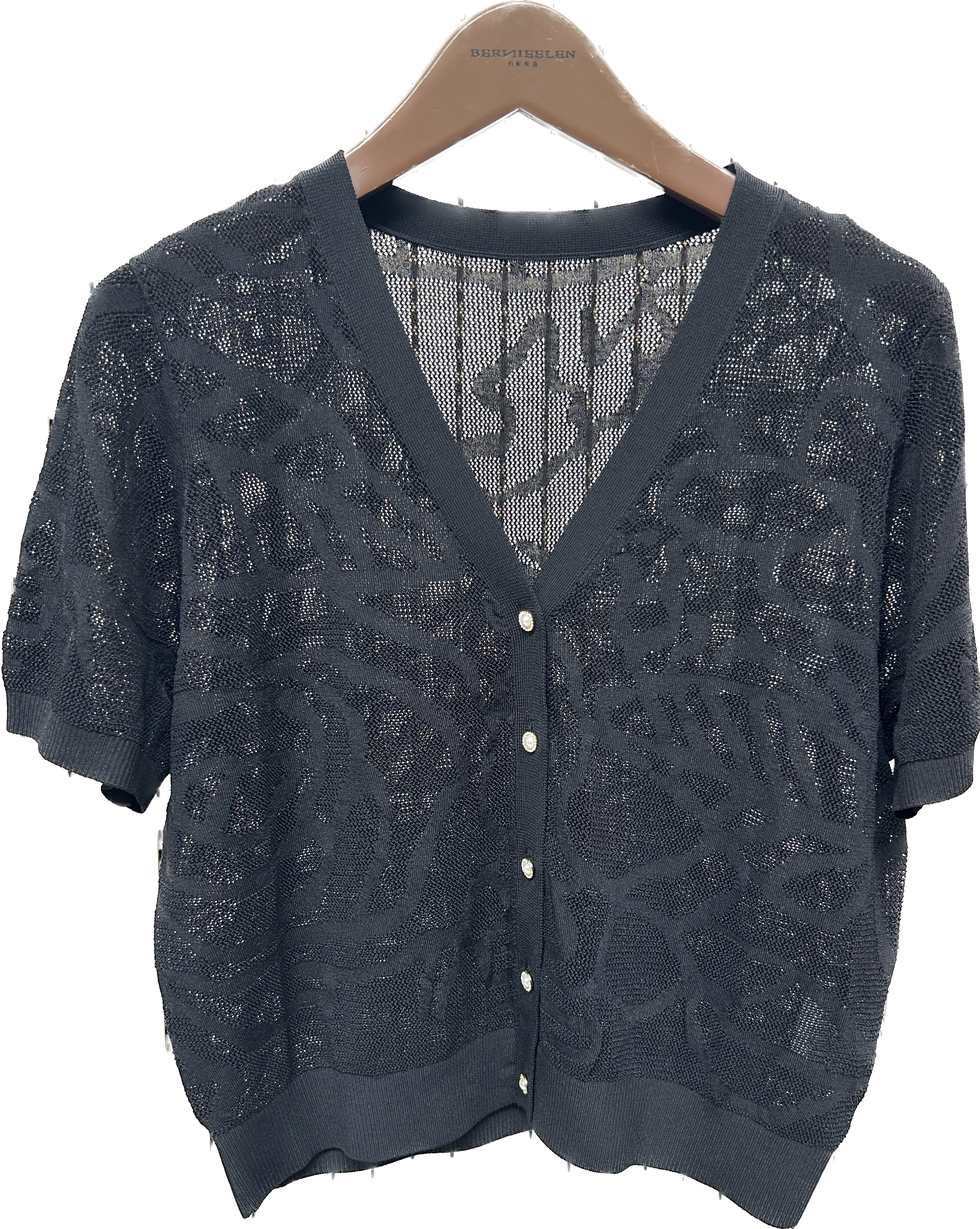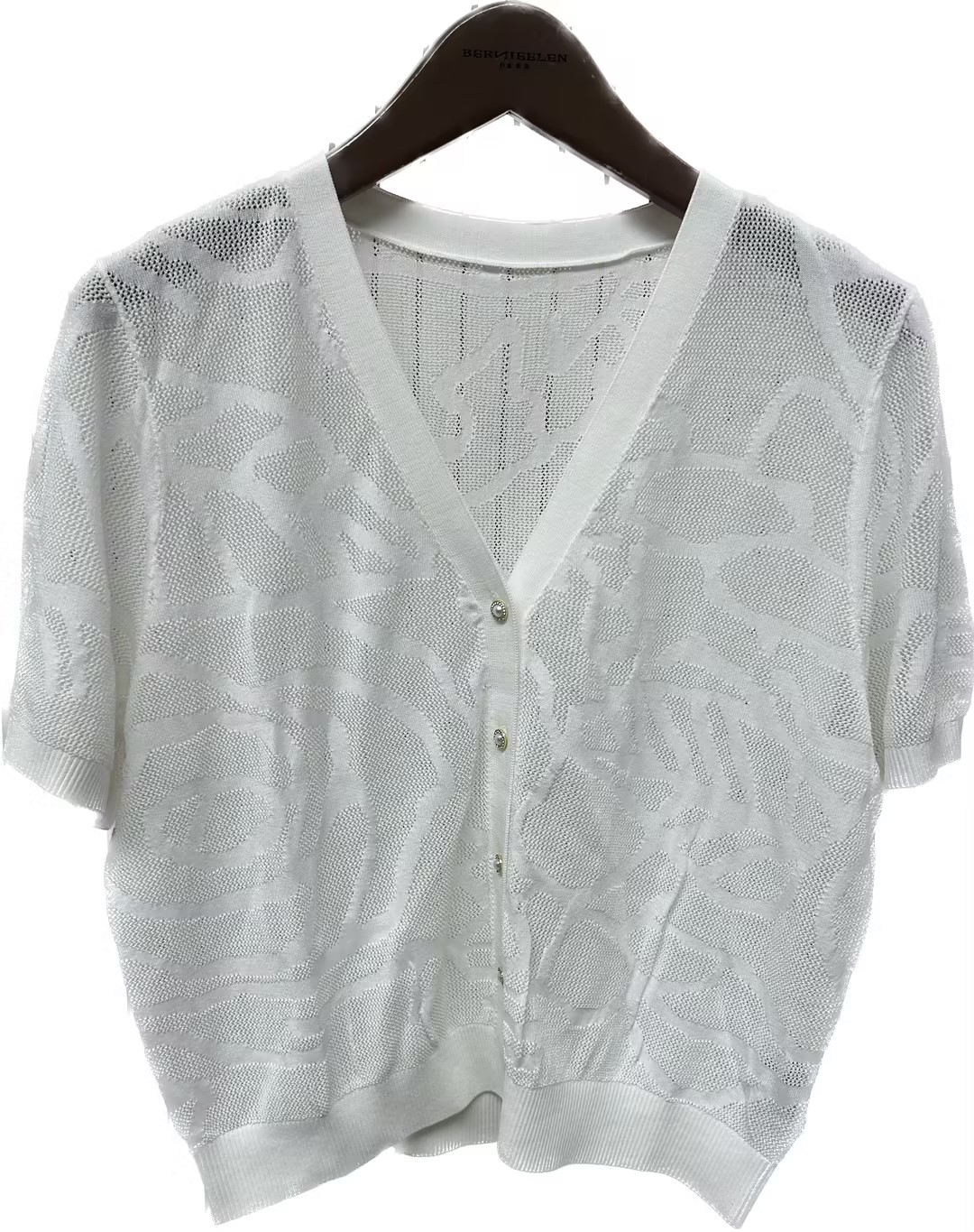 HJ2EA01_皓色 / 漆黑色_针织衫_春夏_复古提花镂空 V 领短袖单排扣显瘦通勤气质开衫_高级女装_BERNIEELEN 伯妮斯茵