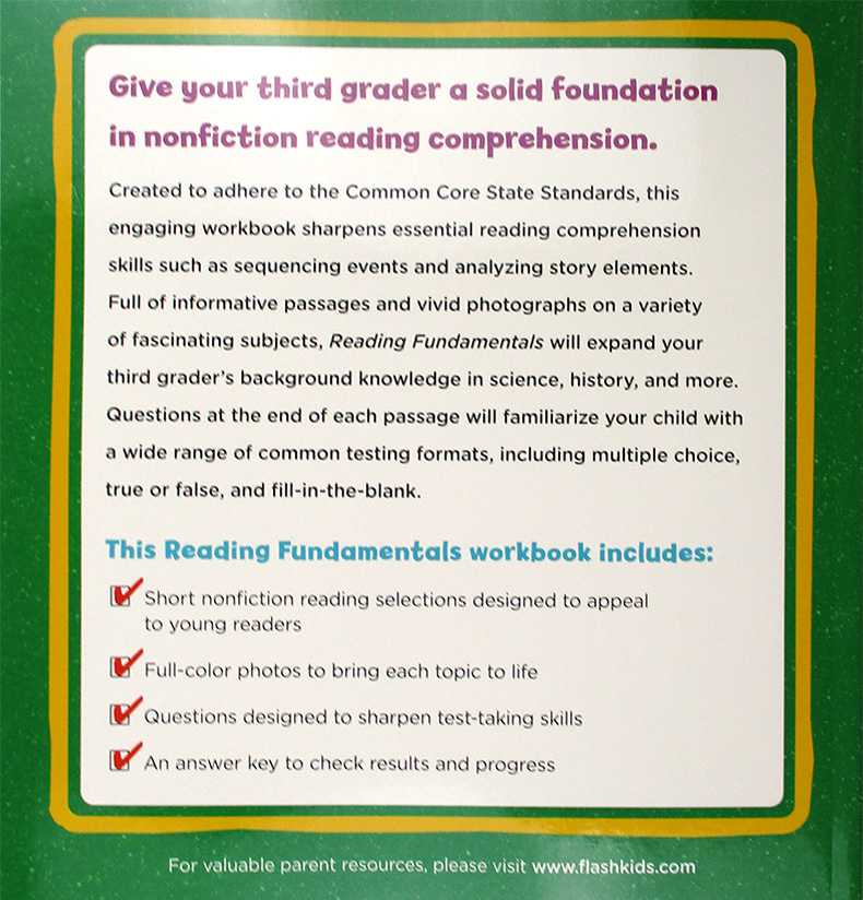 Start kids off right with reading--and keep them on track with this colourful, engaging workbook! It combines fascinating topics, eye-catching photographs, and a bright, appealing design children will love. Created to adhere to the Common Core Curriculum standards that most US states have adopted, 'Reading Fundamentals: Grade 3' presents young readers with nonfiction passages that cover a range of topics, including science, history, and geography. After each passage, a range of questions--fill-in-the-blank, short answer, true/false, multiple choice, and matching--test key comprehension skills.