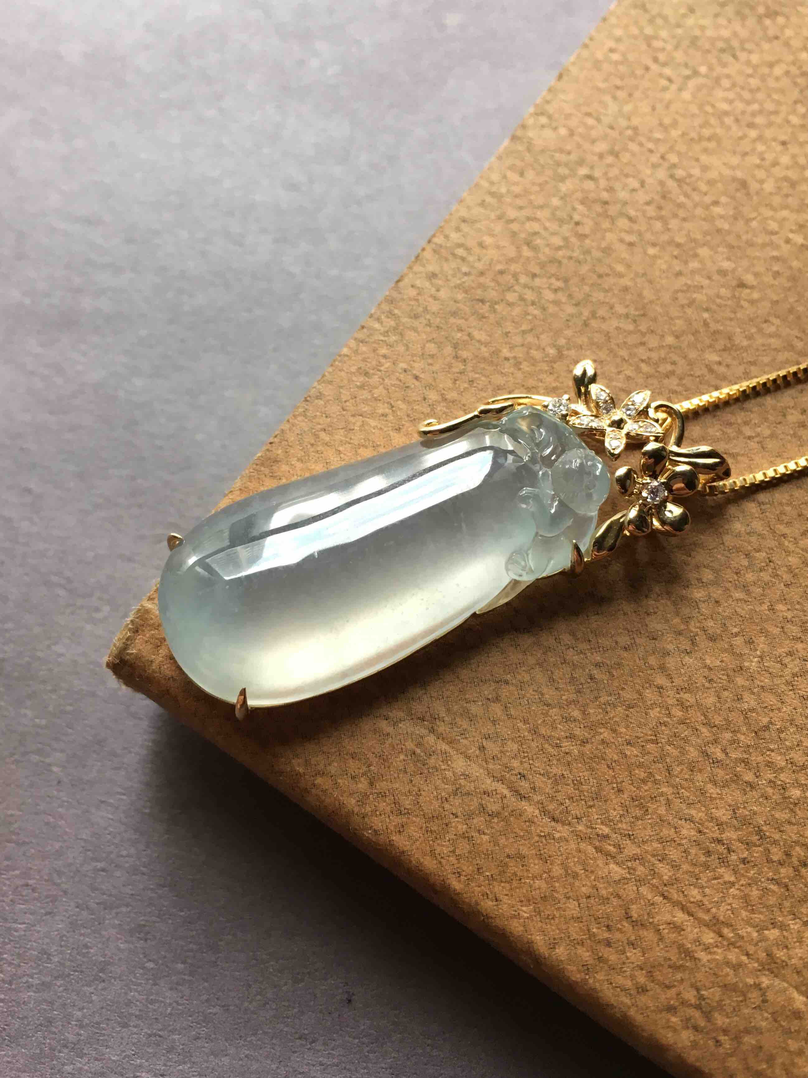像灯管一样的高冰种厚庄翡翠福瓜,33.4×15.3×8.3mm,镶嵌后42.4×15.3×8.4mm,拿在手里沉甸甸的,最近好喜欢的一颗福瓜,太贵气了,荧光四射的种水,光面无雕,圆润厚实的造型,特别纯粹,高级的宝贝应有的样子,顶部巧雕一个小猴,灵猴献瑞,福寿双全,雕工有多精美,最后一图看细节,18k黄金钻石镶嵌,翡翠禄来原创设计系列,一件不可多得的精品,推荐