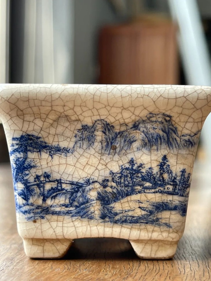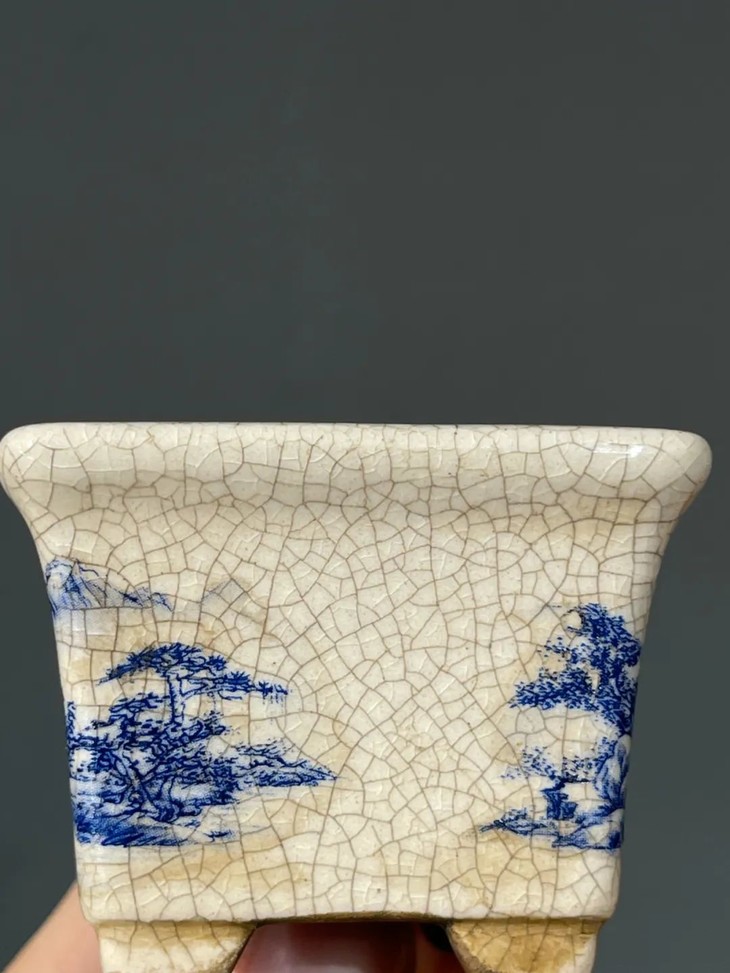 开片瓷青花绘山水四方花盆
