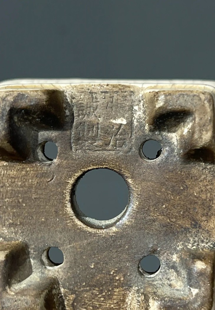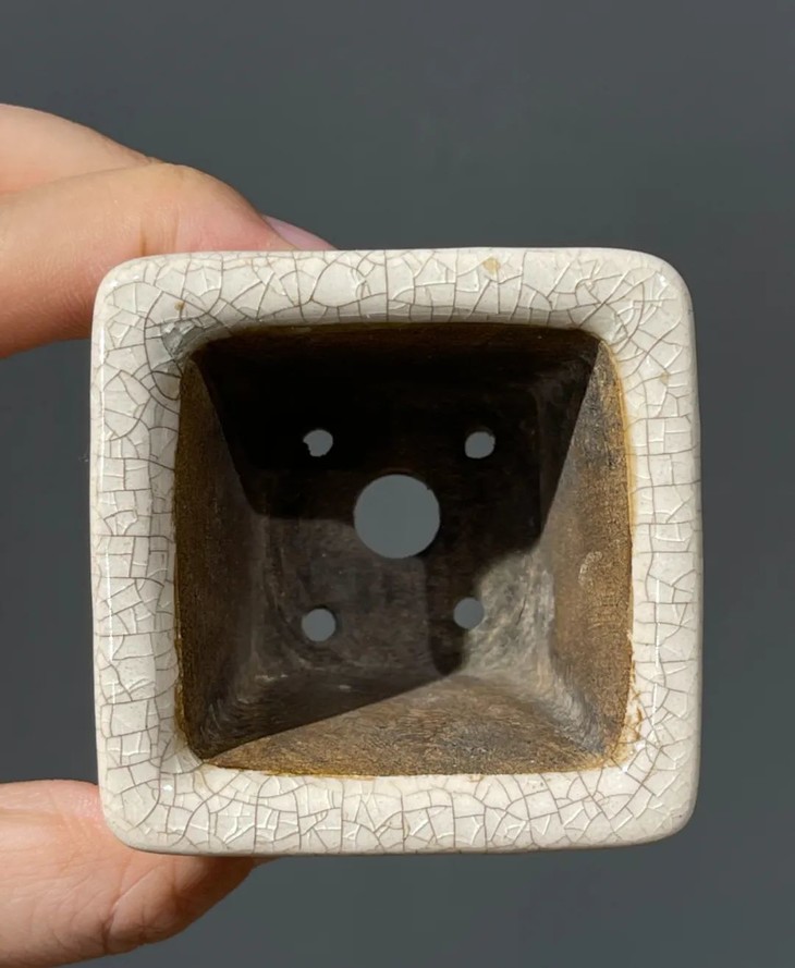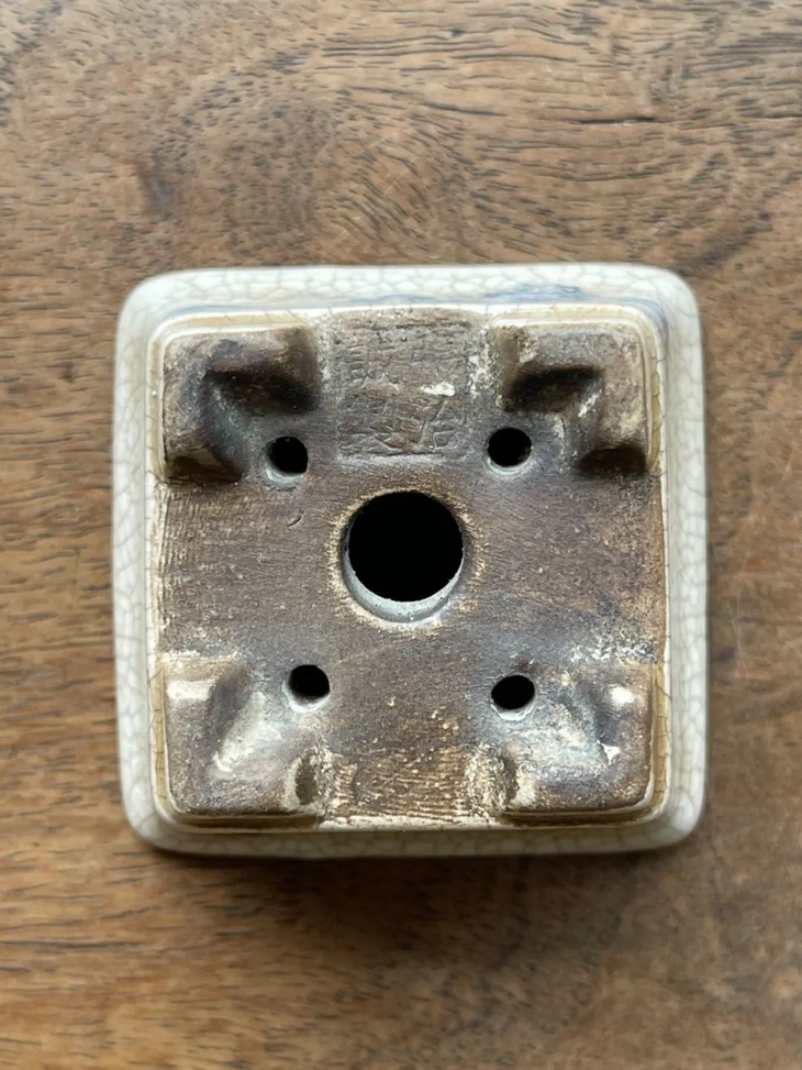 这是一件景德镇烧制的精緻开片瓷青花绘山水四方花盆,形式典雅简约的四方形撇口四足花盆,环绕四方外壁以青花料绘优雅山水风景图,全器覆盖生动细开片透明釉,器形稳重,四方花盆撇口上宽下窄四足,底部无釉钻一大四小排水孔,并刻四字方章款:“張弘誠製”,青花纹饰典雅高贵,细开片釉色温润柔美,掌中把玩尺寸,置于案头种植菖蒲或是养兰草,优雅大气,舒坦怡人。是解放前更早景德镇知名工坊烧制的高端文人书房美物。此开片瓷青花绘山水四方花盆,除正常使用之表面磨损与小磕伤外,全器包浆醇厚浓郁。尺寸:口沿长:5.6厘米,宽:5.6厘米,高:4.3厘米,底部长:3.8厘米,宽:3.8厘米,重量:82.3克。