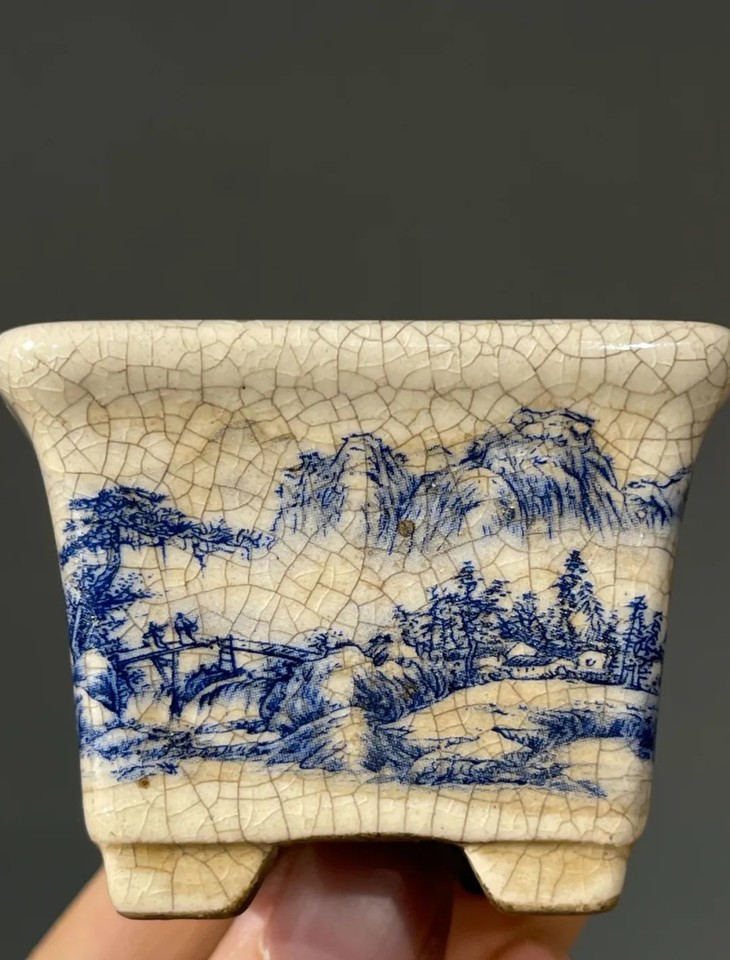 开片瓷青花绘山水四方花盆,顺丰包邮