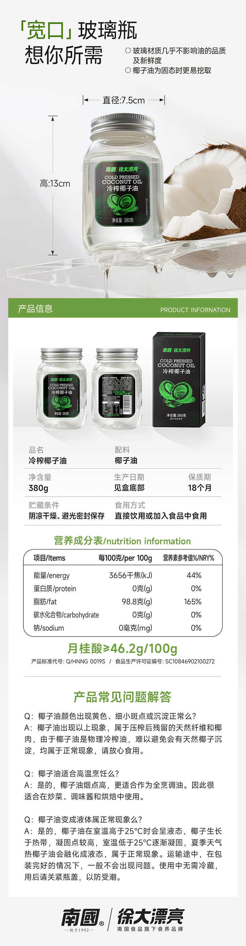 【品名】南国1号冷榨椰子油 【规格】380g/瓶 【保质期】18个月 【储存方法】请置于阴凉干燥处,避光密封保存 【食用方法】直接饮用或加入食品中食用,建议 每天摄取量在50g以内。 【产地】海南 【发货地】海南/广东/安徽 【发货快递】申通、圆通、韵达、邮政、极兔 【不发货区域】新疆,西藏,港澳台地区不发 【发货时效】48小时,节假日顺延 |