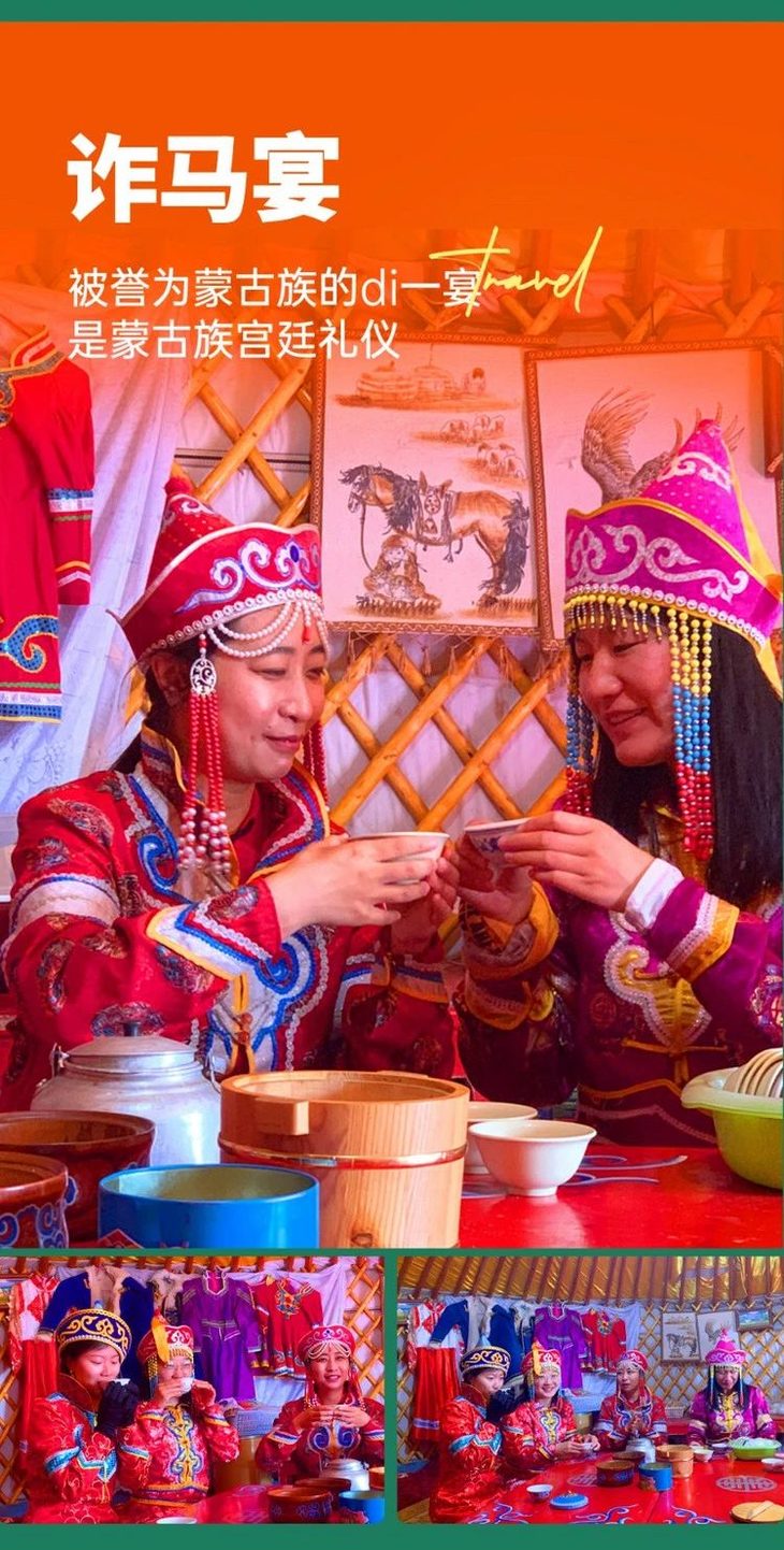 晚餐也可以自愿体验内蒙特色【诈马宴】,这是草原呈现的视觉上的盛宴和舌尖上的美味。诈马宴的规格相当高,宾客们必须换上华丽的质孙服及配饰参加,借此可体验一回做王爷王妃的尊贵。宴会上有烤全羊、牛排、蒙古点心、各类奶制品等配以奶酒,还可近距离聆听蒙古艺人的长调与呼麦,伴随马头琴一起舞蹈歌唱。