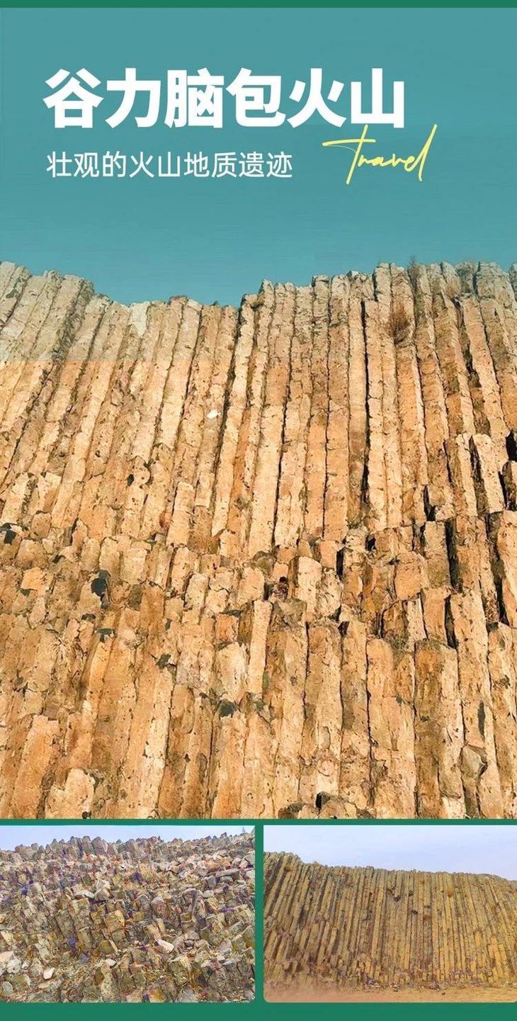 早餐过后,8:00出发前往【谷力脑包火山地质遗迹】(车程约35分钟,游玩约40分钟),这里是距今2500多万年火山喷发的熔岩冷却收缩形成的玄武岩六方柱状岩体。柱状岩体像地下长出来的石柱,整齐排列,在长日岁月里接受着风雨考验。