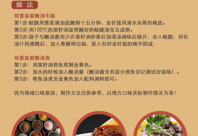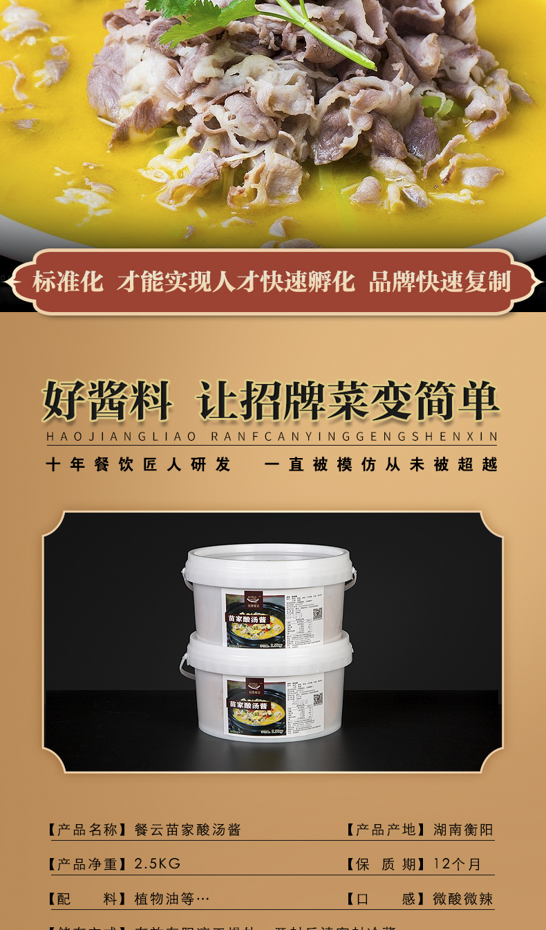 创意苗家酸汤酱,一份食材,一份酱,加水焖即成菜,标准化操作。酸汤肥牛,酸汤牛蛙,酸汤鱼,酸汤黄鸭叫,酸汤鸡蟹煲等菜品,正在为餐饮差异化爆品发力