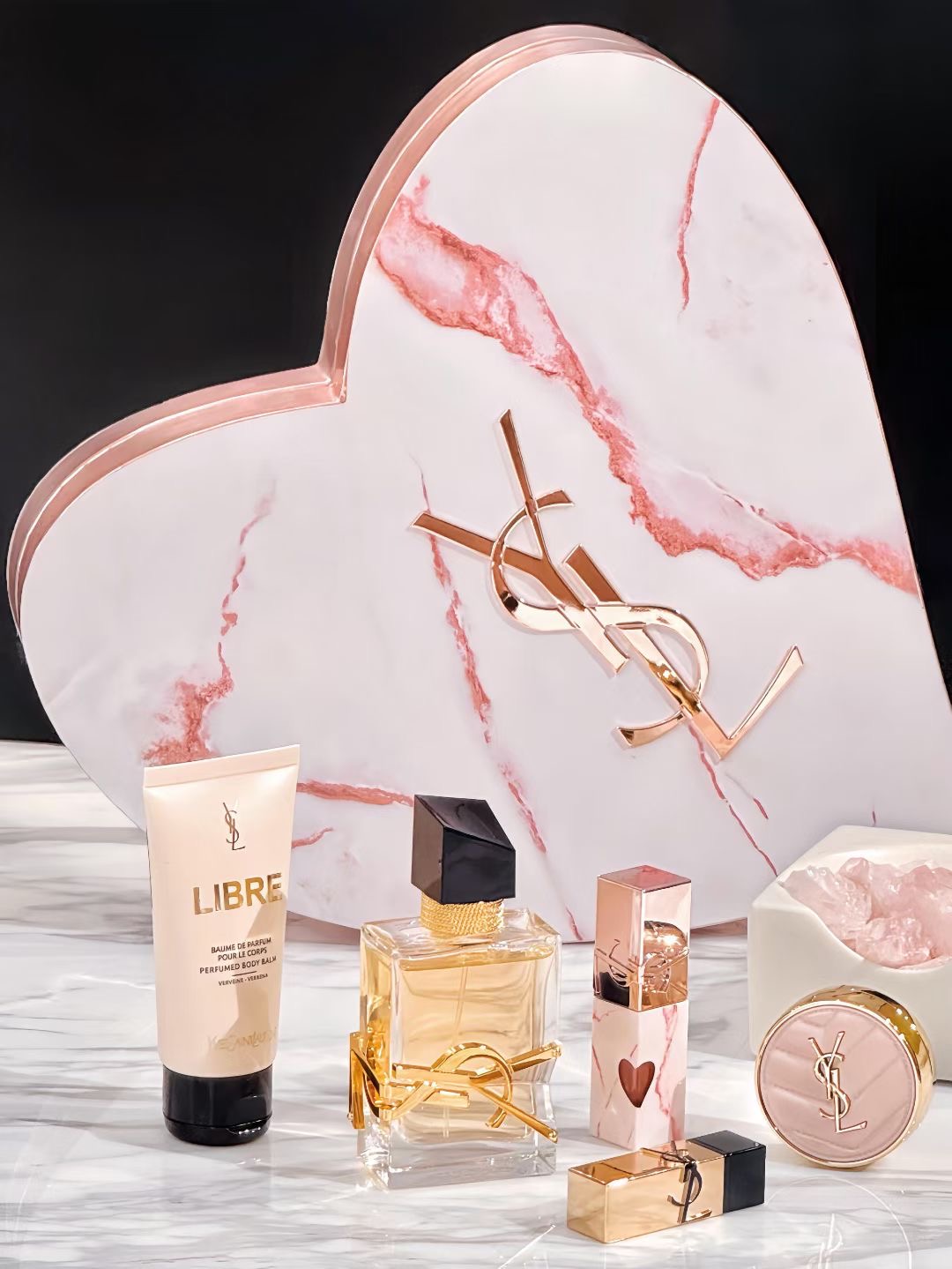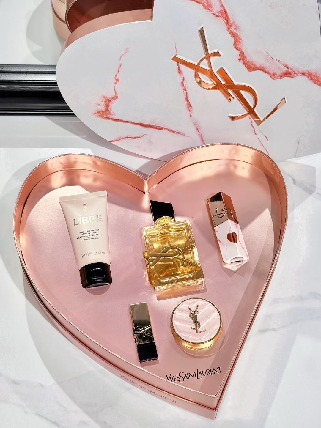 YSL七夕限定礼盒,包含正装50ml的自由之水香水+正装2.2g圣罗兰1966细管口红,赠品包含圣罗兰唇红口红1.3g+自由之水香氛身体乳50ml+圣罗兰明彩气垫粉粉底液20号色mini包装5g