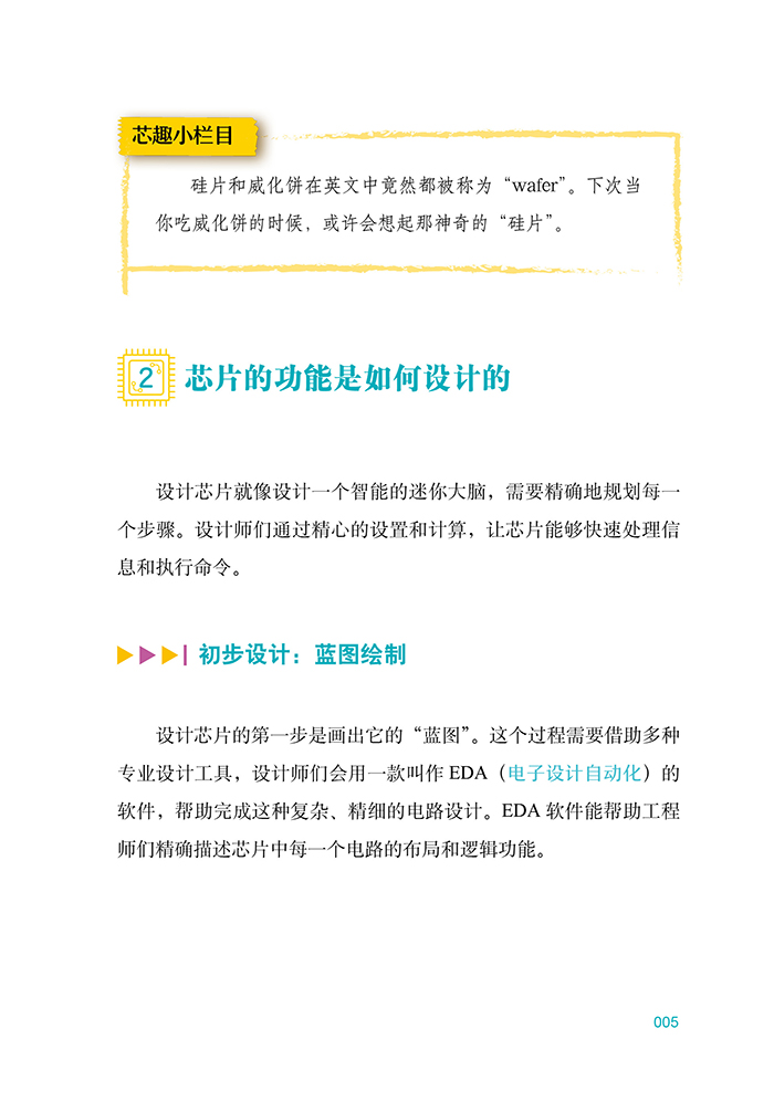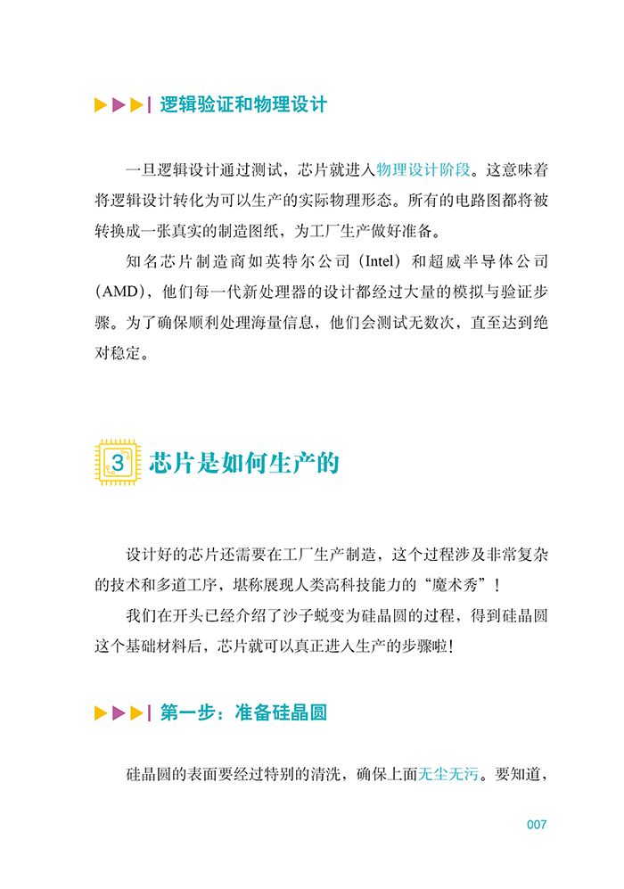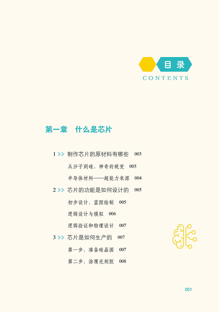 本书是一本面向青少年的科普读物,以生动有趣的语言,向孩子们介绍了神奇的芯片世界。从日常生活中无处不在的芯片出发,引导小读者们思考那些隐藏在各种设备中的高科技;大脑。书中不仅讲述了制作芯片的基础材料沙子是如何蜕变成硅晶圆,并进一步加工成复杂芯片的过程,还深入浅出地讲解了芯片的设计原理、生产步骤以及运作机制。
