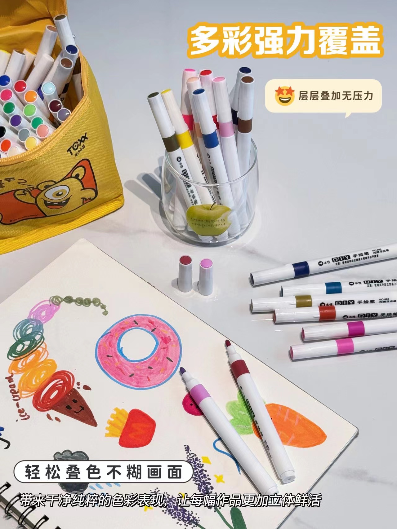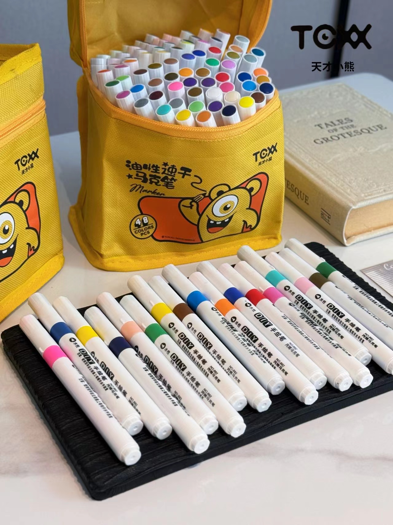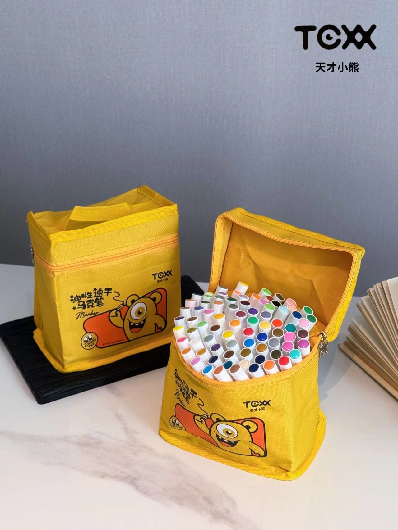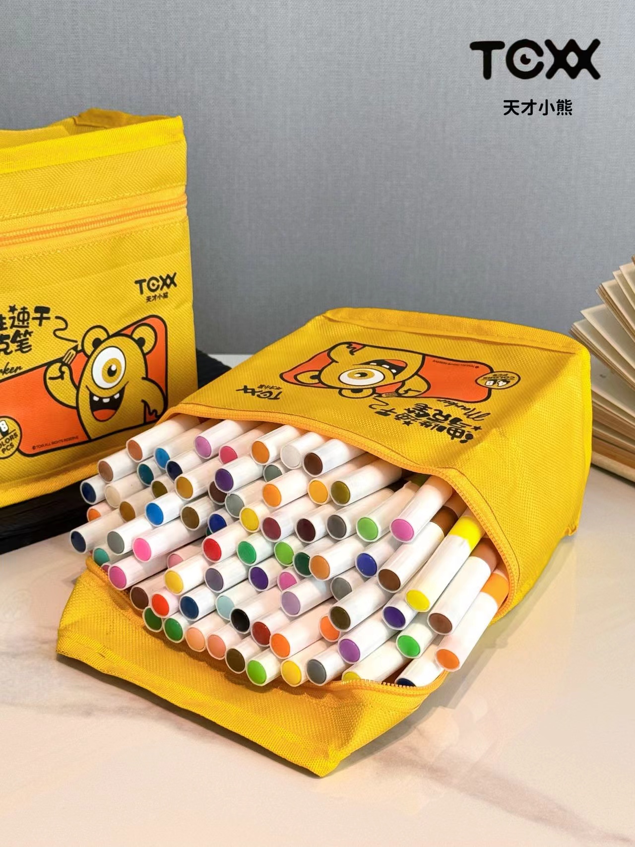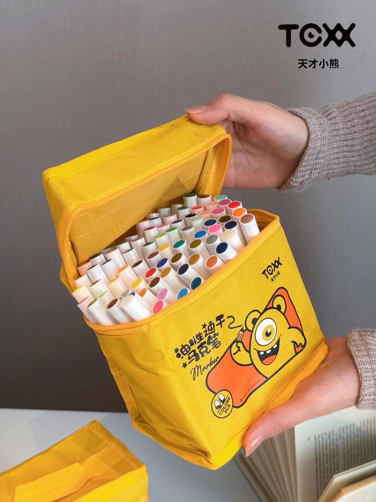 丙烯马克笔80色大笔 袋子上印错48色 实际是80色 建议勿拍 jing致可爱的天才小熊黄包外观,兼具童趣与羔级感 80支笔整齐排列,色号一目了然,随取随放,外包柔韧耐磨,轻巧便携,居家收纳或外出携带都方便 无论是上课带去美术教室 还是周末露营绘画,都能轻松携带 随时开启色彩之旅!