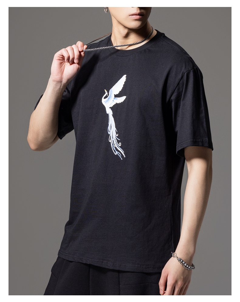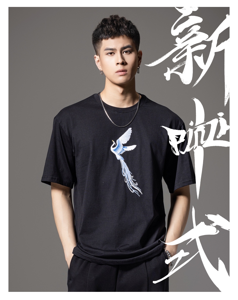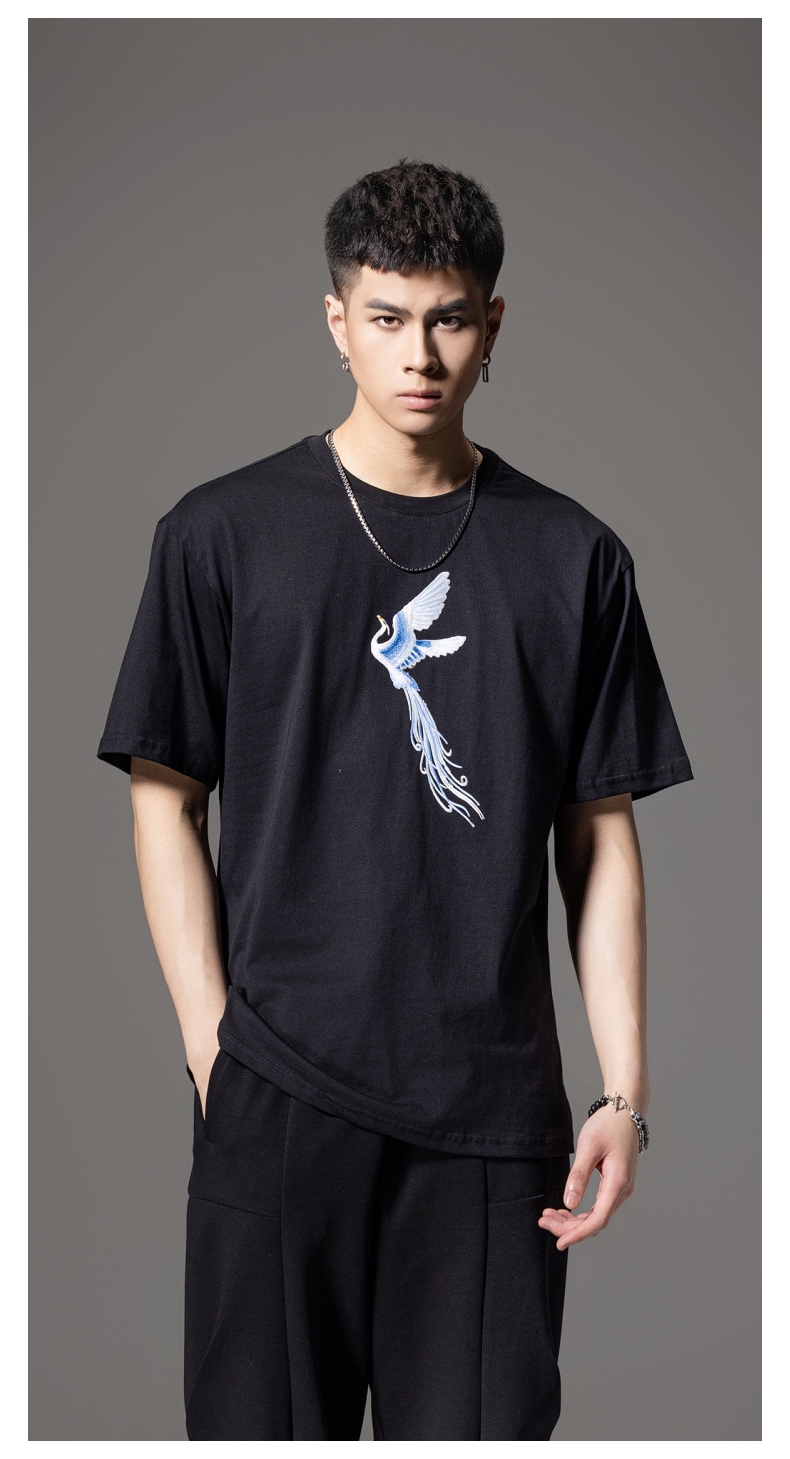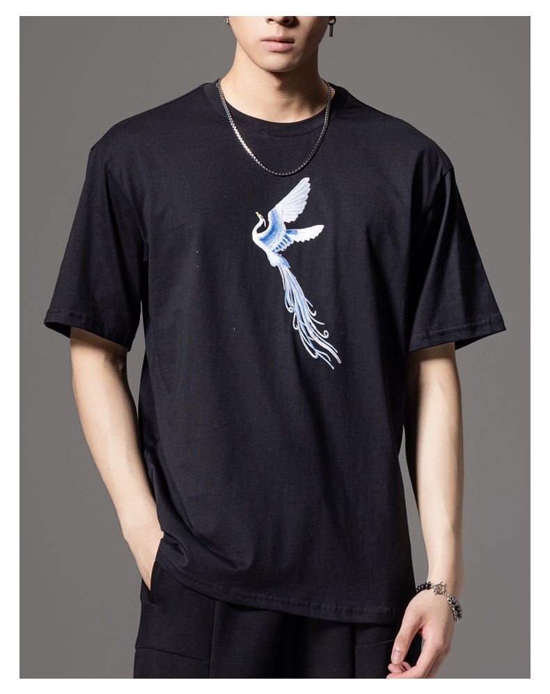 PINLI品立新中式2024夏季新款国潮飞鸟短袖T恤男士贴布绣休闲上衣BG242111058