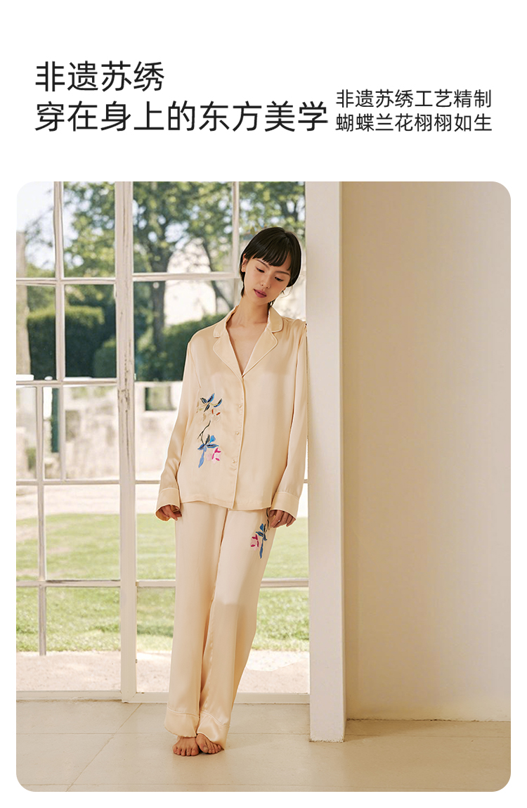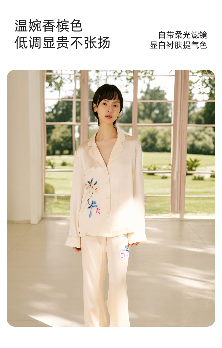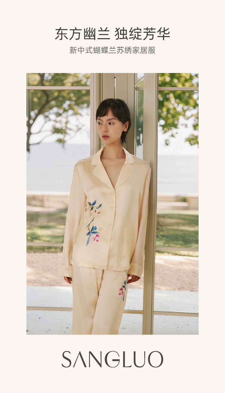 真丝睡衣刺绣套装SANGLUO桑罗印花长袖两件套家居服