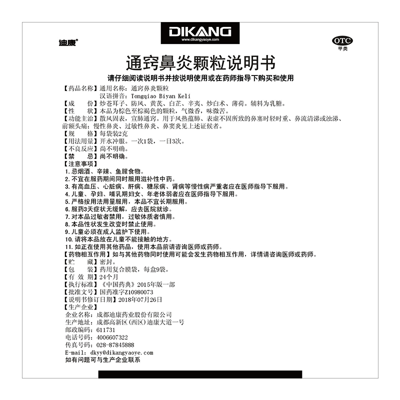 迪康 通窍鼻炎颗粒2g*9袋 鼻塞流涕慢性鼻炎过敏性鼻炎鼻窦炎头痛