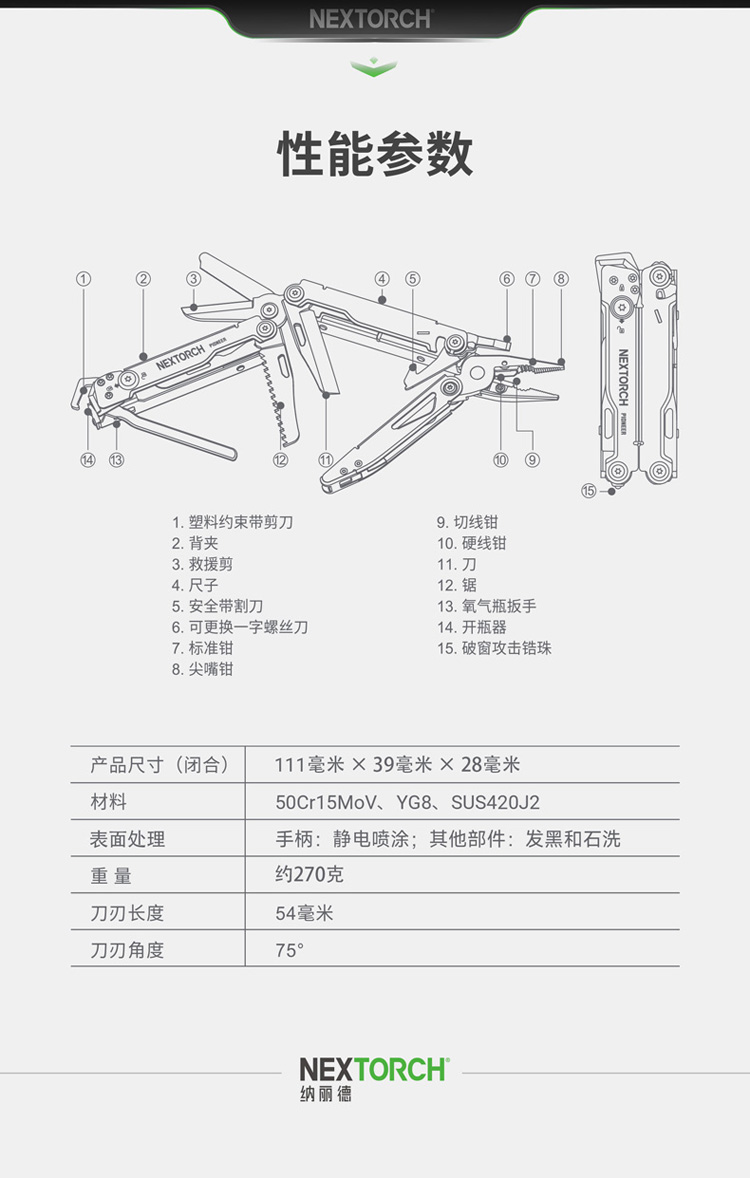 纳丽德(NEXTORCH)尖锋多功能工具钳银色黑色可选